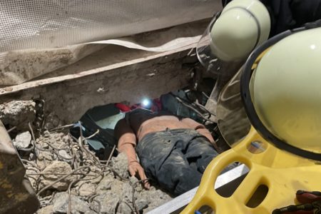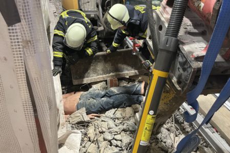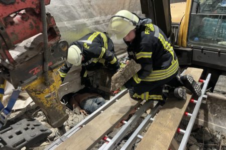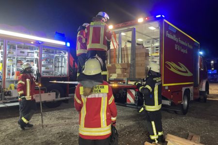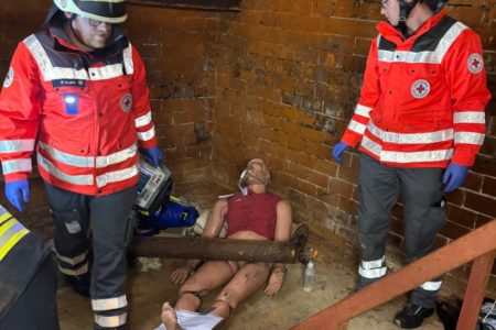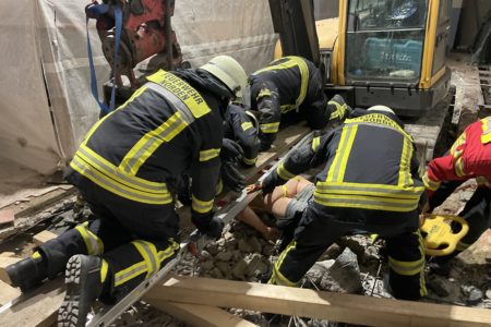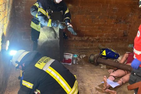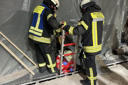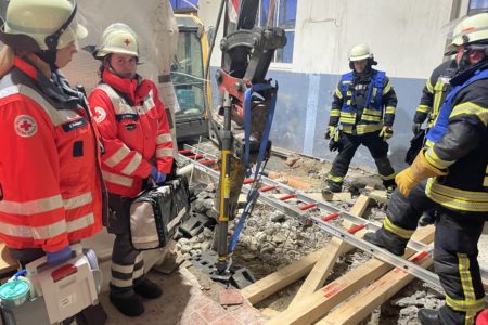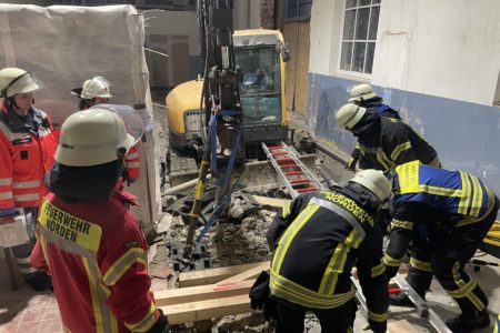 Die tatsächlich stattfinden Bauarbeiten gestalteten die Übungsvorbereitung ungewöhnlich dynamisch. Eigentlich sollte in einem Nebengebäude auch eine Rettung aus einer eingestürzten Grube geübt werden. Doch am Tag der Übung hatte ein Bagger die Grube beseitigt und den umliegenden Betonboden aufgebrochen. Kurzerhand musste das Szenario angepasst werden und so wurde ein durch eine Betondecke gestürzter Bagger mit einer verschütteten Person angenommen. Die Lage hatte es besonders in sich, da für die Einsatzkräfte überhaupt nicht klar war, wie stabil das Bauwerk überhaupt noch war. Sorgfältige Erkundung war hier von den Führungskräften gefragt. Während die Feuerwehrleute begannen den Bagger gegen weitere Bewegung zu sichern und einen ersten Zugang zu dem Verschütteten zu schaffen, stiegen Sanitäter des DRK über eine Leiter in einen Kellerschacht hinab und mühten sich mit ihrer medizinischen Ausrüstung durch den niedrigen und schmalen Keller bis hin zum Patienten. Als die medizinische Erstversorgung sichergestellt war, konnte die Übungspuppe von den schweren Trümmern befreit werden. Den beteiligten Helfern war sehr deutlich anzusehen, dass diese Aufgabe schweißtreibend war.