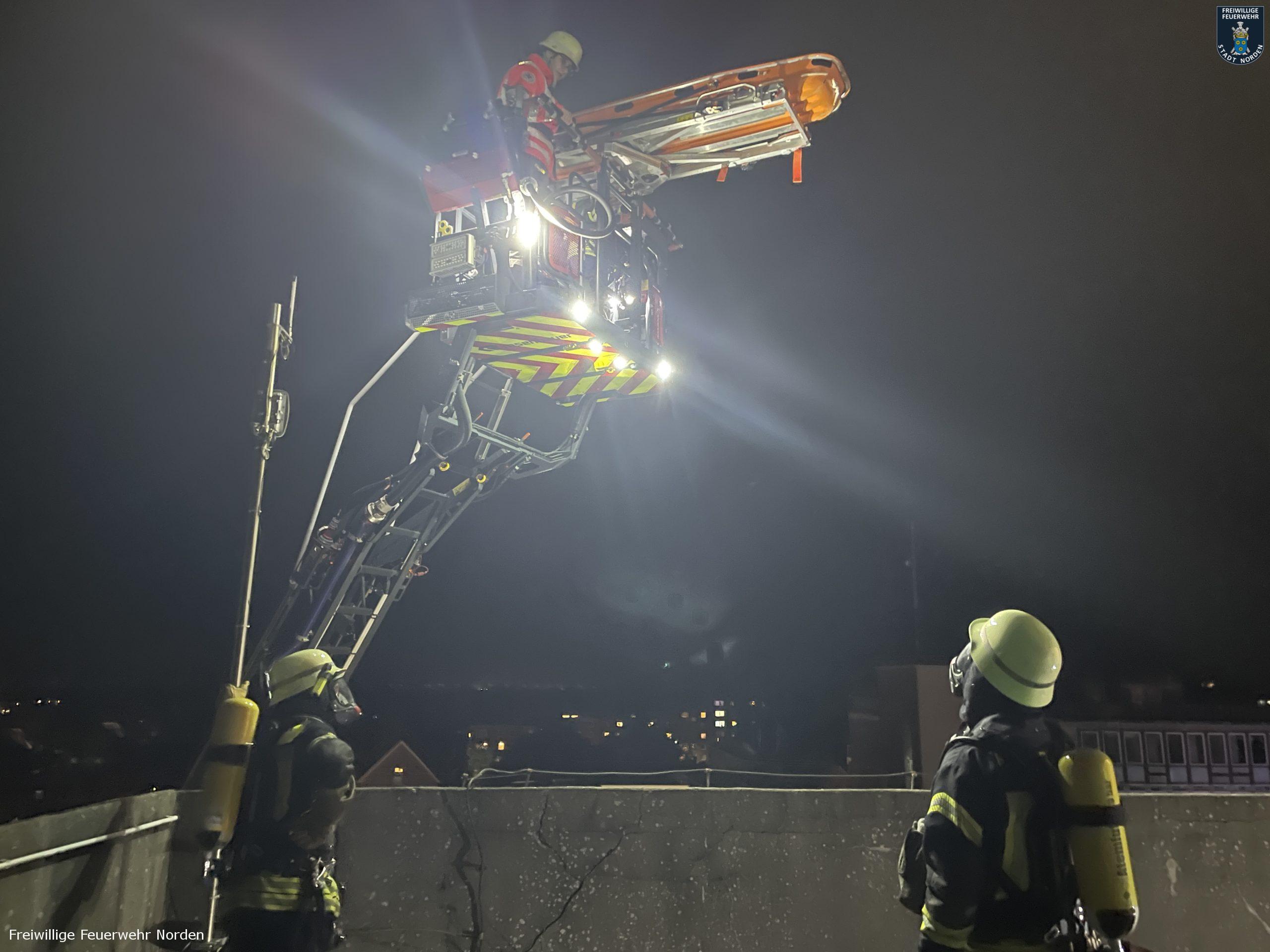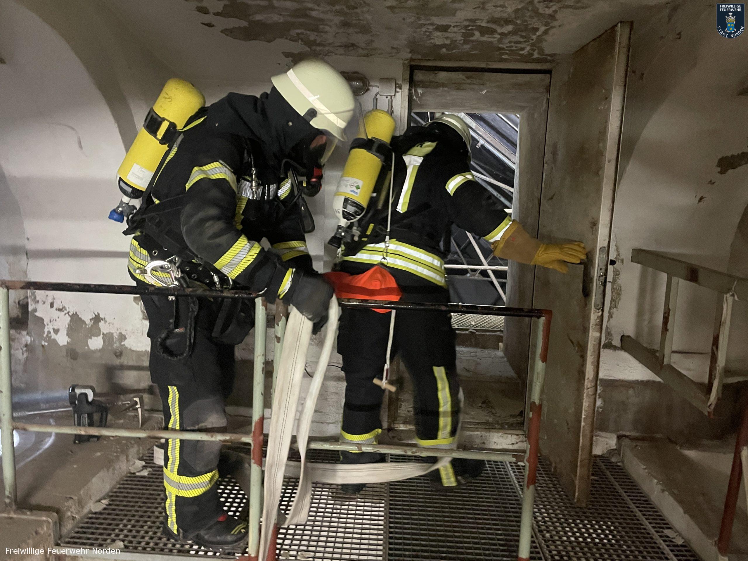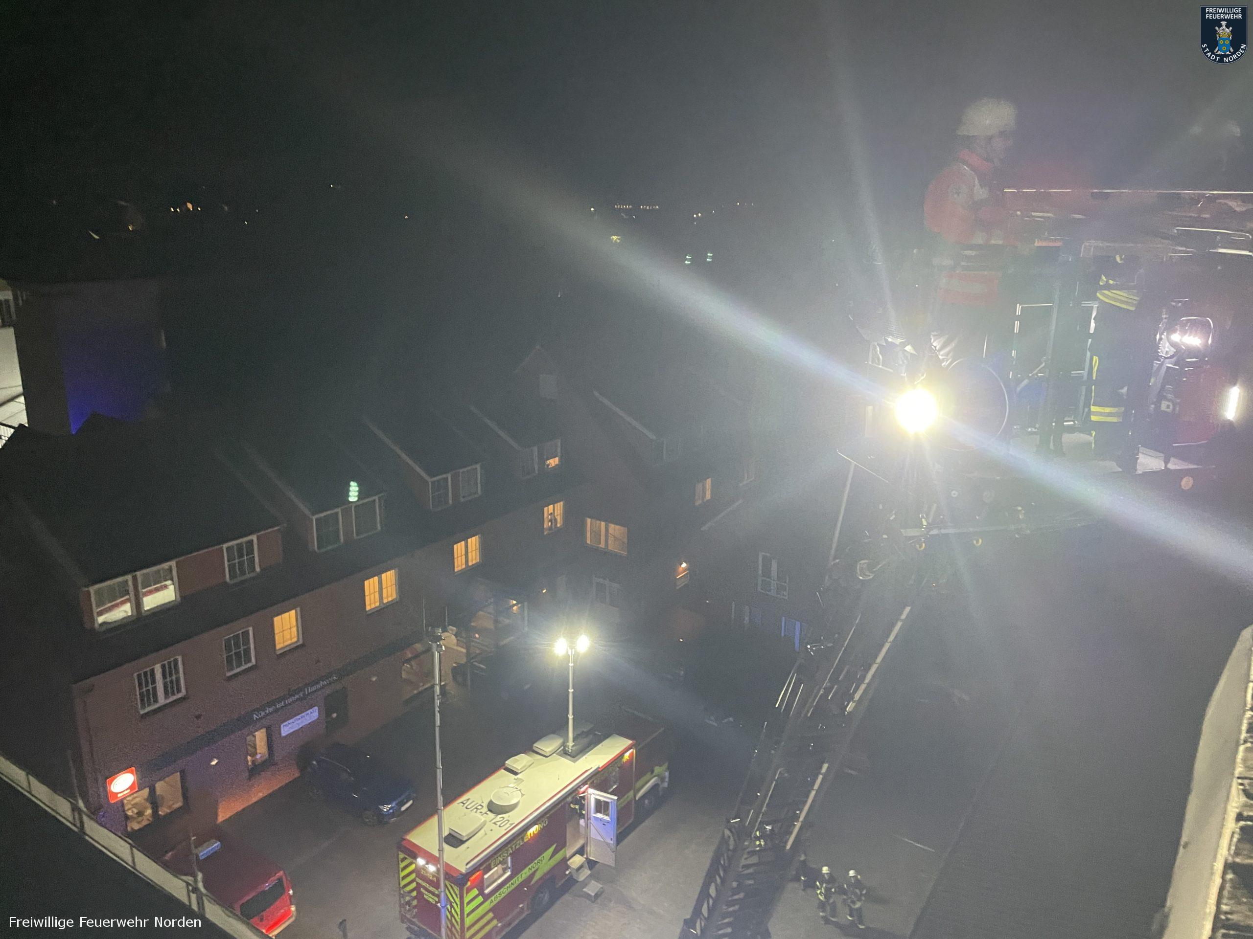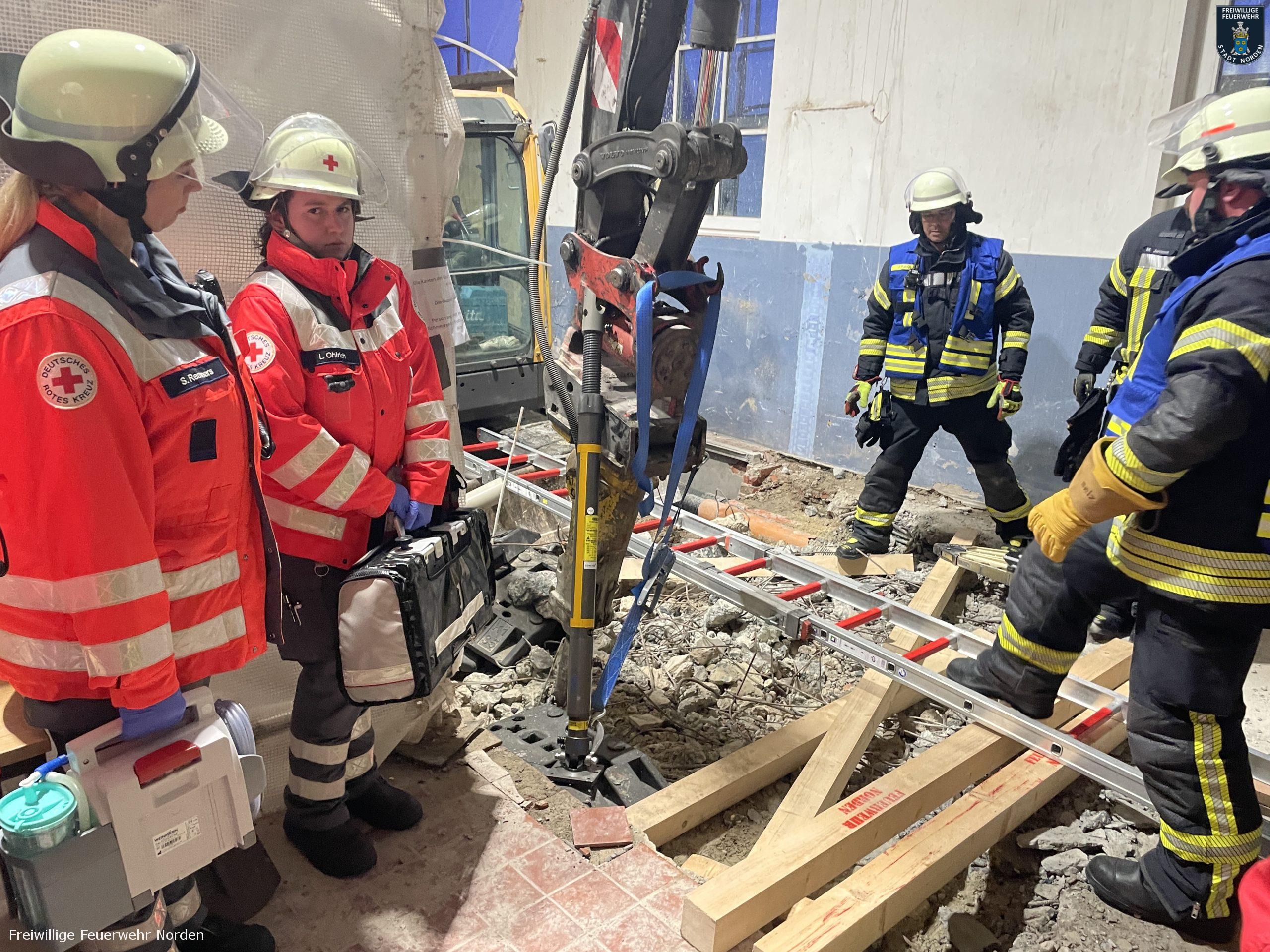 In dem Gebäude waren Rauch und Feuerschein sichtbar und vom Dach laute Hilfeschreie zu hören. Für die Norder Feuerwehr wird aufgrund der komplexen Lage Vollalarm ausgelöst und auch der Einsatzzug Nord des Deutschen Roten Kreuzes (DRK) angefordert. So werden an dem Abend 120 Einsatzkräfte an der Übung beteiligt. Atemschutzgeräteträger dringen als erstes in das Gebäude vor und bahnen sich den Weg. Trümmer erschweren das Vorgehen. Parallel geht die Drehleiter in der Doorntkaatlohne in Stellung und wird zur Rettung von drei Personen aus zirka 20 Metern Höhe eingesetzt.