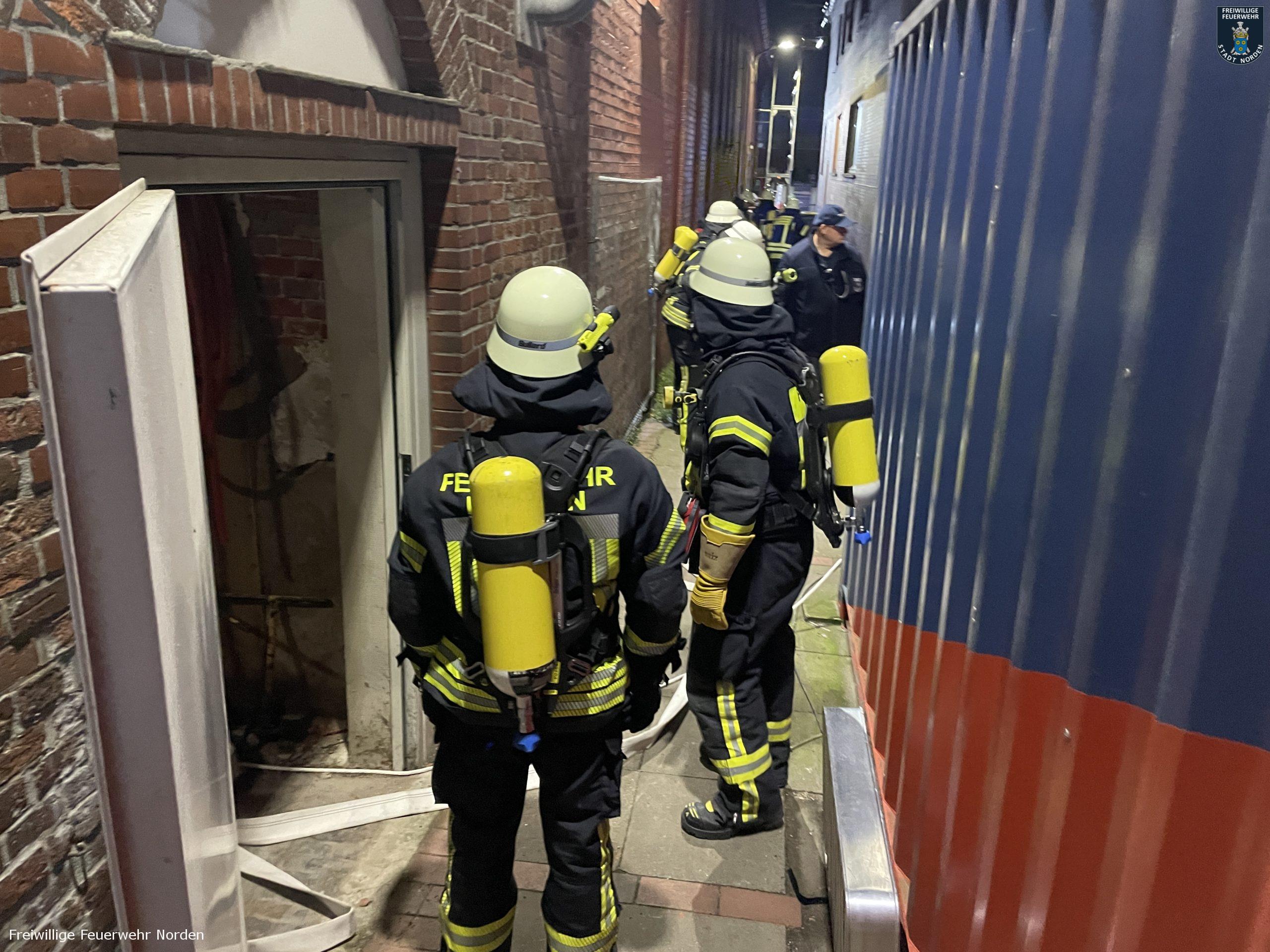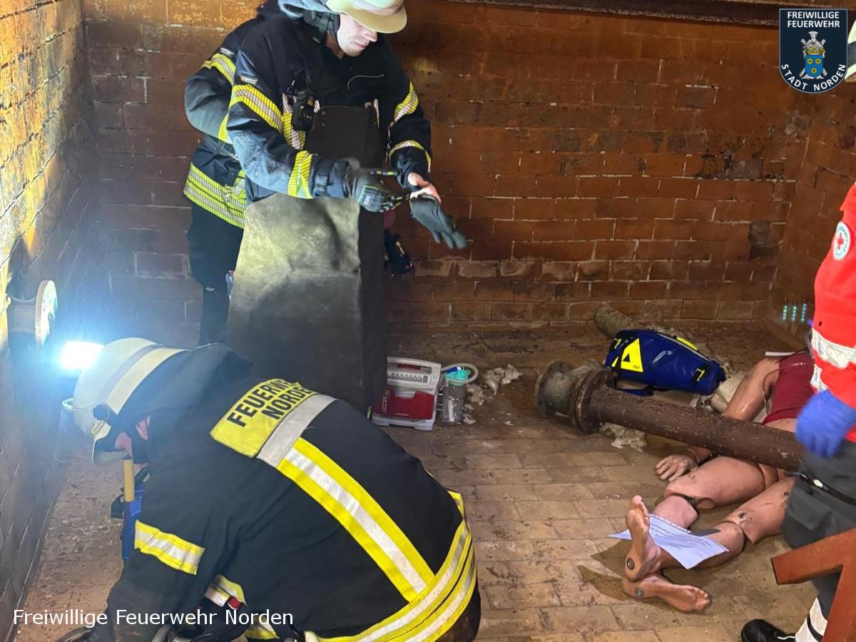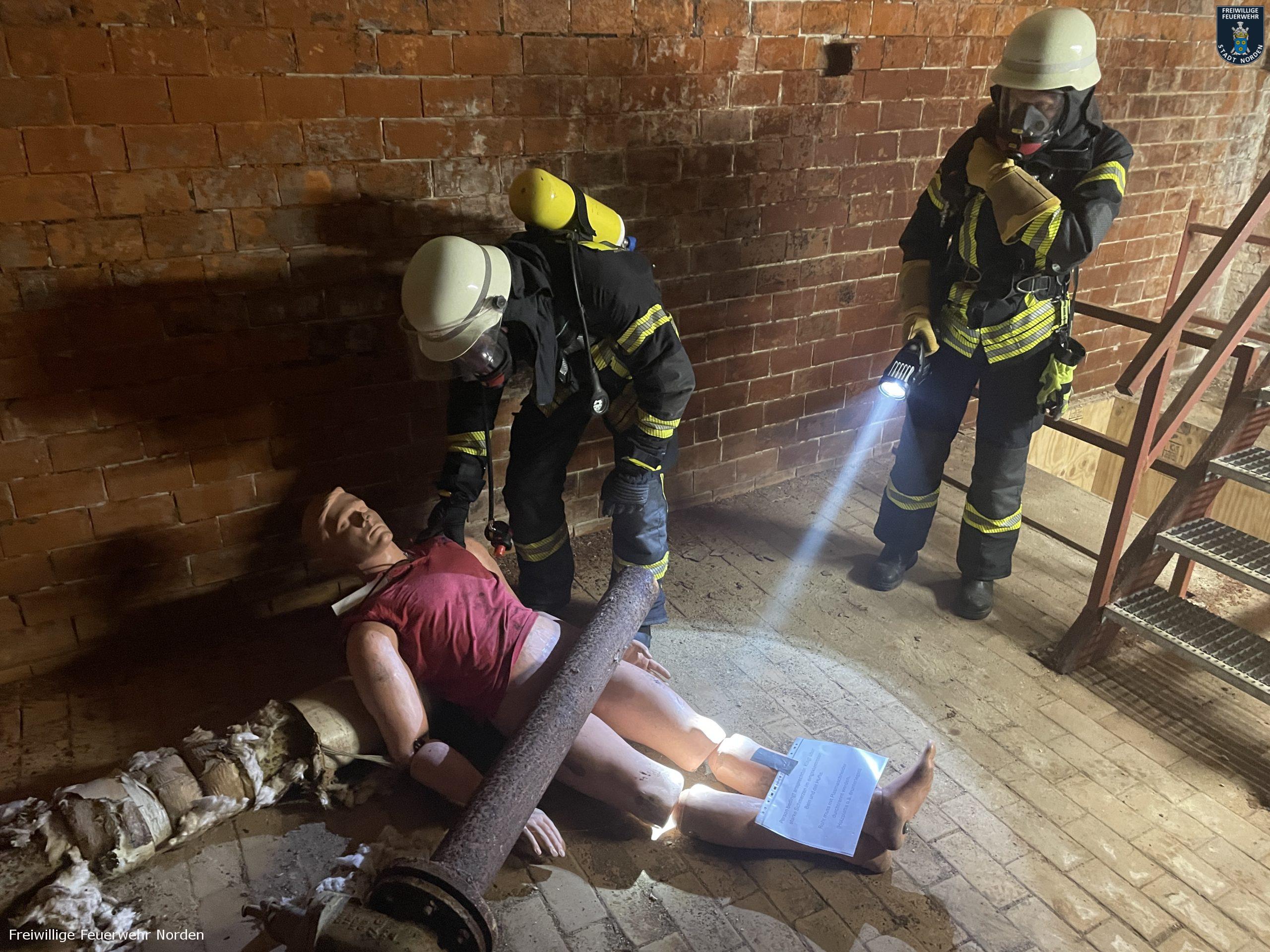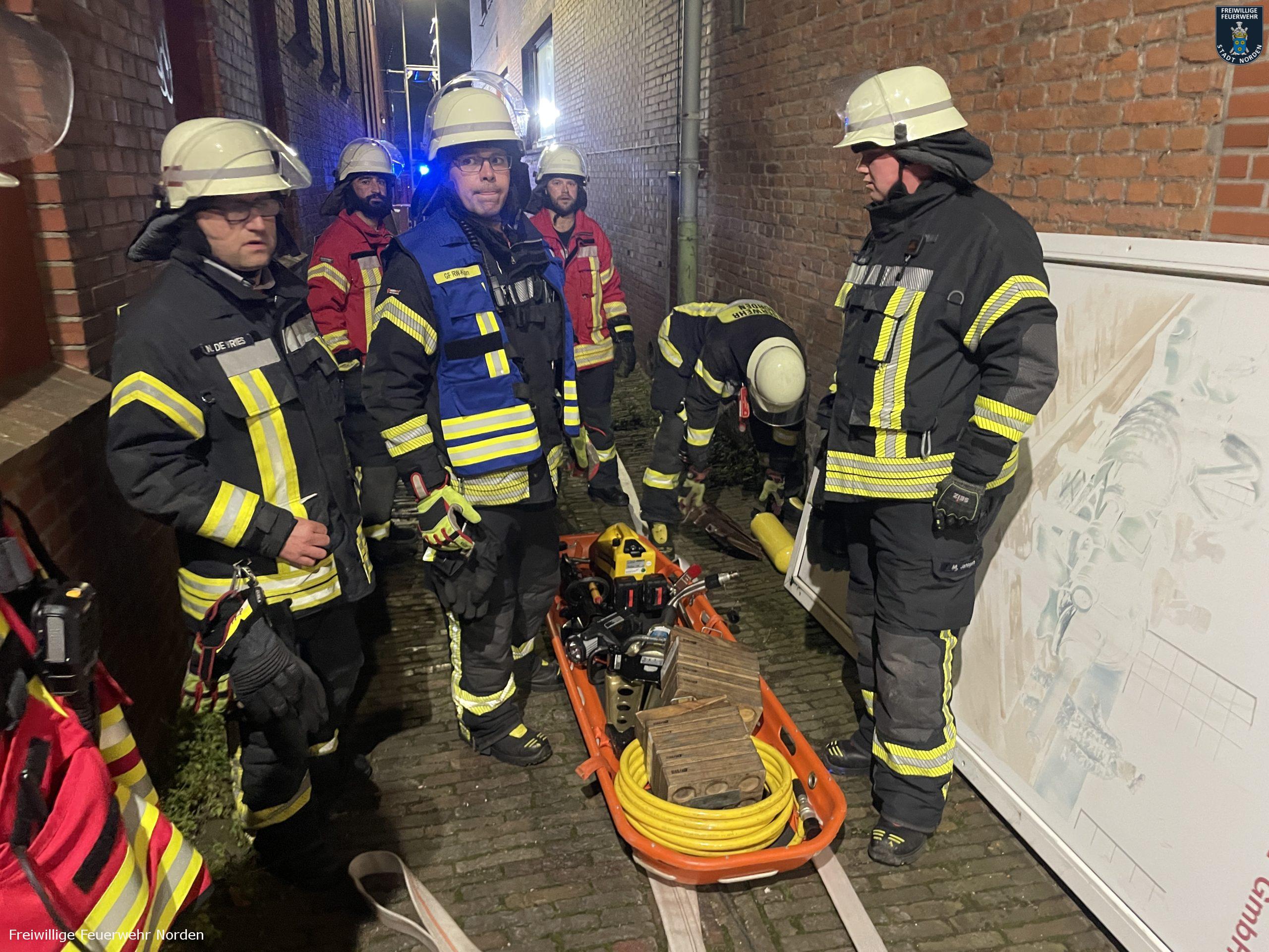 In dem Gebäude waren Rauch und Feuerschein sichtbar und vom Dach laute Hilfeschreie zu hören. Für die Norder Feuerwehr wird aufgrund der komplexen Lage Vollalarm ausgelöst und auch der Einsatzzug Nord des Deutschen Roten Kreuzes (DRK) angefordert. So werden an dem Abend 120 Einsatzkräfte an der Übung beteiligt. Atemschutzgeräteträger dringen als erstes in das Gebäude vor und bahnen sich den Weg. Trümmer erschweren das Vorgehen. Parallel geht die Drehleiter in der Doorntkaatlohne in Stellung und wird zur Rettung von drei Personen aus zirka 20 Metern Höhe eingesetzt.
