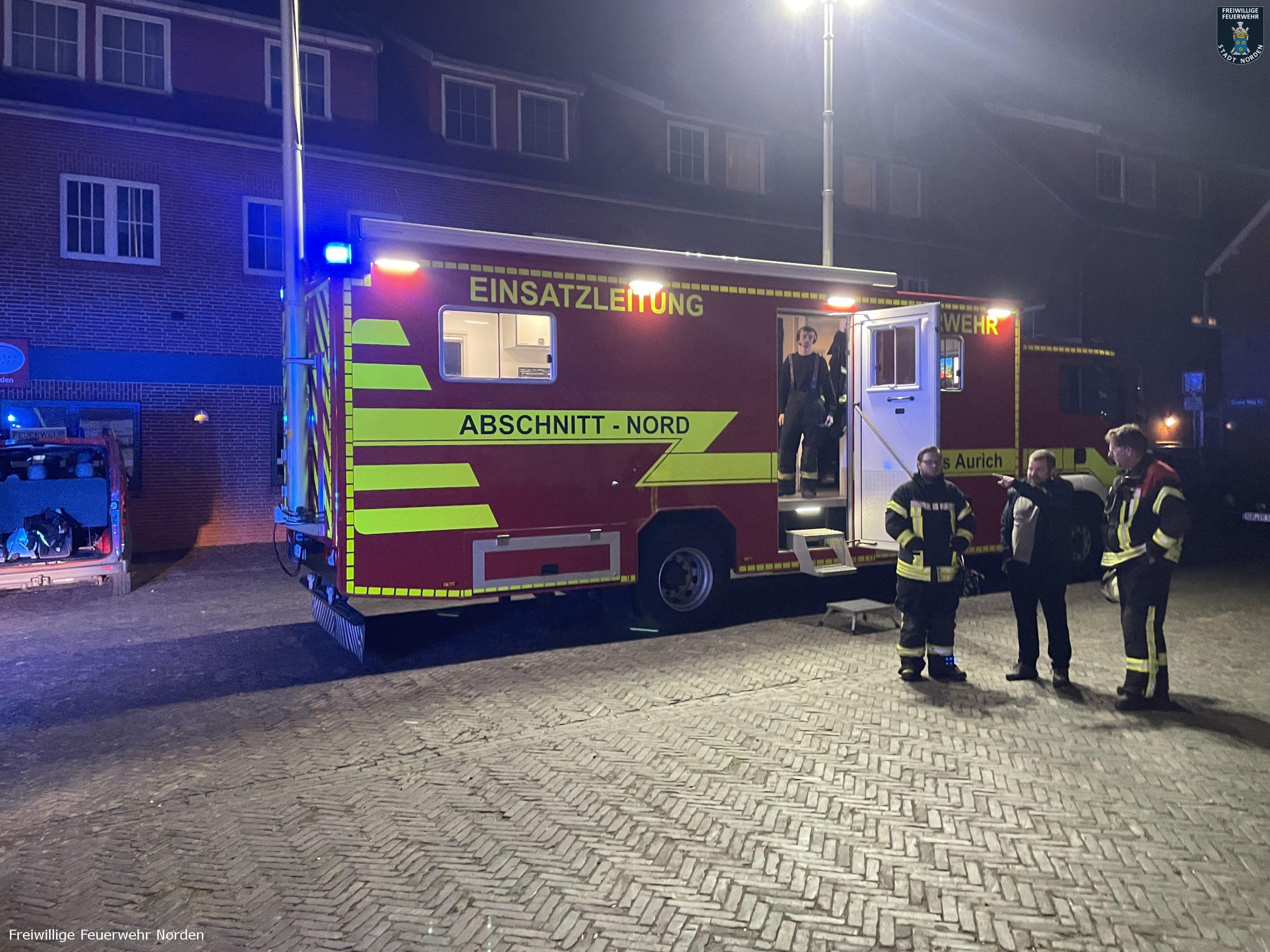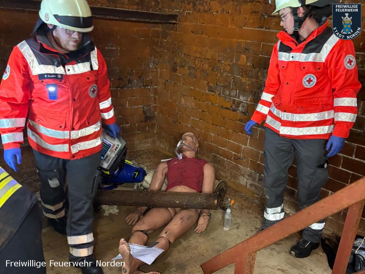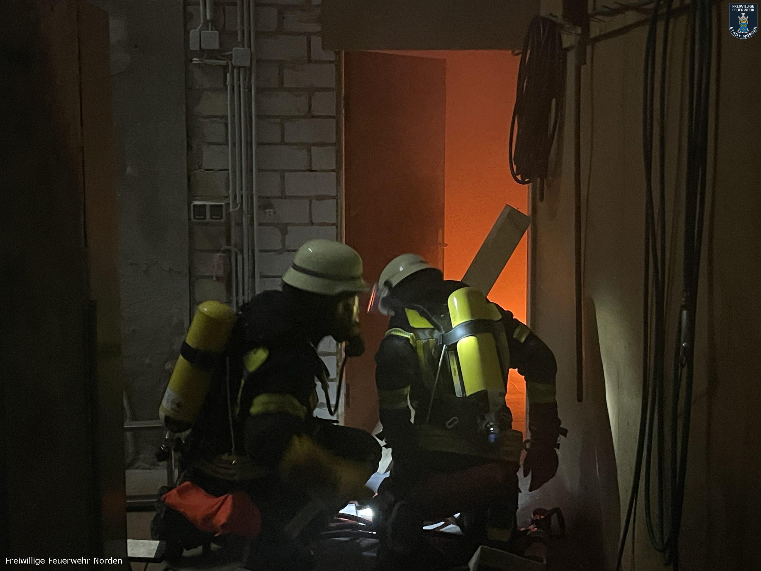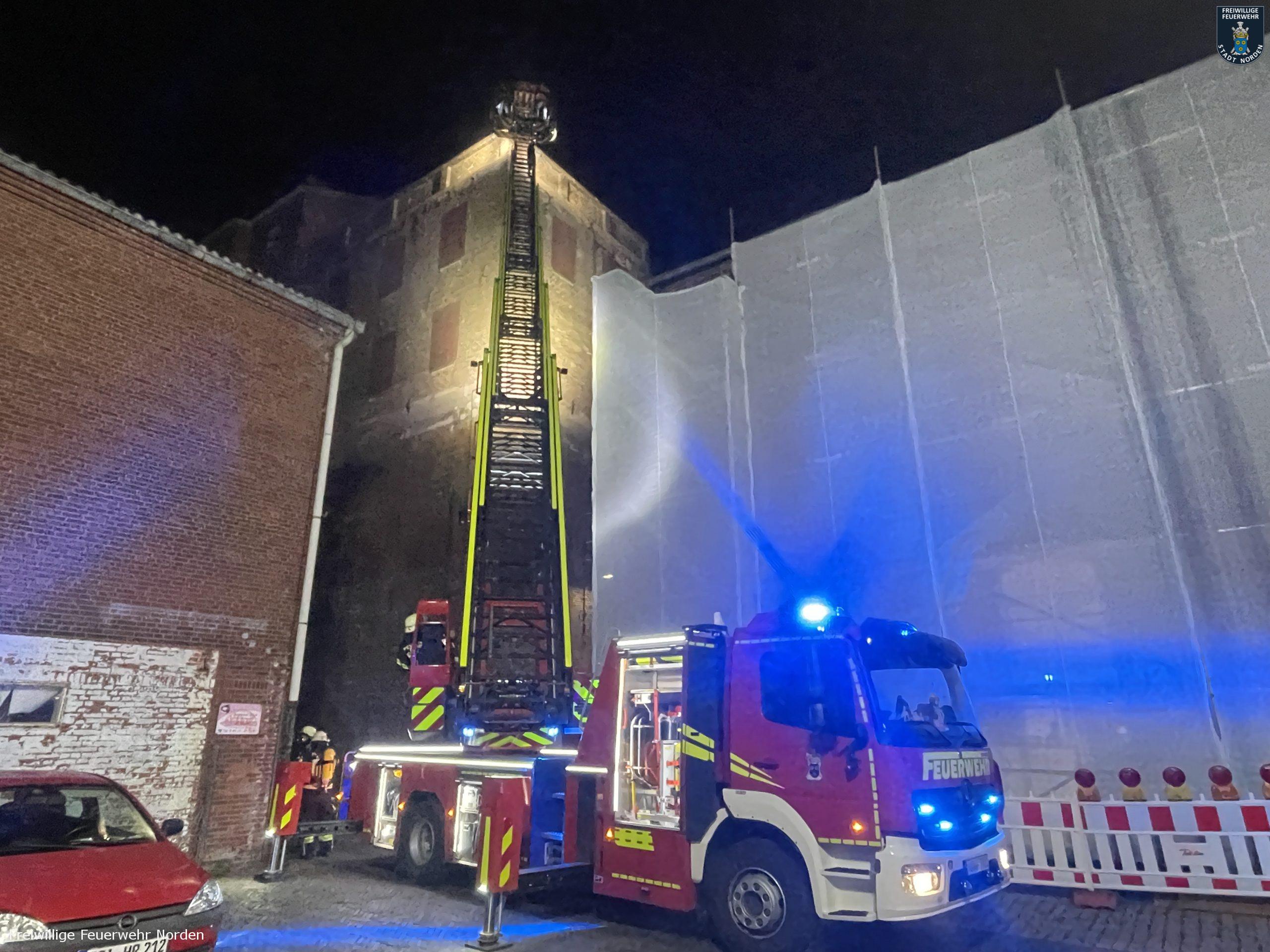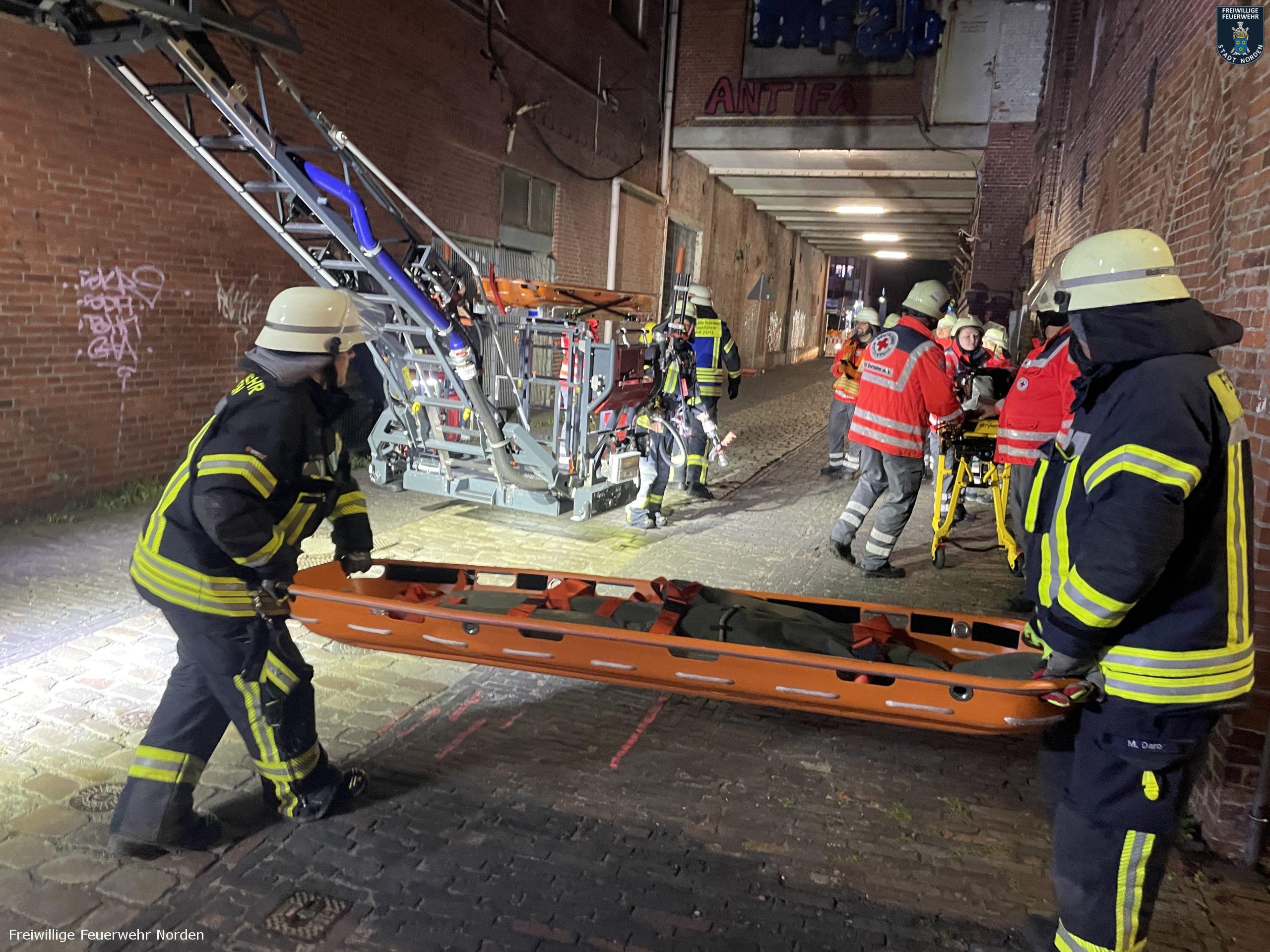 In dem Gebäude waren Rauch und Feuerschein sichtbar und vom Dach laute Hilfeschreie zu hören. Für die Norder Feuerwehr wird aufgrund der komplexen Lage Vollalarm ausgelöst und auch der Einsatzzug Nord des Deutschen Roten Kreuzes (DRK) angefordert. So werden an dem Abend 120 Einsatzkräfte an der Übung beteiligt. Atemschutzgeräteträger dringen als erstes in das Gebäude vor und bahnen sich den Weg. Trümmer erschweren das Vorgehen. Parallel geht die Drehleiter in der Doorntkaatlohne in Stellung und wird zur Rettung von drei Personen aus zirka 20 Metern Höhe eingesetzt.