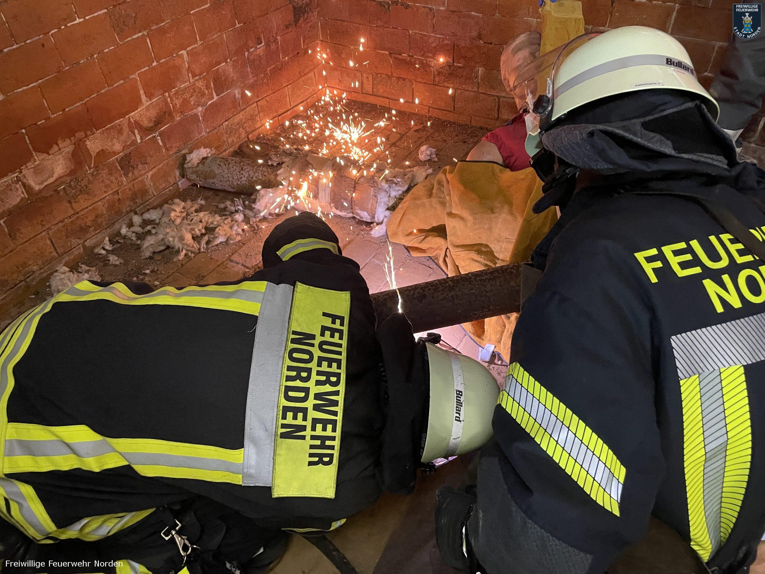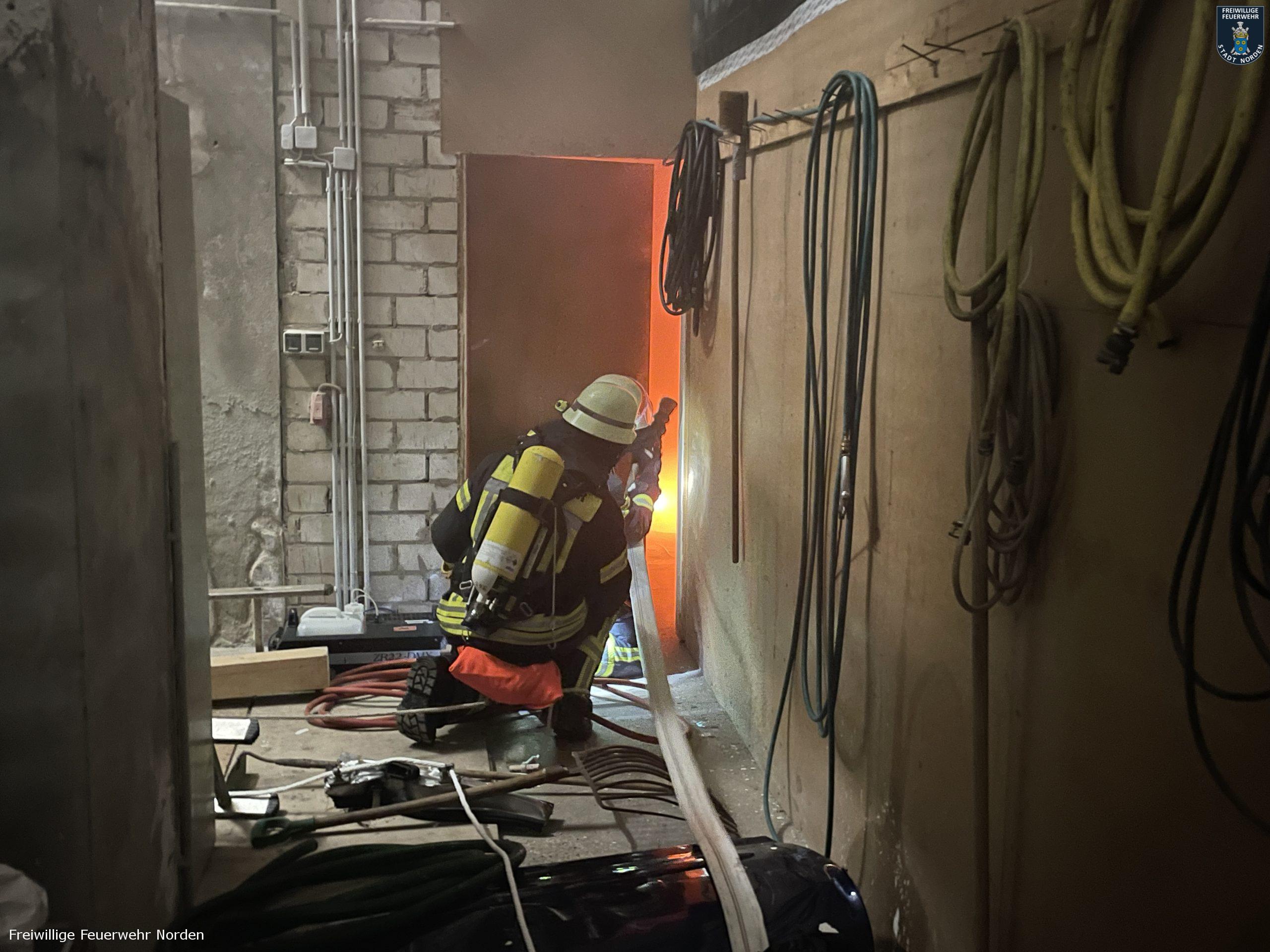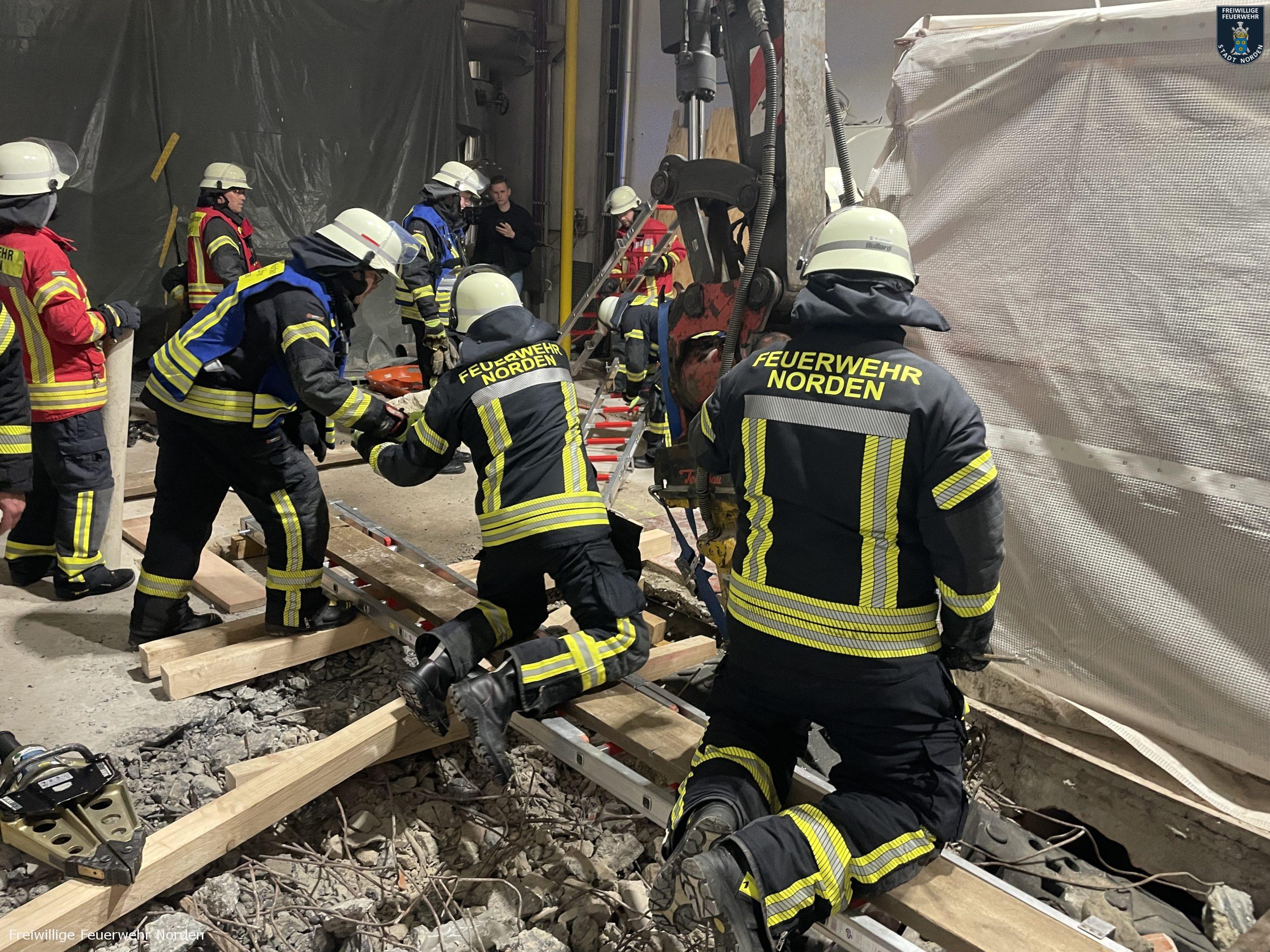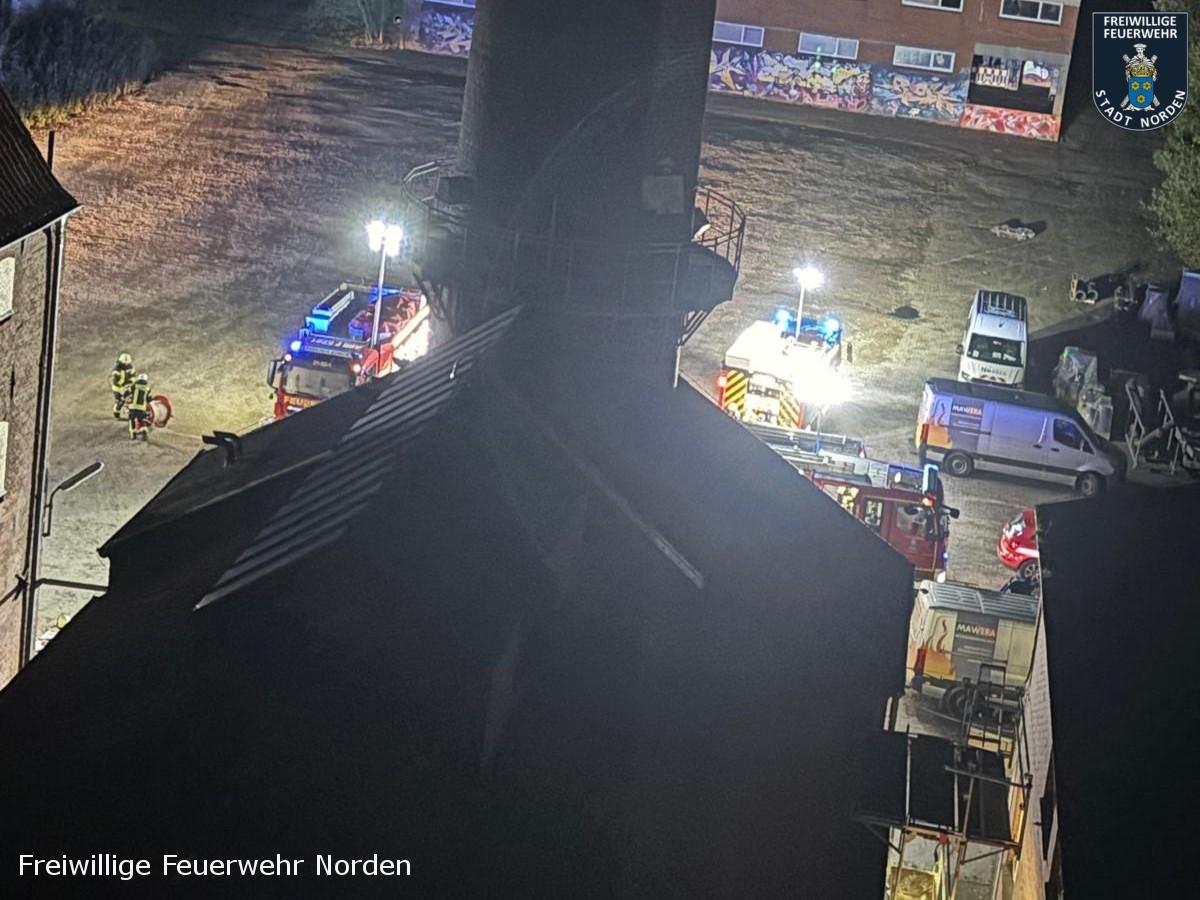 In dem Gebäude waren Rauch und Feuerschein sichtbar und vom Dach laute Hilfeschreie zu hören. Für die Norder Feuerwehr wird aufgrund der komplexen Lage Vollalarm ausgelöst und auch der Einsatzzug Nord des Deutschen Roten Kreuzes (DRK) angefordert. So werden an dem Abend 120 Einsatzkräfte an der Übung beteiligt. Atemschutzgeräteträger dringen als erstes in das Gebäude vor und bahnen sich den Weg. Trümmer erschweren das Vorgehen. Parallel geht die Drehleiter in der Doorntkaatlohne in Stellung und wird zur Rettung von drei Personen aus zirka 20 Metern Höhe eingesetzt.
