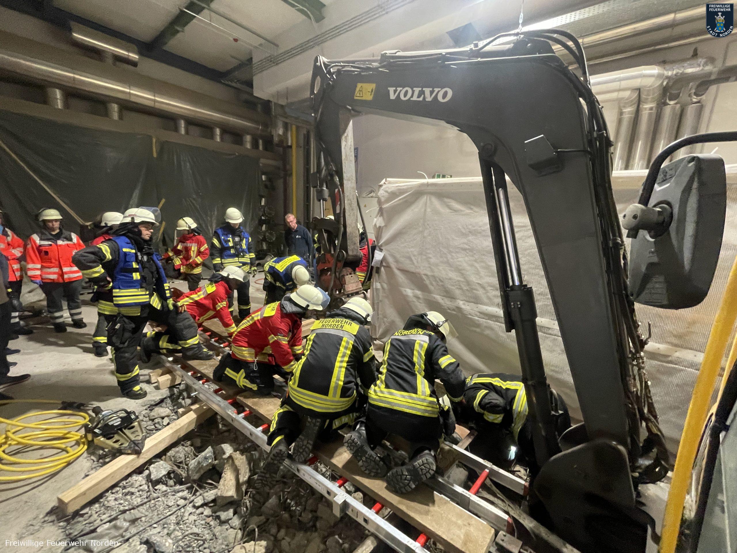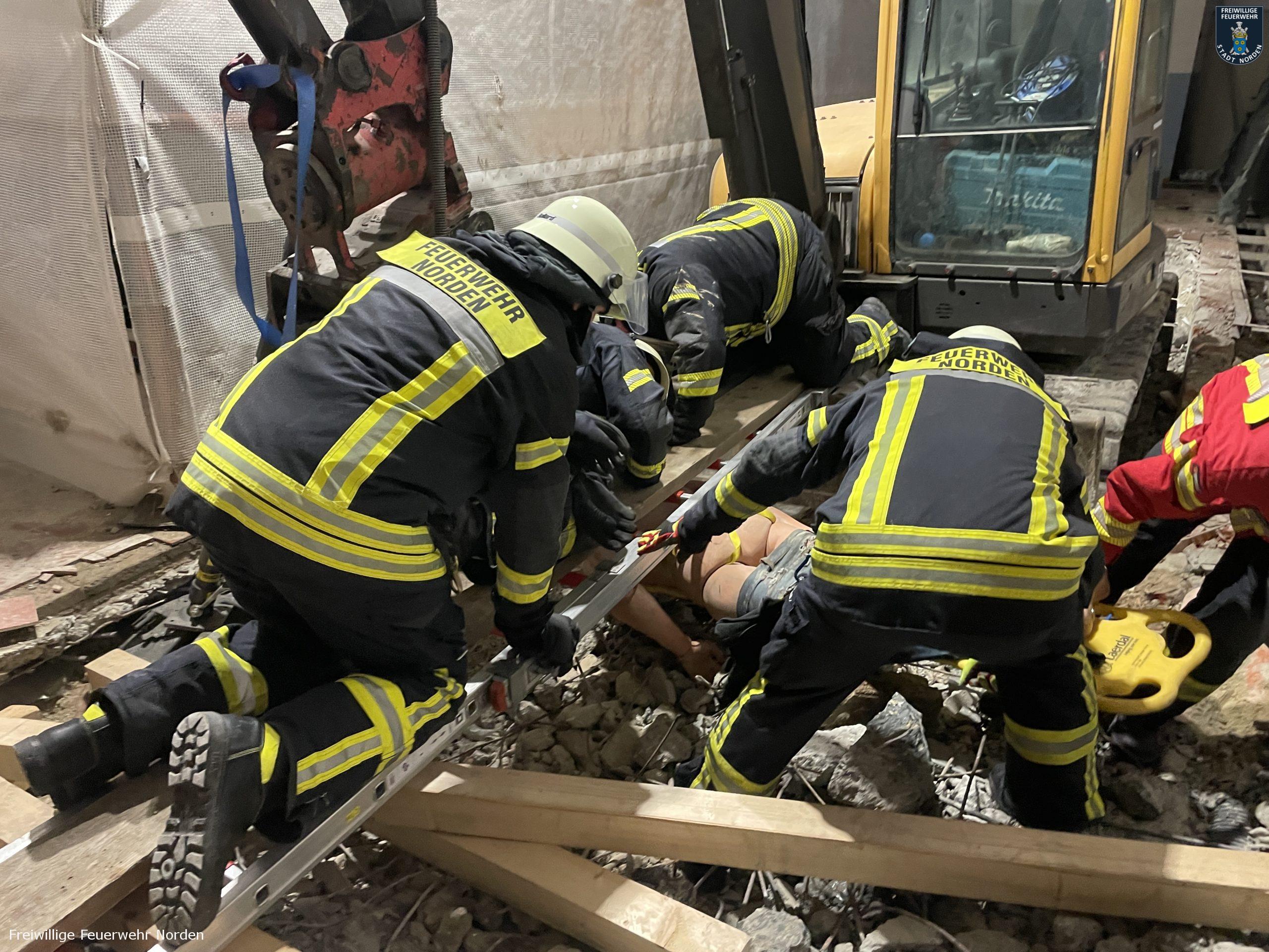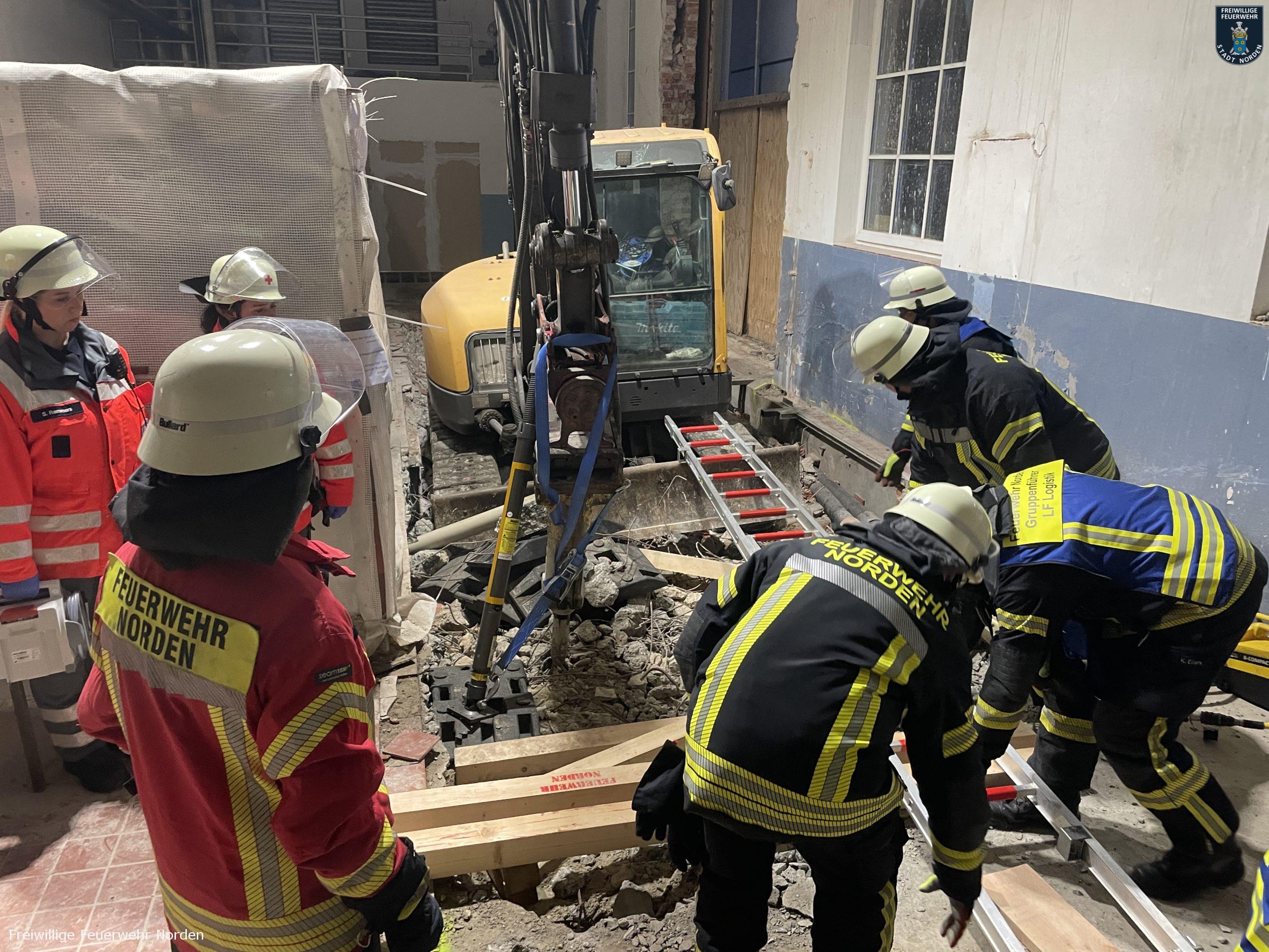 Die tatsächlich stattfinden Bauarbeiten gestalteten die Übungsvorbereitung ungewöhnlich dynamisch. Eigentlich sollte in einem Nebengebäude auch eine Rettung aus einer eingestürzten Grube geübt werden. Doch am Tag der Übung hatte ein Bagger die Grube beseitigt und den umliegenden Betonboden aufgebrochen. Kurzerhand musste das Szenario angepasst werden und so wurde ein durch eine Betondecke gestürzter Bagger mit einer verschütteten Person angenommen. Die Lage hatte es besonders in sich, da für die Einsatzkräfte überhaupt nicht klar war, wie stabil das Bauwerk überhaupt noch war. Sorgfältige Erkundung war hier von den Führungskräften gefragt. Während die Feuerwehrleute begannen den Bagger gegen weitere Bewegung zu sichern und einen ersten Zugang zu dem Verschütteten zu schaffen, stiegen Sanitäter des DRK über eine Leiter in einen Kellerschacht hinab und mühten sich mit ihrer medizinischen Ausrüstung durch den niedrigen und schmalen Keller bis hin zum Patienten. Als die medizinische Erstversorgung sichergestellt war, konnte die Übungspuppe von den schweren Trümmern befreit werden. Den beteiligten Helfern war sehr deutlich anzusehen, dass diese Aufgabe schweißtreibend war.