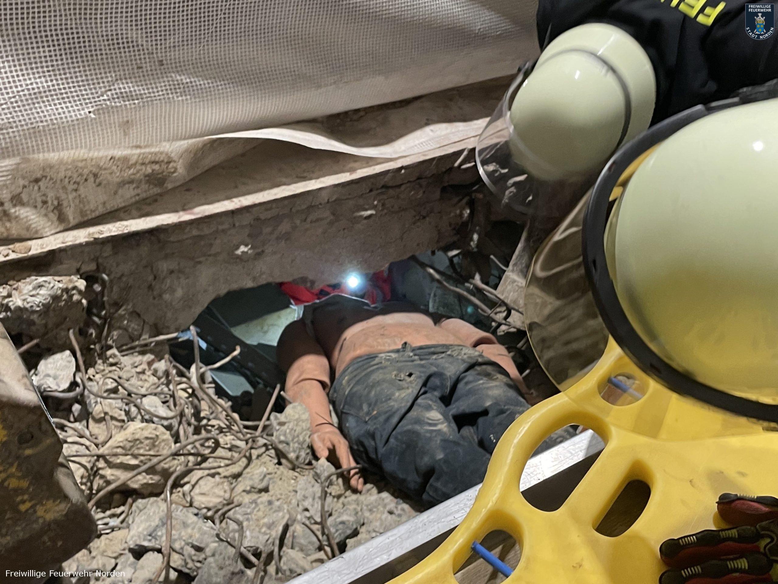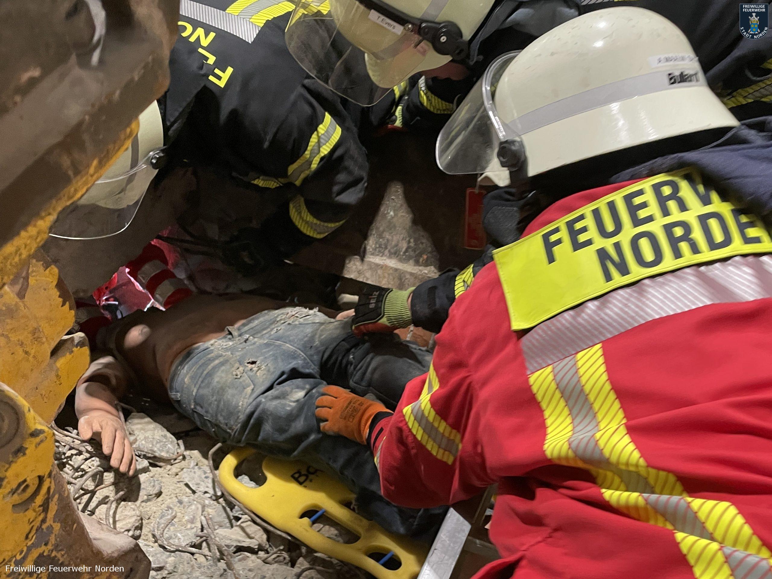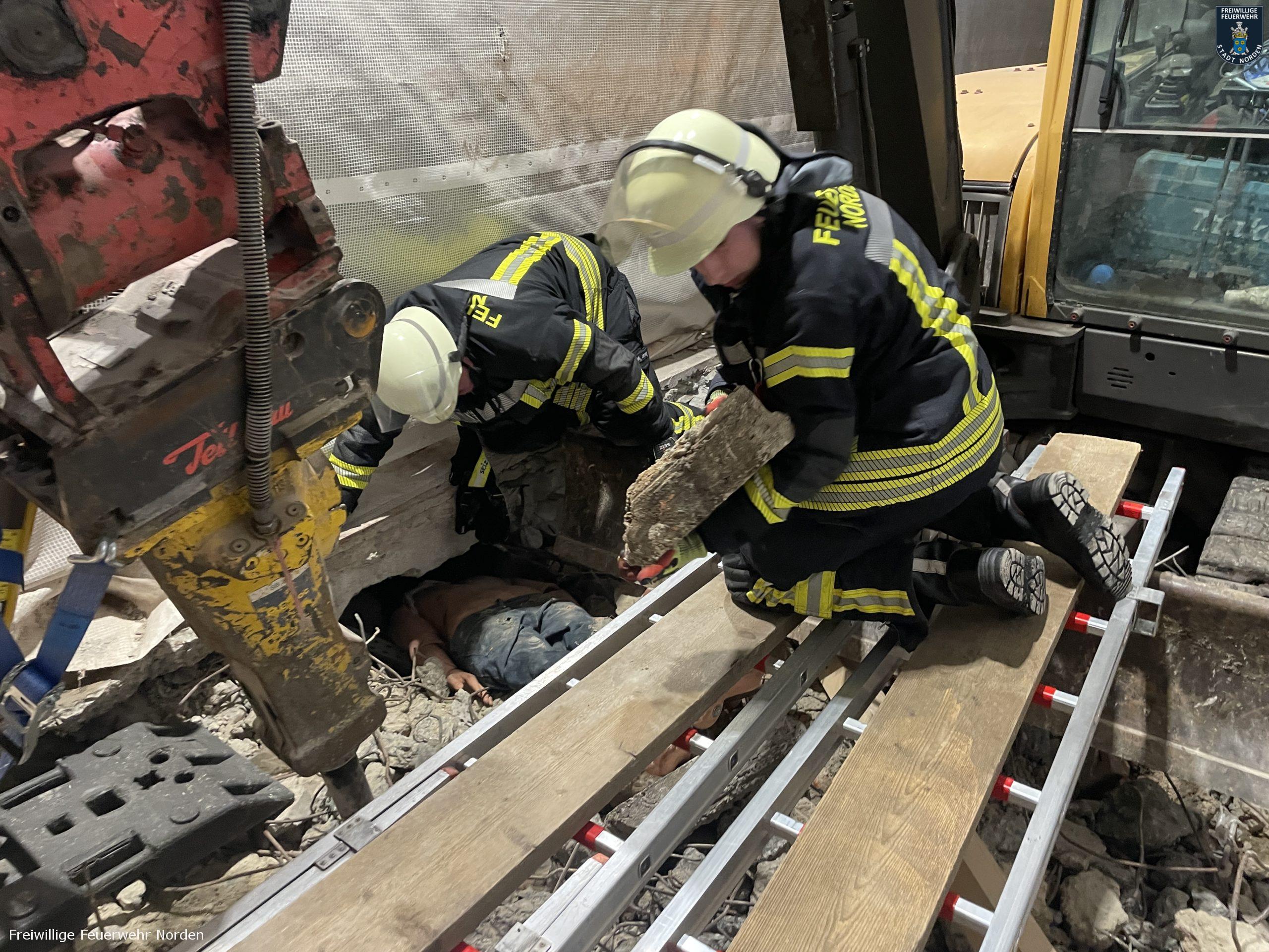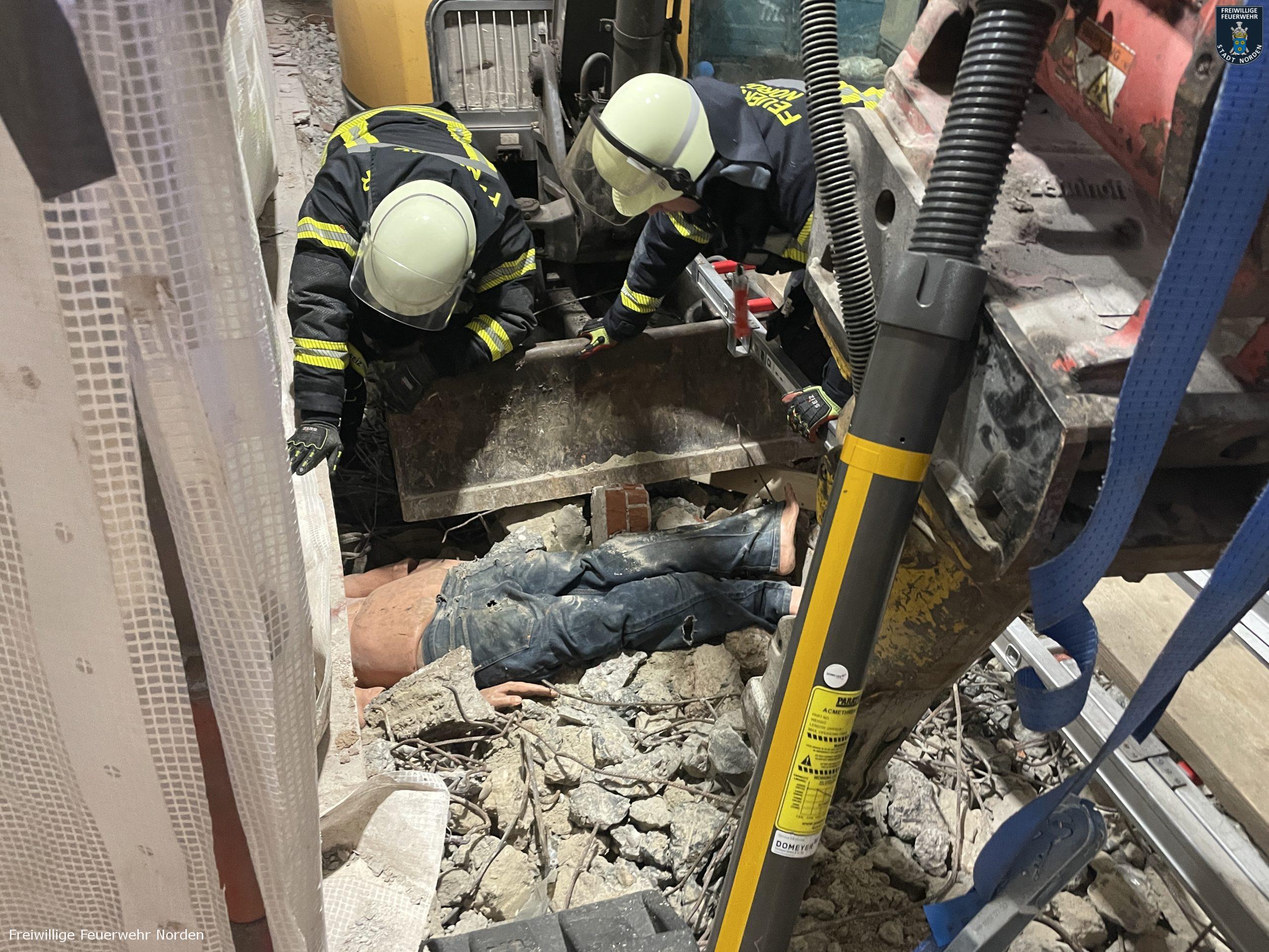 Die tatsächlich stattfinden Bauarbeiten gestalteten die Übungsvorbereitung ungewöhnlich dynamisch. Eigentlich sollte in einem Nebengebäude auch eine Rettung aus einer eingestürzten Grube geübt werden. Doch am Tag der Übung hatte ein Bagger die Grube beseitigt und den umliegenden Betonboden aufgebrochen. Kurzerhand musste das Szenario angepasst werden und so wurde ein durch eine Betondecke gestürzter Bagger mit einer verschütteten Person angenommen. Die Lage hatte es besonders in sich, da für die Einsatzkräfte überhaupt nicht klar war, wie stabil das Bauwerk überhaupt noch war. Sorgfältige Erkundung war hier von den Führungskräften gefragt. Während die Feuerwehrleute begannen den Bagger gegen weitere Bewegung zu sichern und einen ersten Zugang zu dem Verschütteten zu schaffen, stiegen Sanitäter des DRK über eine Leiter in einen Kellerschacht hinab und mühten sich mit ihrer medizinischen Ausrüstung durch den niedrigen und schmalen Keller bis hin zum Patienten. Als die medizinische Erstversorgung sichergestellt war, konnte die Übungspuppe von den schweren Trümmern befreit werden. Den beteiligten Helfern war sehr deutlich anzusehen, dass diese Aufgabe schweißtreibend war.