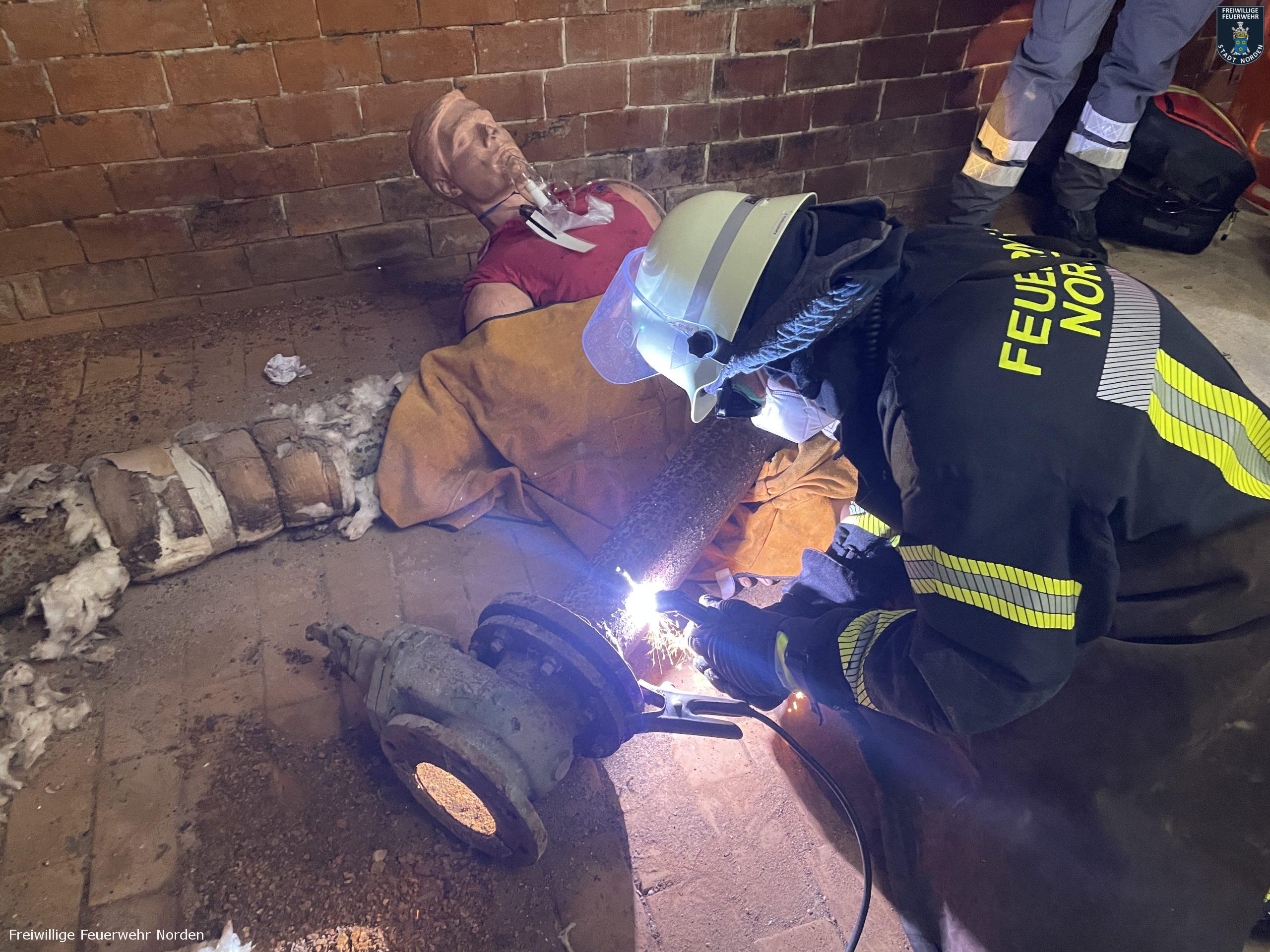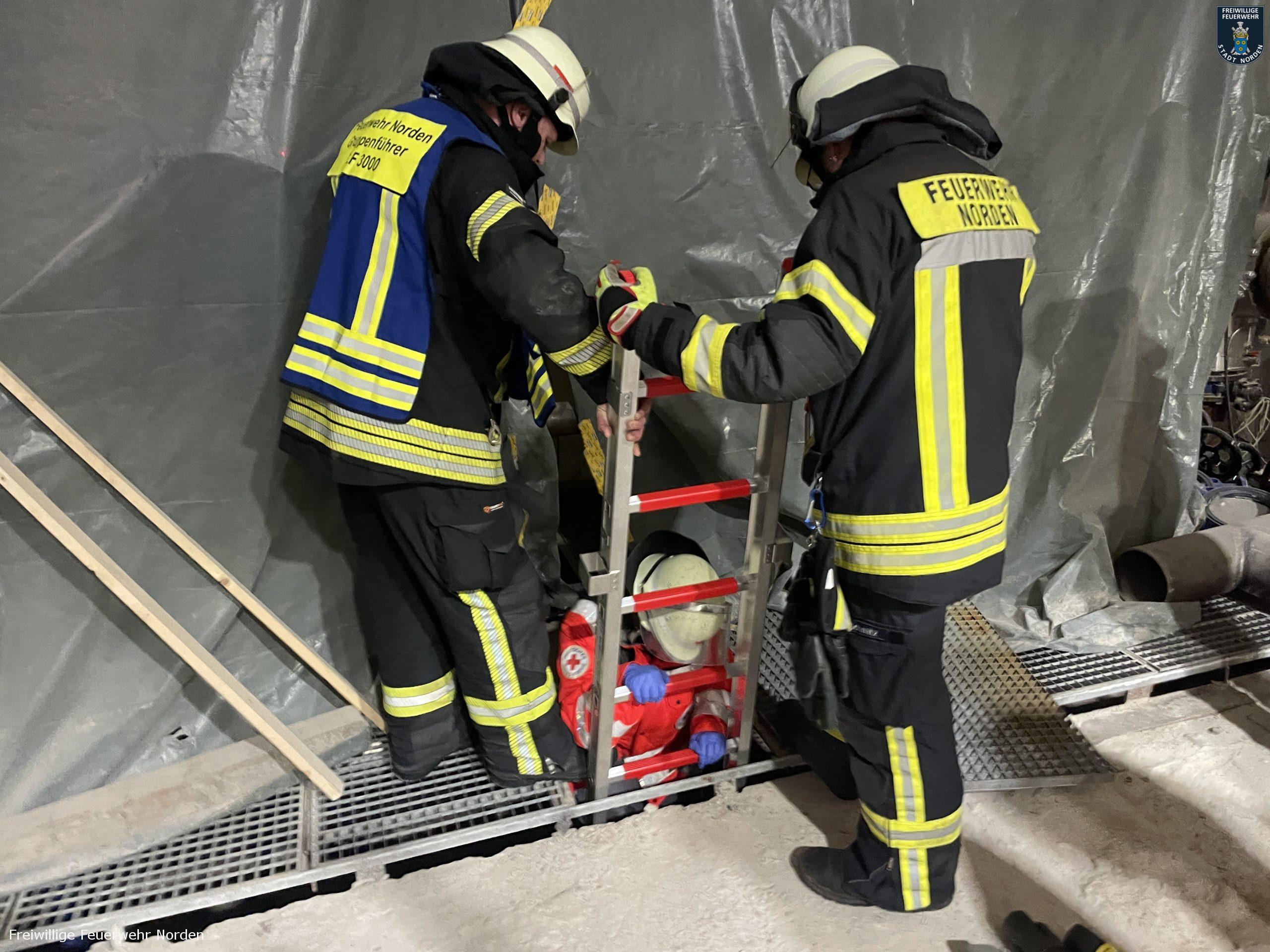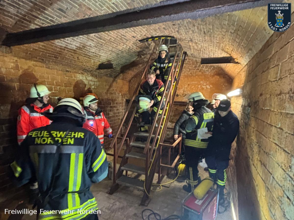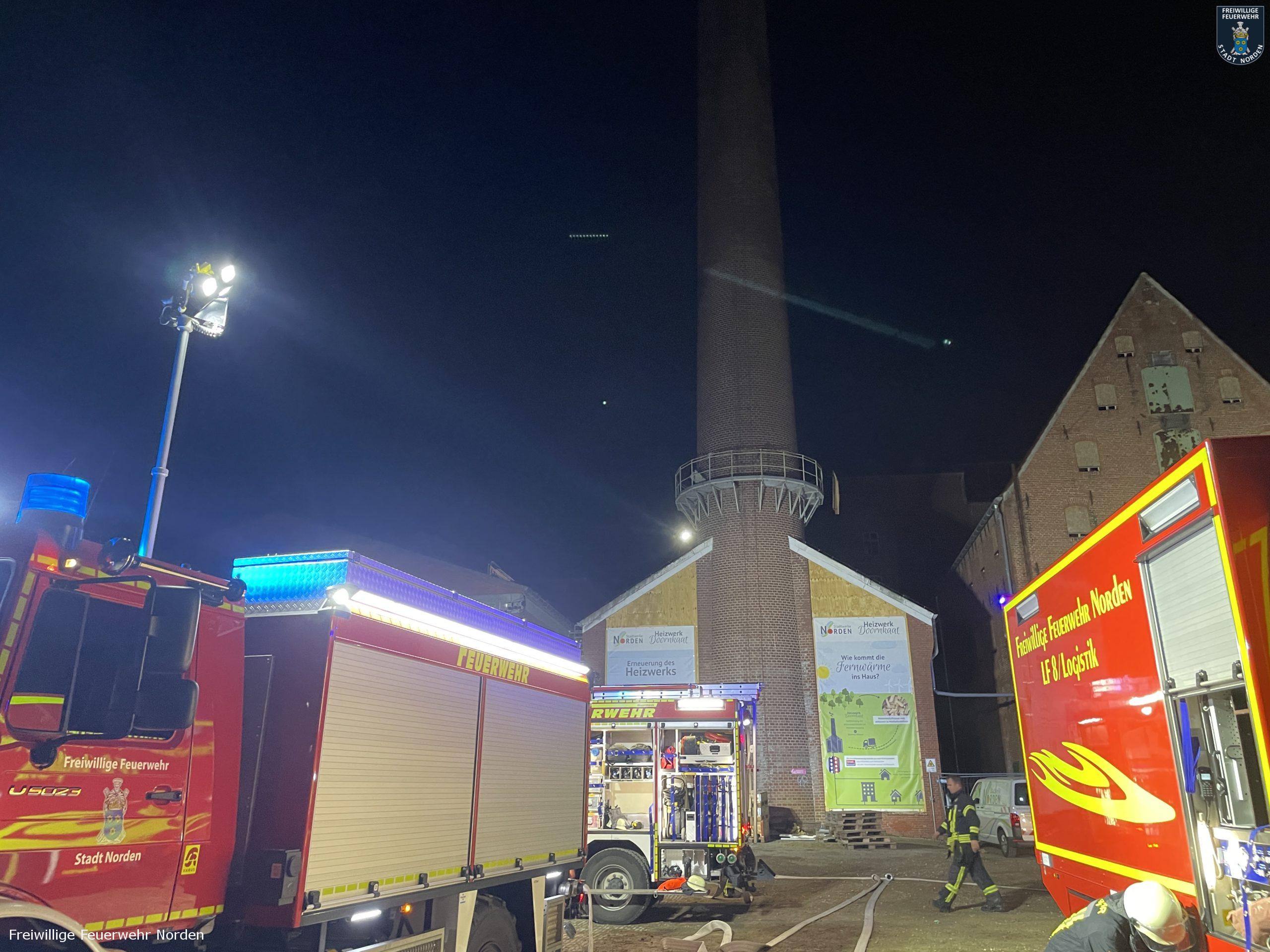 Das Heizkraft der Stadtwerke Norden auf dem ehemaligen Doornkaatgelände in der Norder Innenstadt wird seit mehreren Monaten umfangreich modernisiert. Die Arbeiten befinden sich in der finalen Phase, sodass die Inbetriebnahme bevorsteht. Natürlich kann es bei solchen umfangreichen Arbeiten auch mal zu Zwischenfällen kommen. Genau das, hat die Freiwillige Feuerwehr Norden am Dienstagabend als Grundlage für ihre diesjährige Herbstübung angenommen. Die Inbetriebnahme war echt, eine angenommene Gasexplosion sowie ein Baustellenunfall waren nur Darstellung. Die historischen Gebäude und die laufenden Bauarbeiten bescherten den 120 Einsatzkräften ein besonders authentisches Übungserlebnis in einem besonderen Ambiente.
