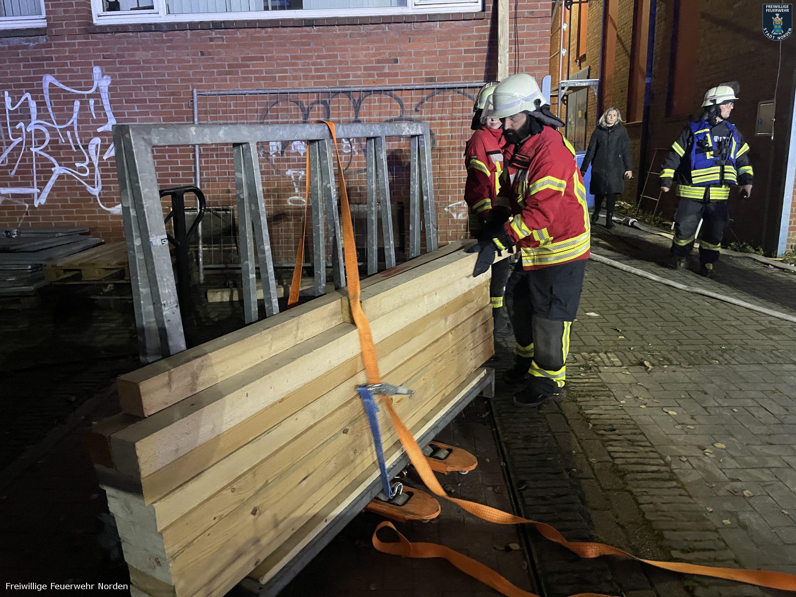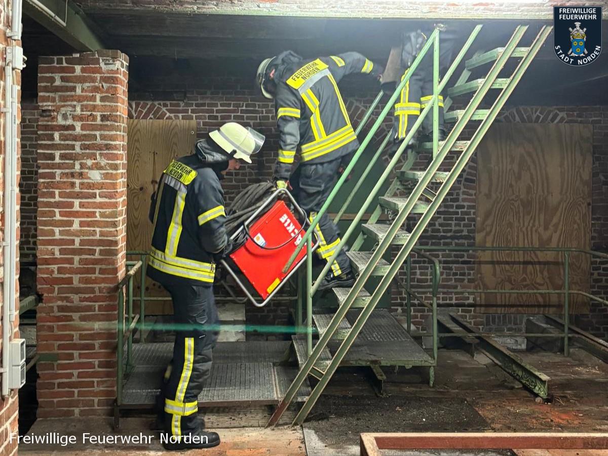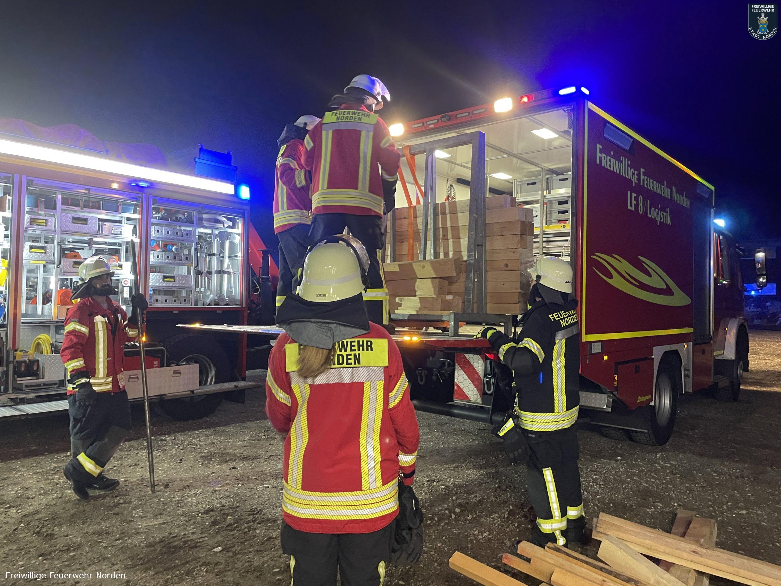 Um für einen möglichen Brand im Holzhackschnitzel ausreichend Löschwasser zur Verfügung stellen zu können, wurde zunächst ein Hydrant in der näheren Umgebung in Betrieb genommen. In 250 Metern Entfernung wurde Wasser aus dem Norder Tief gepumpt und über Schlauchleitungen zur Einsatzstelle gefördert.