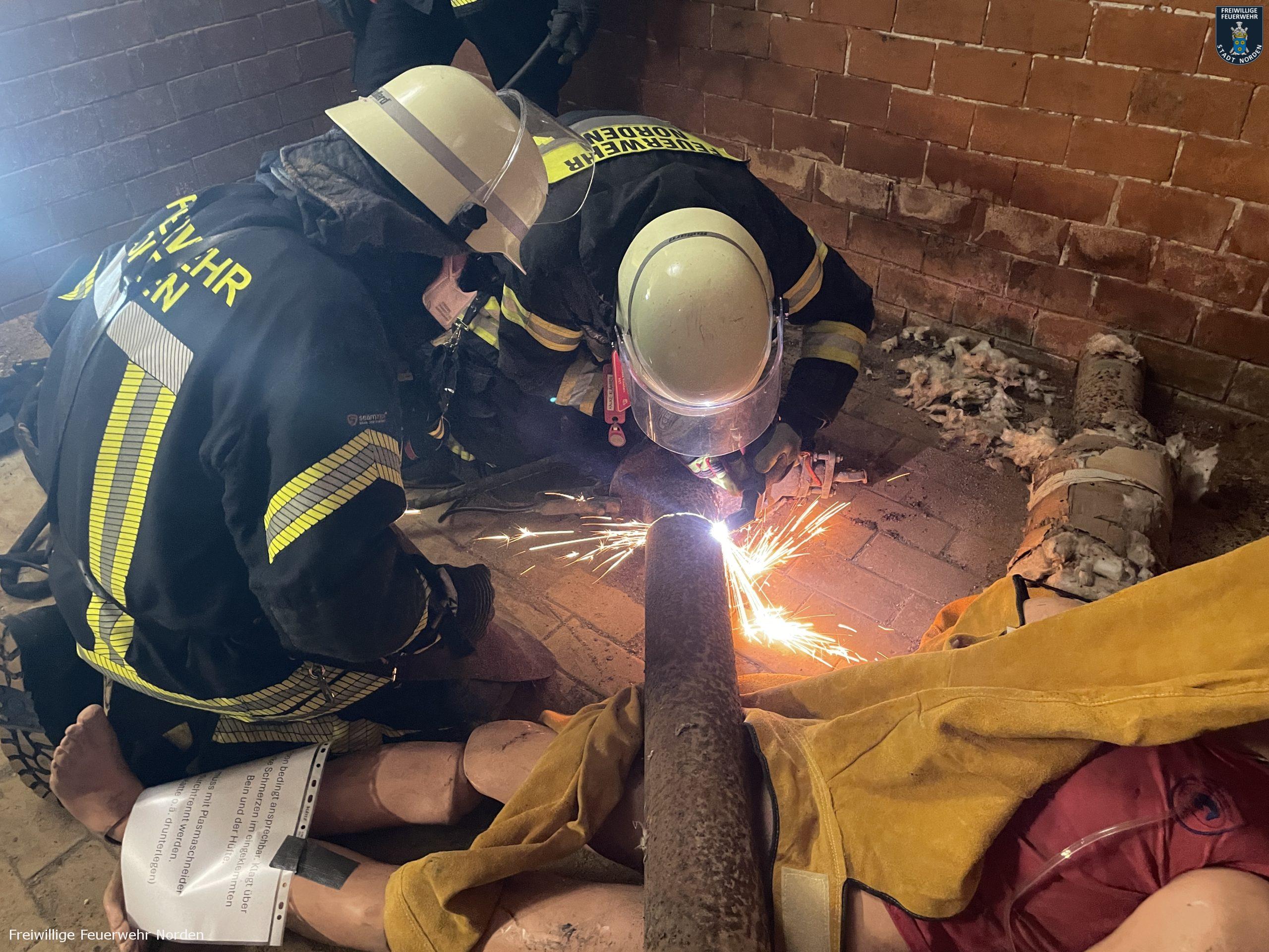 Im „alten Wasserhaus“ hatten weitere Feuerwehrleute ebenfalls eine eingeklemmte Person gefunden. Diese lag im vierten Obergeschoss. Der Weg dorthin führt nur über schmale und steile Treppen. Ein schweres Stahlrohr lag auf den Beinen der Person. Die Befreiung sollte nach Übungsvorgabe nur mit einem Plasmaschneider gelangen. Das elektrische Gerät kann dicken Stahl zum Schmelzen bringen und mit Druckluft einen feinen Schnitt schaffen. Doch der Transport und Aufbau des Rettungsgerätes hätte durch das Treppenhaus viel Personal und wichtige Zeit in Anspruch genommen. Die Einsatzkräfte entschieden daher, die erforderliche Ausrüstung mit der Drehleiter auf das Dach der 5. Etage zu heben und von dort nur eine Ebene tiefer zu tragen. Die Befreiung mit dem Schneidgerät ging dann ganz schnell.