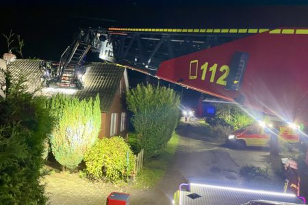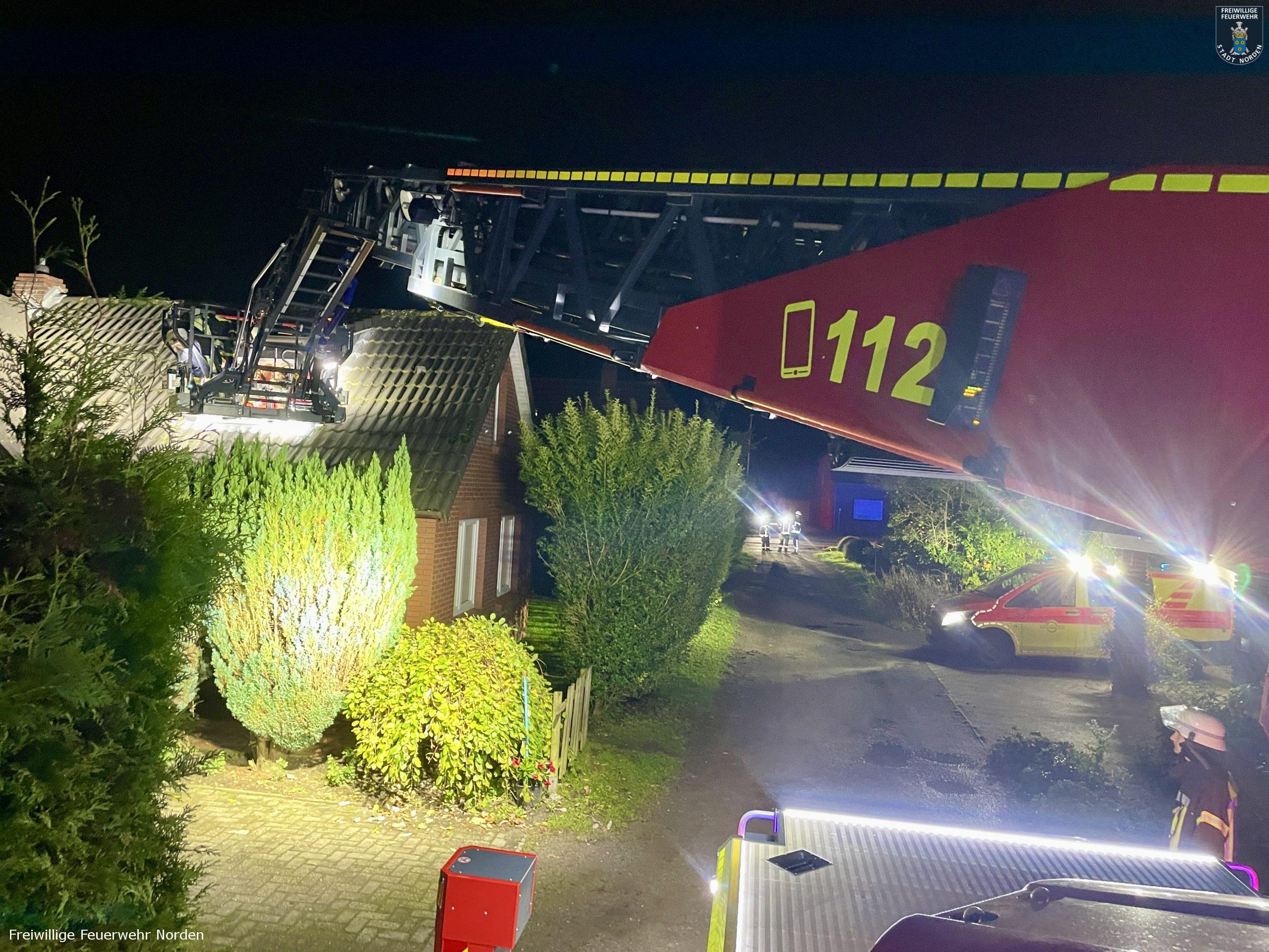 Die erste Anforderung der Feuerwehr durch den Rettungsdienst kam am Dienstag um 22.15 Uhr. Zu diesem Zeitpunkt beendete die Norder Feuerwehr gerade ihren Dienstabend. Ein Löschfahrzeug und die Drehleiter rückten dadurch besonders zügig aus. Der Rettungsdienst behandelte eine Frau im Dachgeschoss eines Wohnhauses in der Heerstraße. Nach einem Sturz klagte sie über starke Schmerzen im Rückenbereich. Der Notarzt konnte daher eine Wirbelsäulenverletzung nicht ausschließen. Ein schonender Transport durch das Treppenhaus schied jedoch aus. Die Treppe war schließlich viel zu eng und zu steil. Es blieb daher nur der Weg durch ein Dachfenster auf den Korb der Drehleiter.