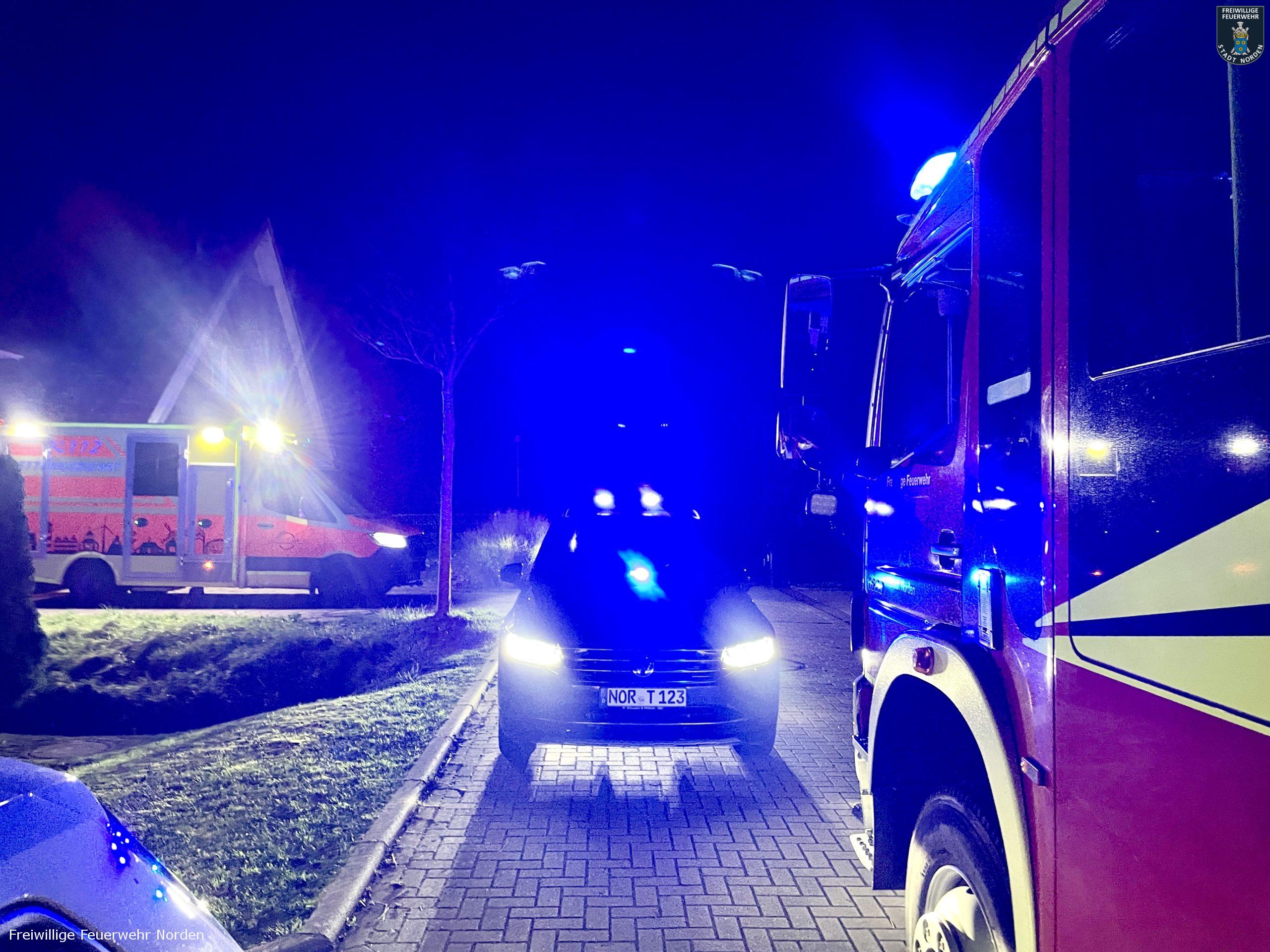 Noch während dieser Einsatz lief, klingelte die Leitstelle Ostfriesland um 1.05 Uhr weitere Einsatzkräfte der Feuerwehr Norden aus den Betten. Diesmal kam die Anforderung von der Polizei. Sie war in Norden im Bereich der Straßen Im Hooker und Theelacht im Einsatz. Anwohner hatten dort einen dauerhaft bellenden Hund gemeldet. Die Beamten stellten bei der Kontrolle vor Ort fest, dass sich der Hund in einem Garten befand und nicht ohne Grund laut gab. Seine Besitzerin lag nämlich regungslos in dem Haus auf dem Grundstück. Die Feuerwehrleute öffneten mit Spezialwerkzeug eine Hintertür und verschafften dem Rettungsdienst so Zugang zu der Patientin. Der Hund beobachte die Einsatzkräfte zunächst aufgeregt aus sicherer Entfernung bei ihrer Arbeit. Trotz liebevoller Ansprache von Feuerwehr und Polizei, ließ sich der große Hund nicht einfangen. Als die Feuerwehrleute die Tür öffneten, stürmte nicht nur der Rettungsdienst in das Haus, sondern auch der Hund und das an allen Helfern vorbei. Im Beisein ihres Hundes und der Einsatzkräfte kam die Frau dann wieder zu sich. Der Rettungsdienst übernahm dann die weitere Versorgung. Für die Norder Feuerwehr war die nächtliche Einsatzserie damit beendet.