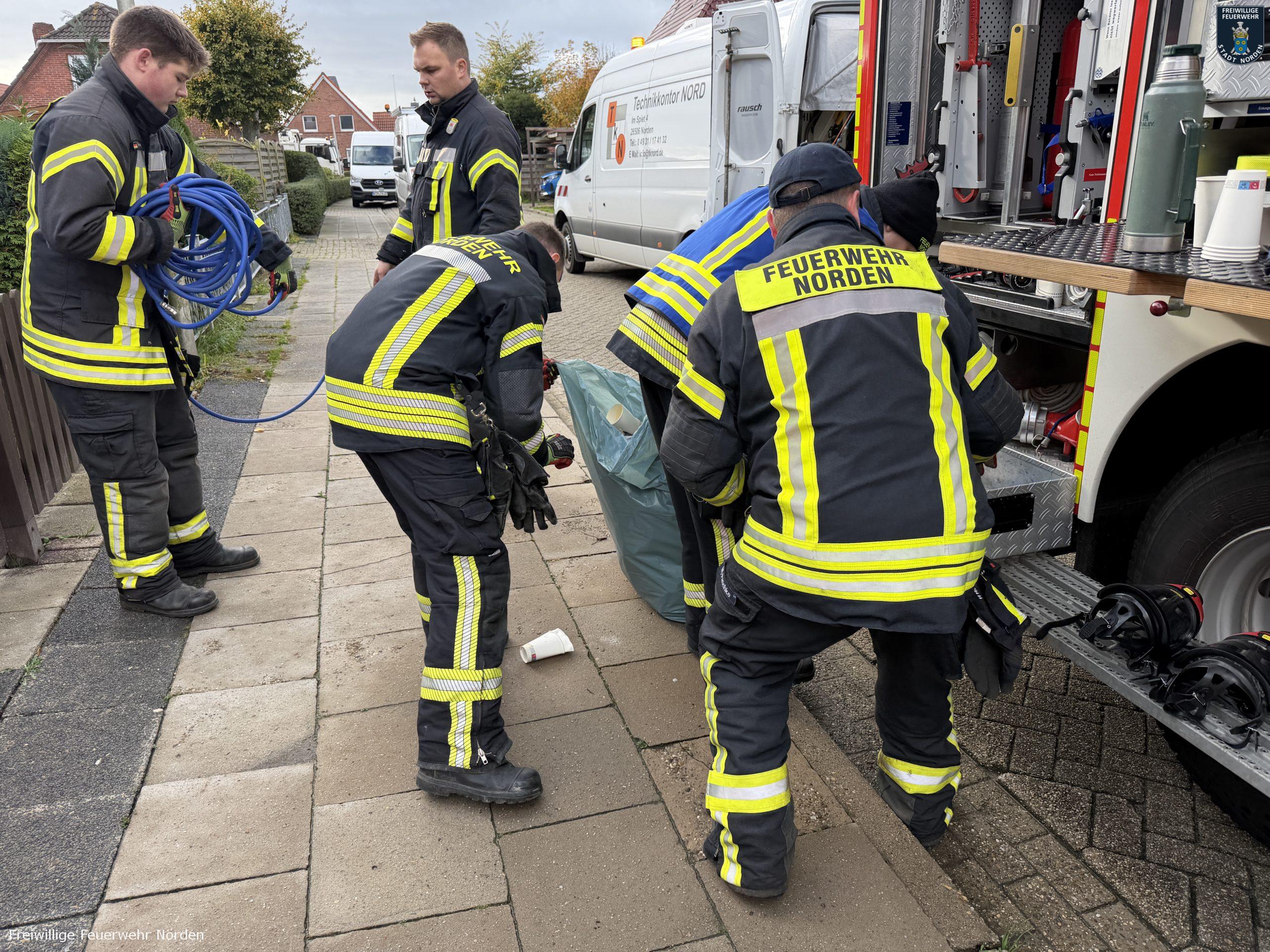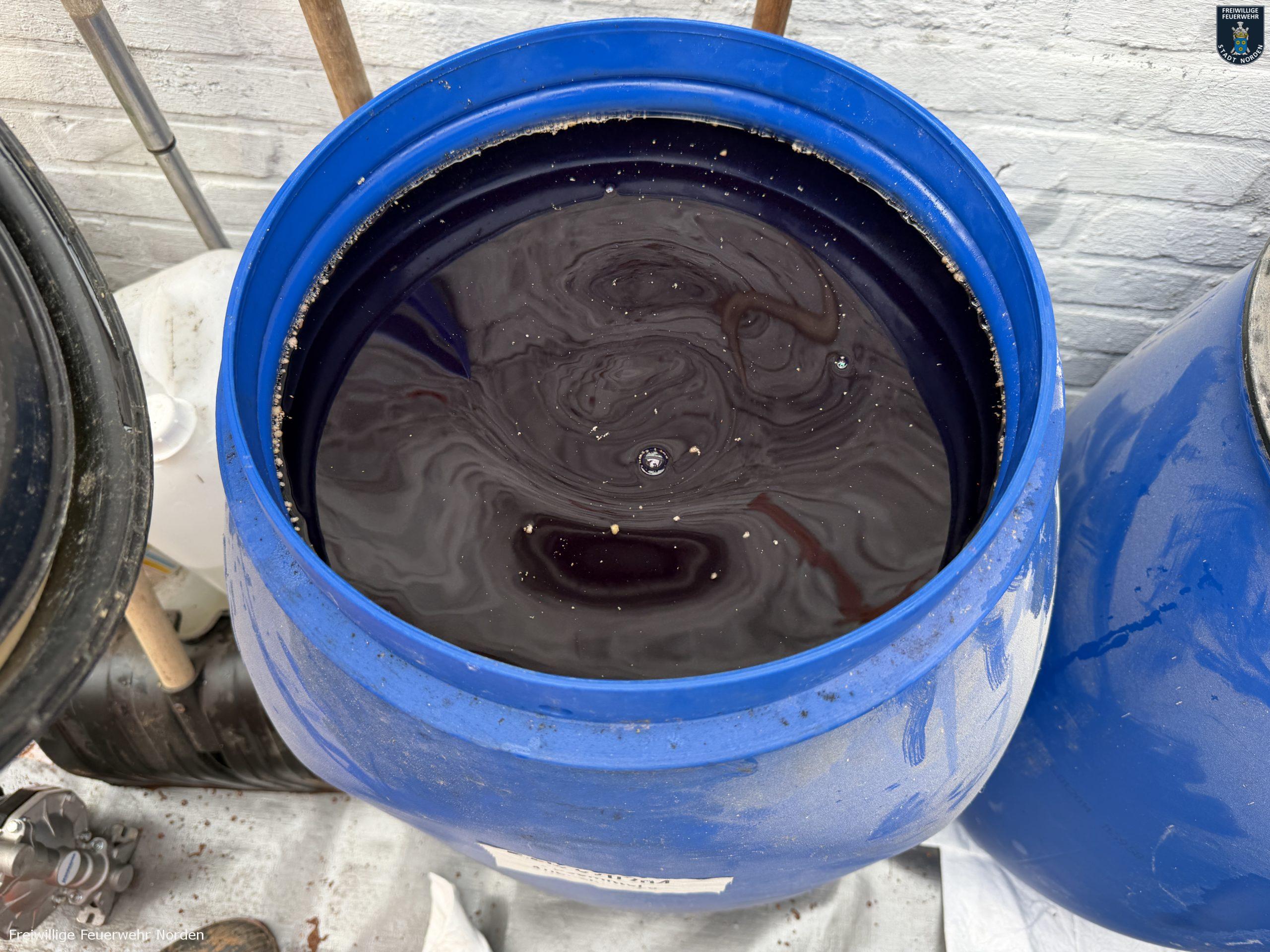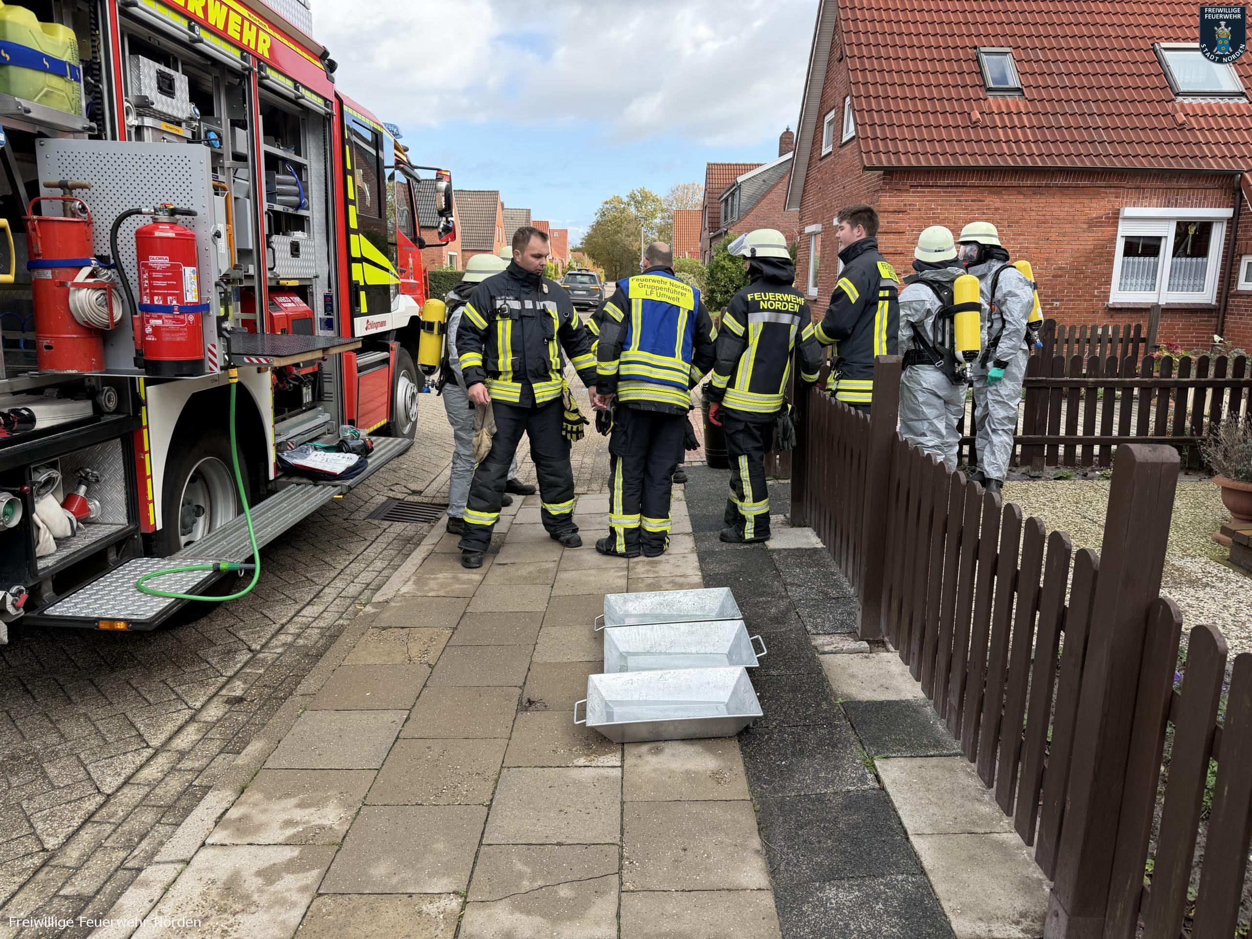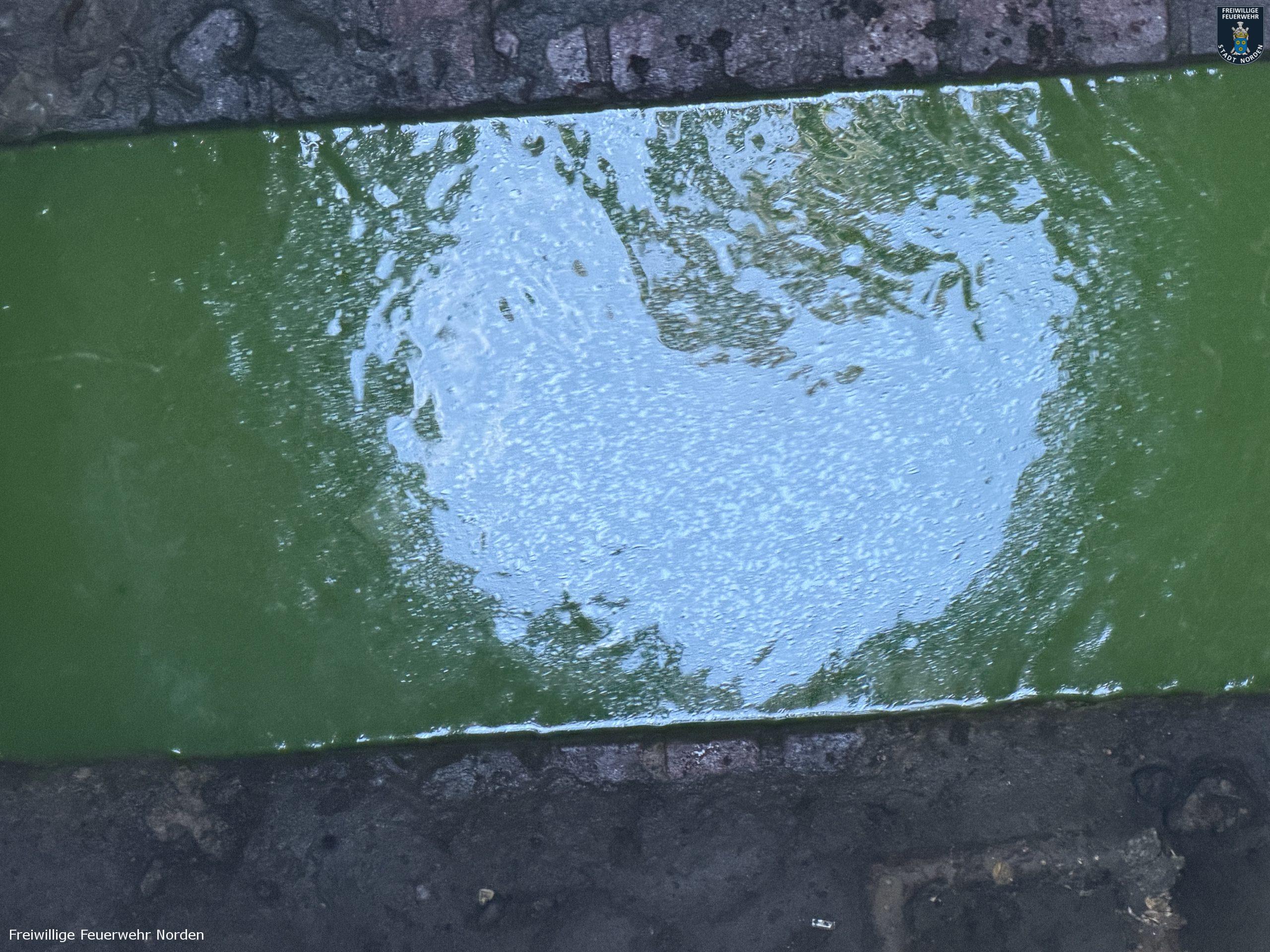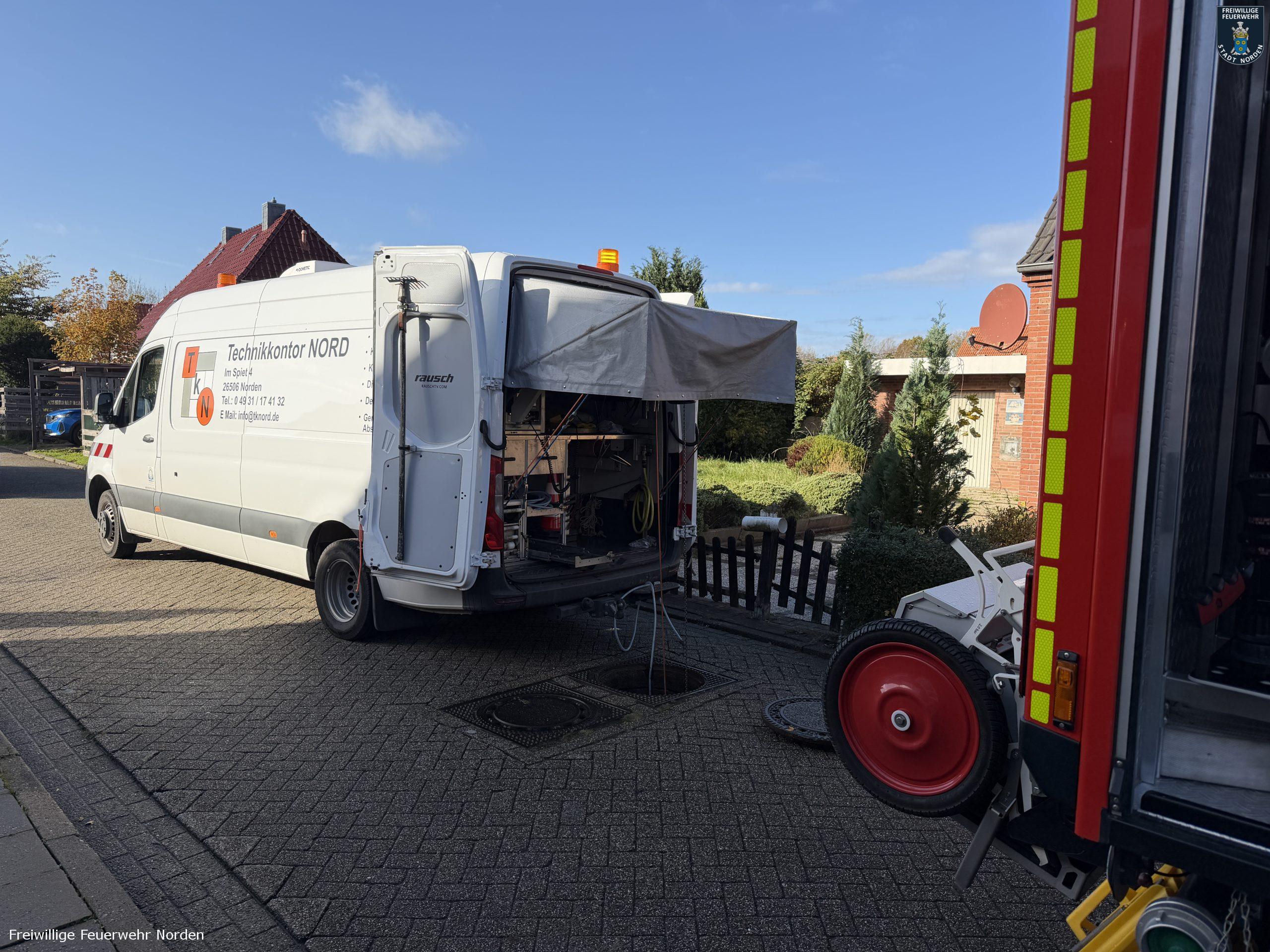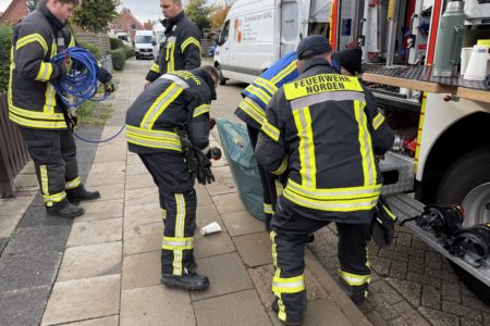 Am Morgen rückte zunächst die Norder Stadtentwässerung in der Radbodstraße an. Mehrere Anwohner hatten intensiven Geruch von Diesel in ihren Häsern bemerkt und gemeldet. Der markante Duft war durch die Abflüsse in die Häuser gelangt. Die städtischen Mitarbeiter stellten bei der Kontrolle der Kanalisation geringe Mengen von Diesel oder Heizöl fest und riefen die Feuerwehr. Die Einsatzkräfte machten sich auf die Suche nach der Herkunft und wurden auf einem Grundstück fündig. Die Feuerwehrleute öffneten dort eine Gartenpforte und einen Schuppen. Schnell war ersichtlich, dass in dem Gebäude mehrere Liter Heizöl ausgelaufen waren und sich den Weg ins Freie gesucht hatten. Die ebenfalls verständigte Polizei machte den abwesenden Hausbesitzer ausfindig. Dieser hatte von dem Schaden noch gar nichts mitbekommen.