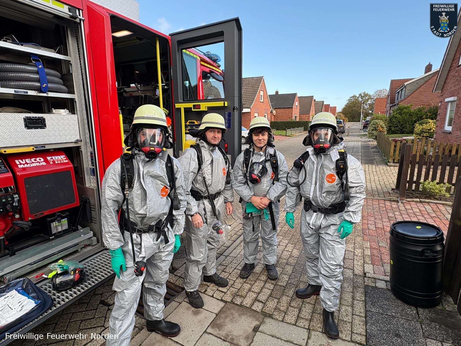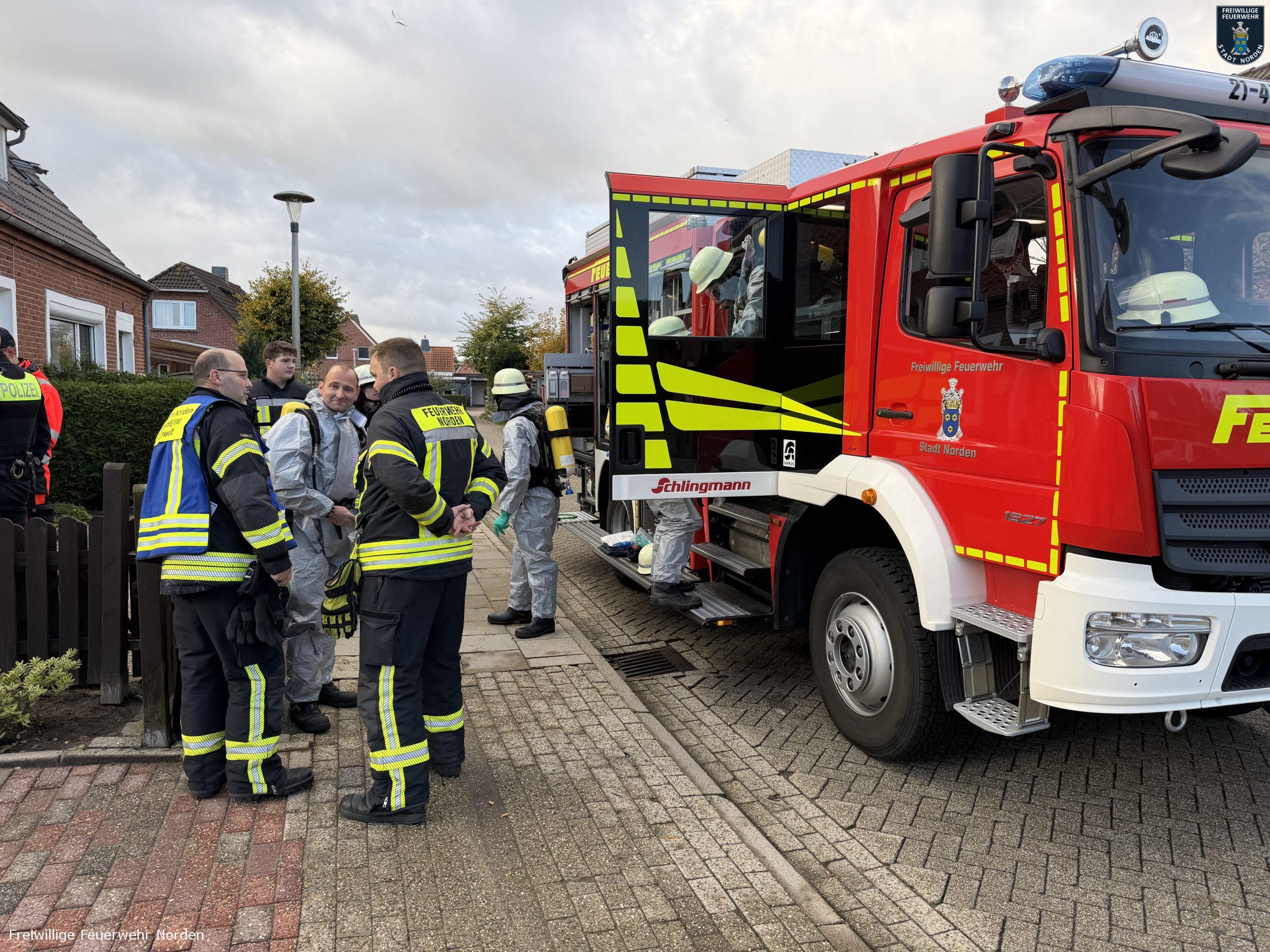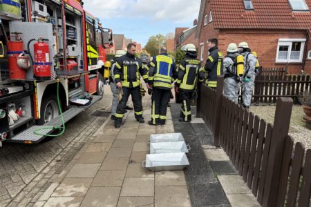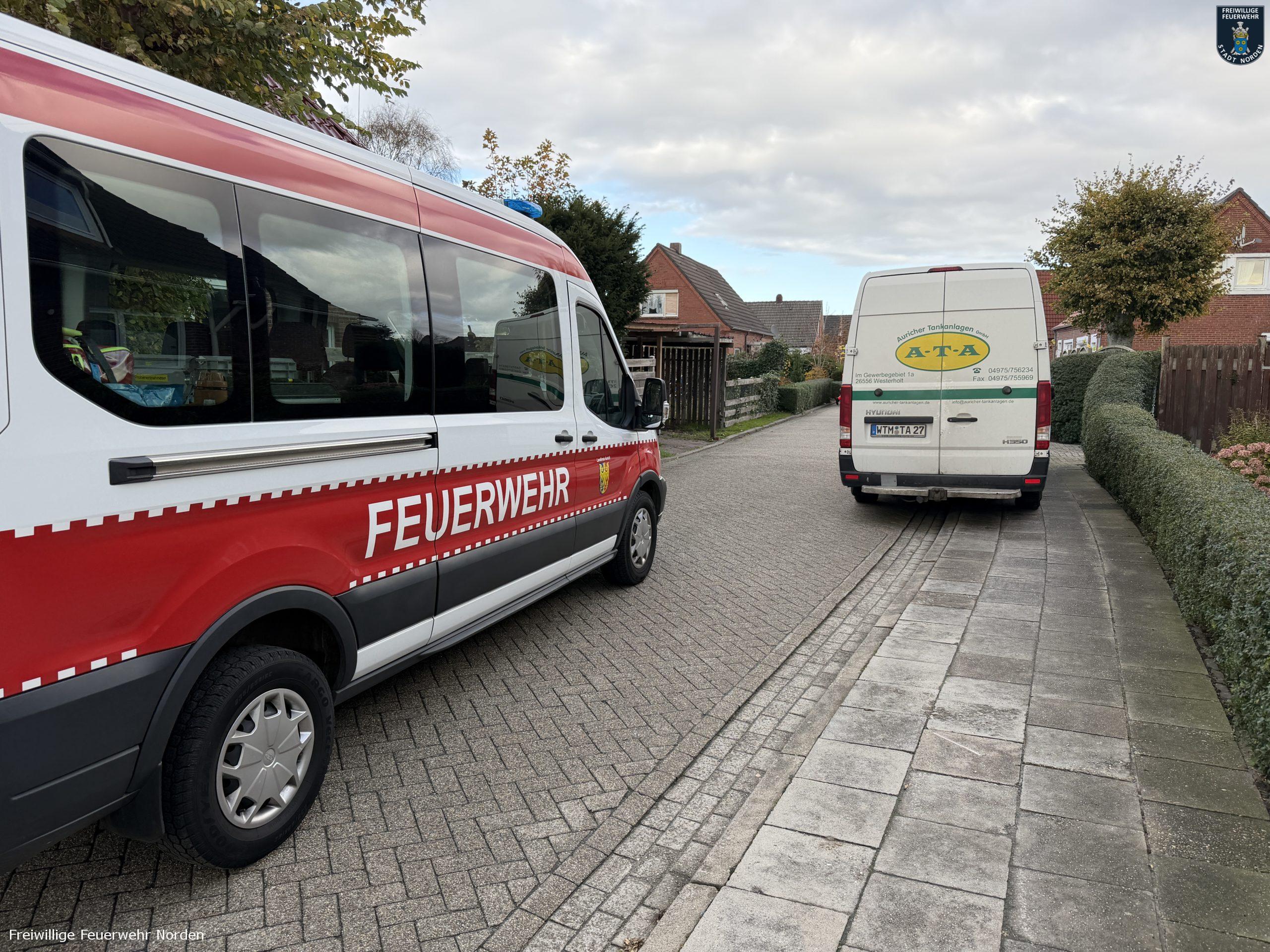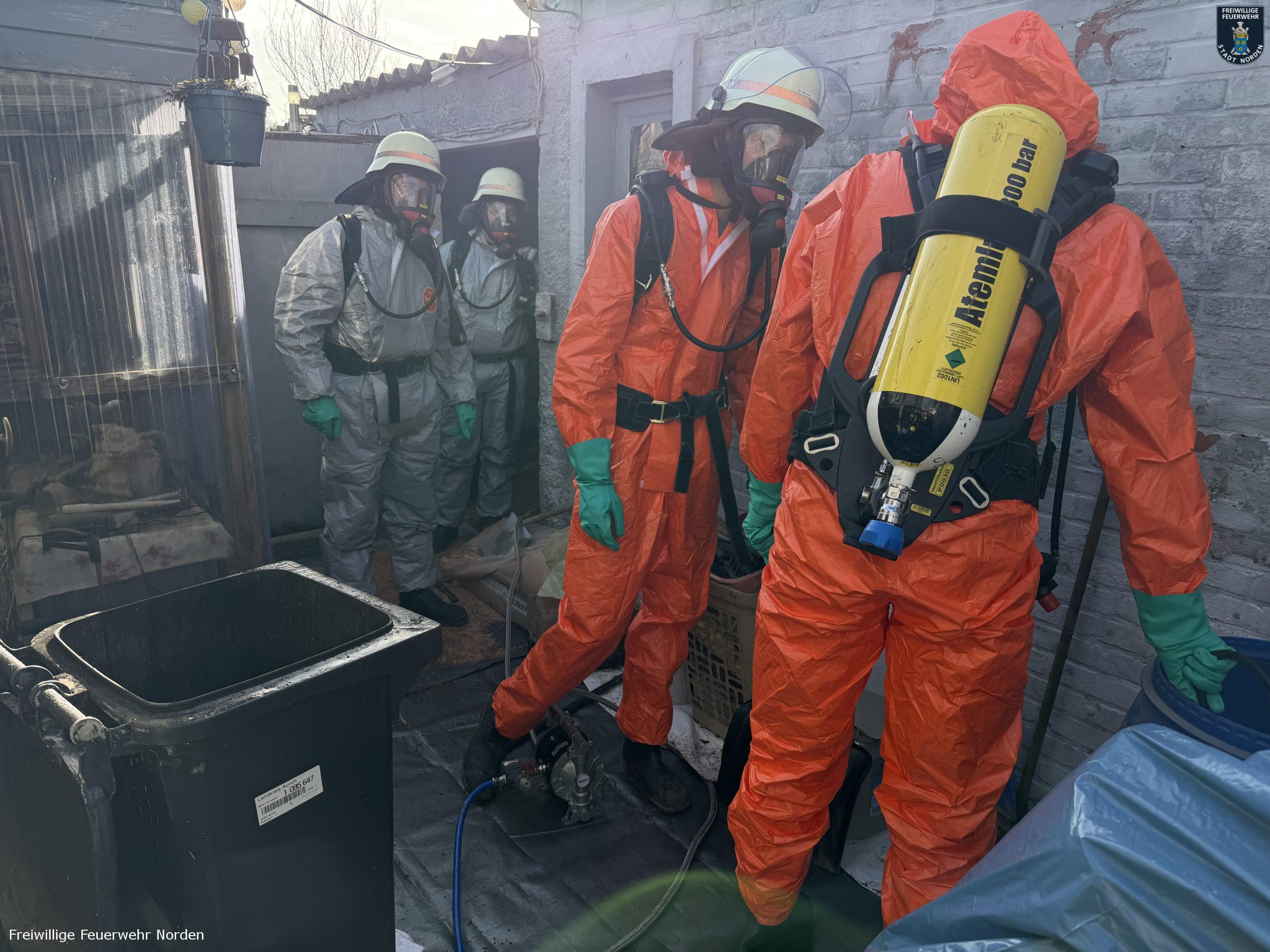 Am Morgen rückte zunächst die Norder Stadtentwässerung in der Radbodstraße an. Mehrere Anwohner hatten intensiven Geruch von Diesel in ihren Häsern bemerkt und gemeldet. Der markante Duft war durch die Abflüsse in die Häuser gelangt. Die städtischen Mitarbeiter stellten bei der Kontrolle der Kanalisation geringe Mengen von Diesel oder Heizöl fest und riefen die Feuerwehr. Die Einsatzkräfte machten sich auf die Suche nach der Herkunft und wurden auf einem Grundstück fündig. Die Feuerwehrleute öffneten dort eine Gartenpforte und einen Schuppen. Schnell war ersichtlich, dass in dem Gebäude mehrere Liter Heizöl ausgelaufen waren und sich den Weg ins Freie gesucht hatten. Die ebenfalls verständigte Polizei machte den abwesenden Hausbesitzer ausfindig. Dieser hatte von dem Schaden noch gar nichts mitbekommen.