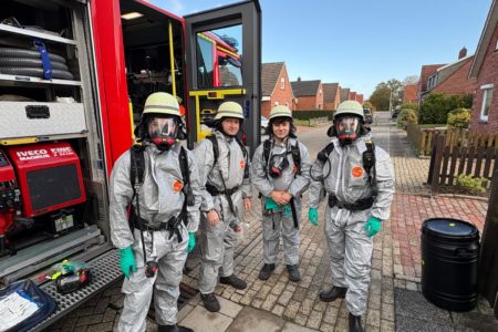 Die Feuerwehrleute zogen sich spezielle Schutzanzüge an und gingen unter Atemschutz in den Schuppen vor. Mit Bindemittel wurde die sichtbare Flüssigkeit zunächst abgebunden. Der Schuppen wurde dann vollständig ausgeräumt und alles in einer flüssigkeitsdichten Wanne gesammelt. Rund 400 Liter Heizöl pumpten die Helfer aus dem Tank in Fässer um. Für die rund 20 Feuerwehrleute gestaltete sich der Einsatz sehr aufwändig, weil alle Tätigkeiten nur in mineralölbeständiger Schutzkleidung und Ausrüstung erfolgen konnte. Alle Arbeiten erfolgten zudem in Absprache und unter Aufsicht von Vertretern der Unteren Wasserbehörde sowie der Unteren Bodenschutzbehörde des Landkreises Aurich. Für eine Schadstoffmessung in einem Wohnhaus rückte zusätzlich auch der Gefahrgutzug aus Aurich-Sandhorst mit einem Messfahrzeug an.