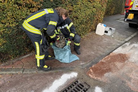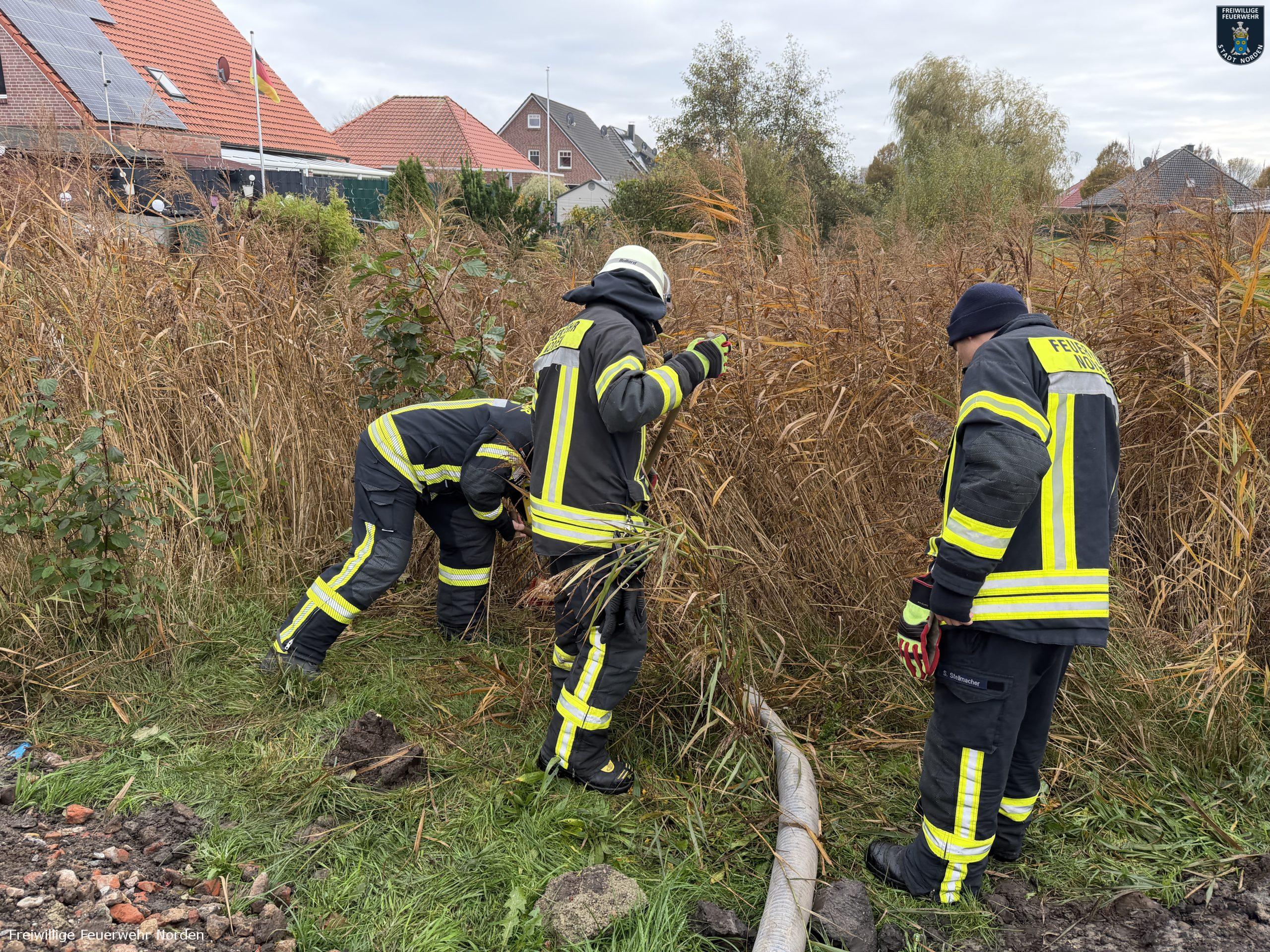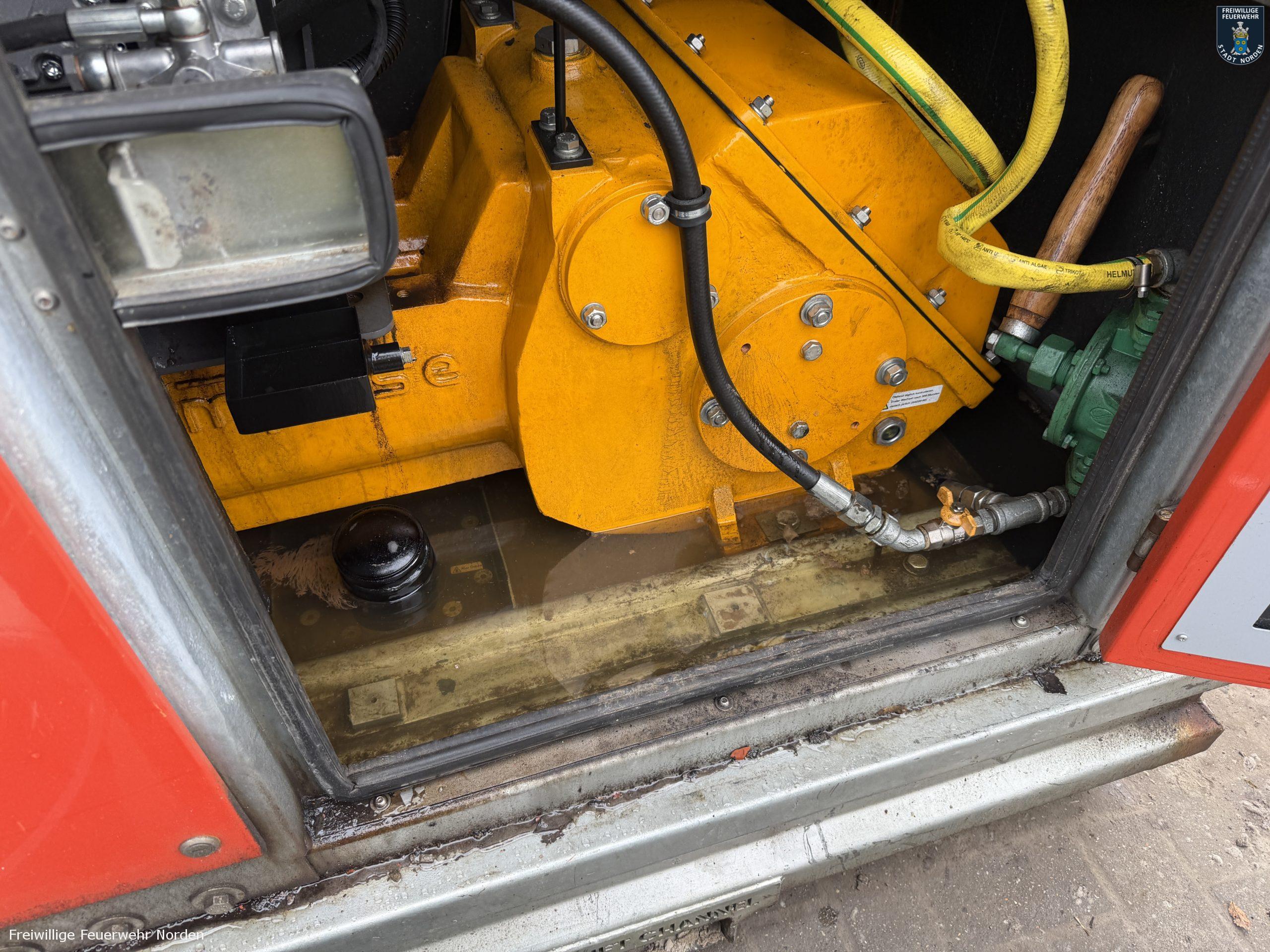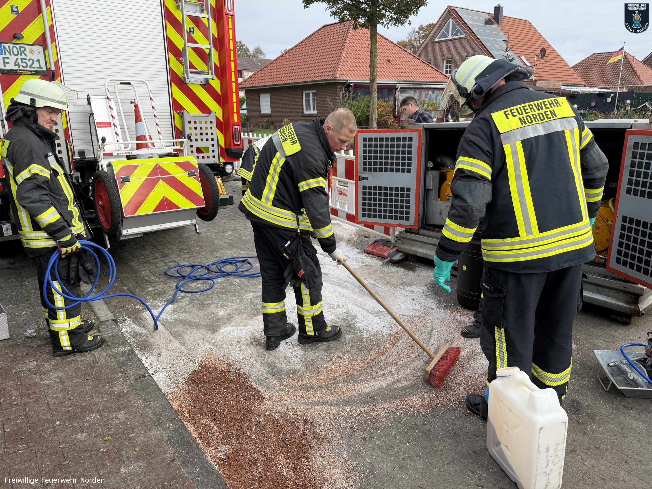 Eine defekte Grundwassersenkungspumpe hat am Sonntagmittag einen Einsatz der Freiwilligen Feuerwehr Norden ausgelöst. Anwohnern der Hamburger Straße war zuvor aufgefallen, dass sich auf der Straße ein schillernder Ölfilm auf der Straße ausbreitete und in einen Gully lief. Der Ursprung war auch schnell zu erkennen – eine wenige Meter entfernt aufgestellte Pumpe, die sich auf einer Baustelle in Betrieb befand. Die Feuerwehr nahm zunächst die Maschine außer Betrieb und sicherte den Gully mit Bindemittel. In der Kanalisation brachten die Feuerwehrleute eine Ölsperre aus. Mit einer Umfüllpumpe pumpten sie rund 60 Liter Öl-Diesel-Wasser-Gemisch aus der Aufwangwanne der Maschine ab. Nach rund zwei Stunden übernahm ein Verantwortlicher der Baufirma und des Eigentümers der Grundwassersenkungspumpe die Einsatzstelle. Er organsierte weitere Reinigungs- und Entsorgungsaufgaben. Die Polizei nahm der Vorfall auf.