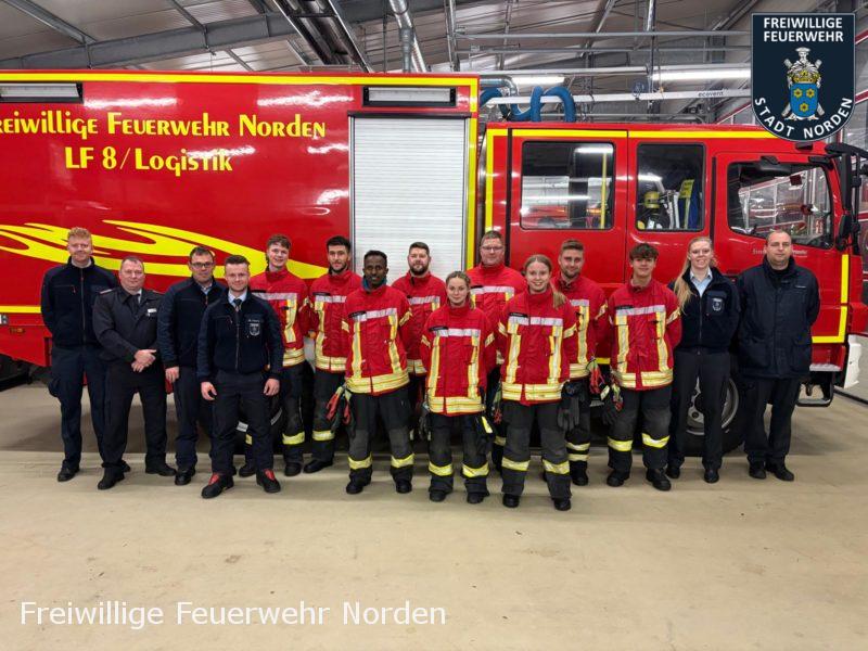 Neun Kameradinnen und Kameraden verstärken seit gestern die Einsatzabteilung der Freiwilligen Feuerwehr Norden. Alle haben nach einer mündlichen und praktischen Prüfung am Hilfeleistungszentrum in Norden durch Kreisausbilder des Landkreises Aurich die erste Stufe der neuen modularen Grundlagenausbildung bestanden und haben jetzt die Qualifikationsstufe Einsatzfähigkeit (QS1). Mit dieser Befähigung sind sie als Mitglieder der Einsatzabteilung der Norder Wehr berechtigt und gleichzeitig auch verpflichtet an Einsätzen teilzunehmen. Hierfür wurden alle mit einem digitalen Meldeempfänger ausgestattet. Diese zeitintensive Ausbildung findet komplett auf kommunaler Ebene statt und wird ausschließlich durch Ehrenamtliche durchgeführt.