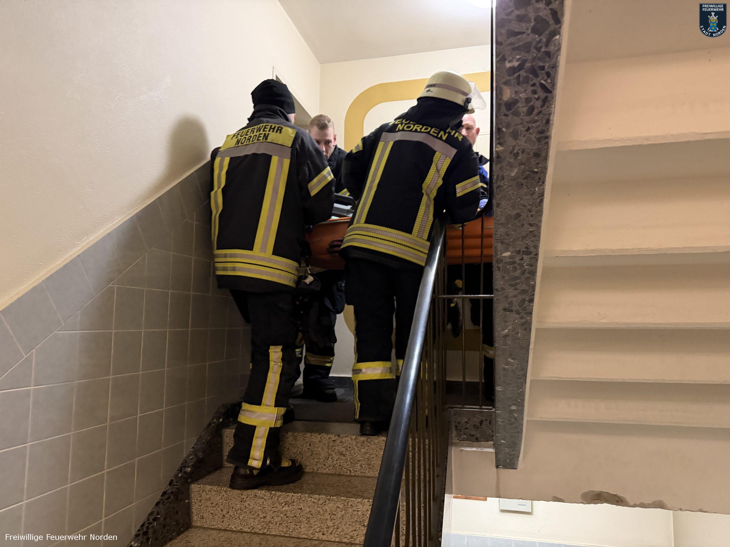 Ein schmales Treppenhaus erschwerte am Sonnabend in Norden den Transport eines Patienten des Rettungswagens. Am frühen Morgen behandelte der Rettungsdienst samt Notarzt einen schwer erkrankten Mann in einem Mehrparteienhaus in der Sielstraße. Mit den zur Verfügung stehenden Mitteln und Kräften konnten die Einsatzkräfte den Mann jedoch nicht zum Rettungswagen tragen. Erst mit der angeforderten Feuerwehr gelang der Transport. Zwar konnte die Freiwillige Feuerwehr Norden aus Platzgründen ihre Drehleiter nicht in Stellung bringen, dafür gelang es aber den Patienten in einer Schleifkorbtrage mit vereinten Kräften aus dem zweiten Obergeschoss durch das Treppenhaus zu tragen.