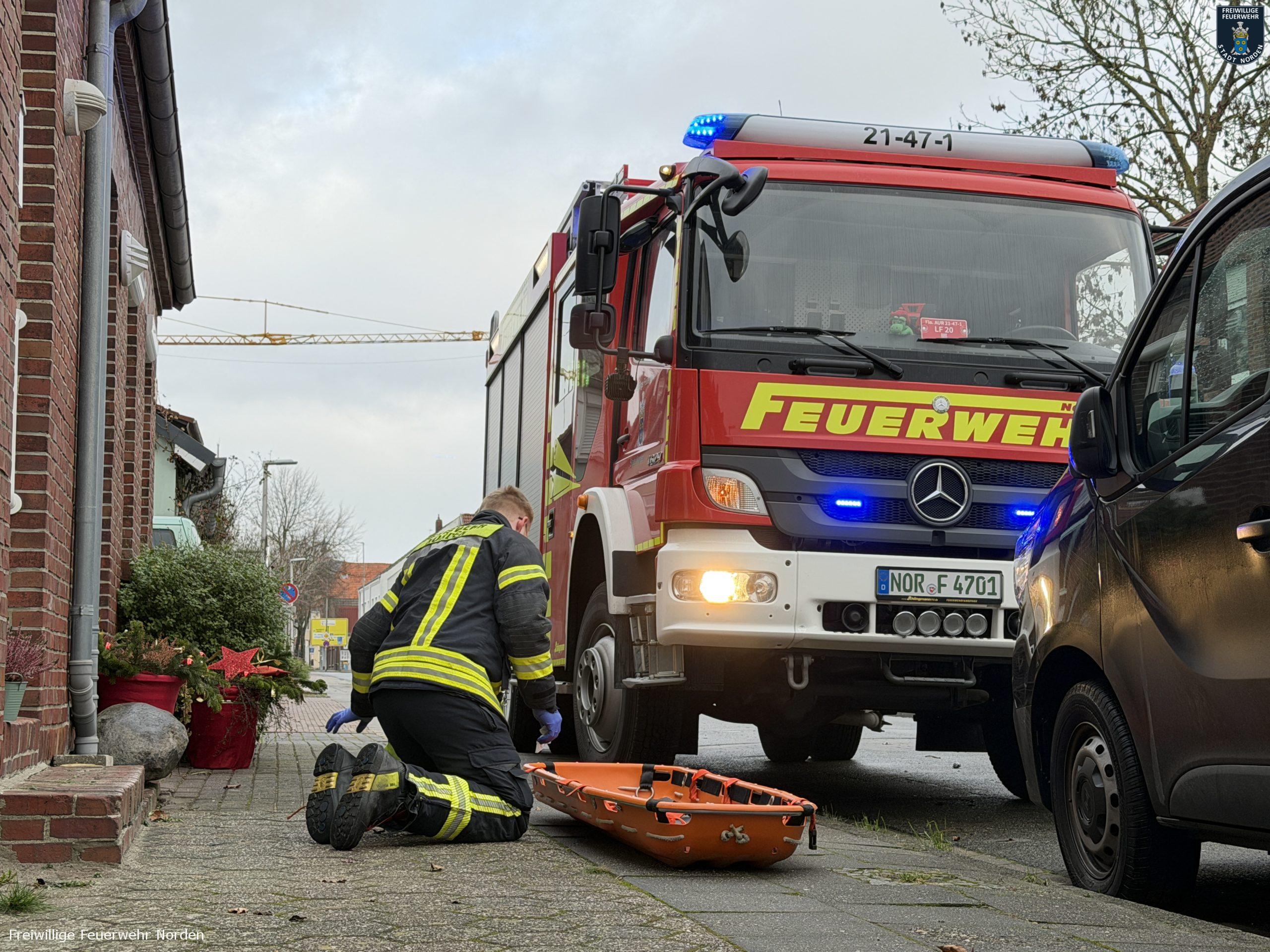 Erneut ist die Freiwillige Feuerwehr Norden am Montagmittag zur Unterstützung des Rettungsdienstes ausgerückt. In der Mackeriege musste ein pflegebedürftiger Mann aus seiner Doppelhaushälfte zum Rettungswagen getragen werden. Nachdem der Rettungsdienst den Patienten versorgt hatte, konnte die Feuerwehr den Mann in einer Schleifkorbtrage durch ein Fenster ins Freie heben. Dort übernahm die Besatzung des Rettungswagens dann wieder und brachte ihn in ein Krankenhaus.