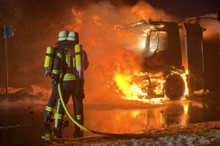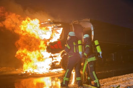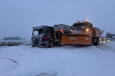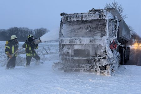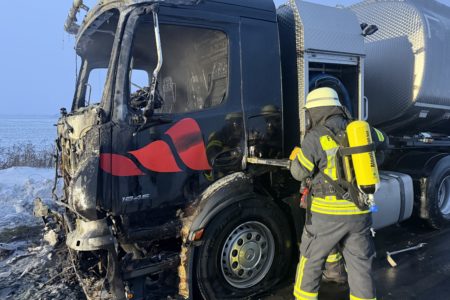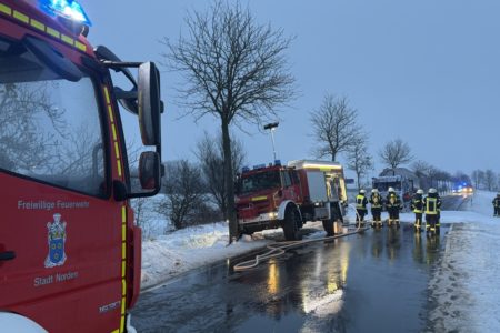 Die Zugmaschine eines Sattelzugs ist am Montag in Norden in Brand geraten. Das Milchsammelfahrzeug befuhr die Neuwesteeler Straße im Ortsteil Neuwesteel. Gegen 7.40 Uhr bemerkte der Fahrer während der Fahrt, wie auf der Beifahrerseite Rauch aus dem Fahrzeug drang. Er stoppte darauf seinen Lkw und brachte sich in Sicherheit. Er blieb unverletzt. Schnell breiteten sich die Flammen aus und ergriffen das gesamte Fahrerhaus. Die alarmierte Freiwillige Feuerwehr Norden fuhr die abgelegene Einsatzstelle mit mehreren Fahrzeugen vom Standort Leybuchtpolder und Hilfeleistungszentrum an. Die Anfahrt gestaltete sich jedoch wegen extremer Straßenglätte durch Eisregen als herausfordernd.