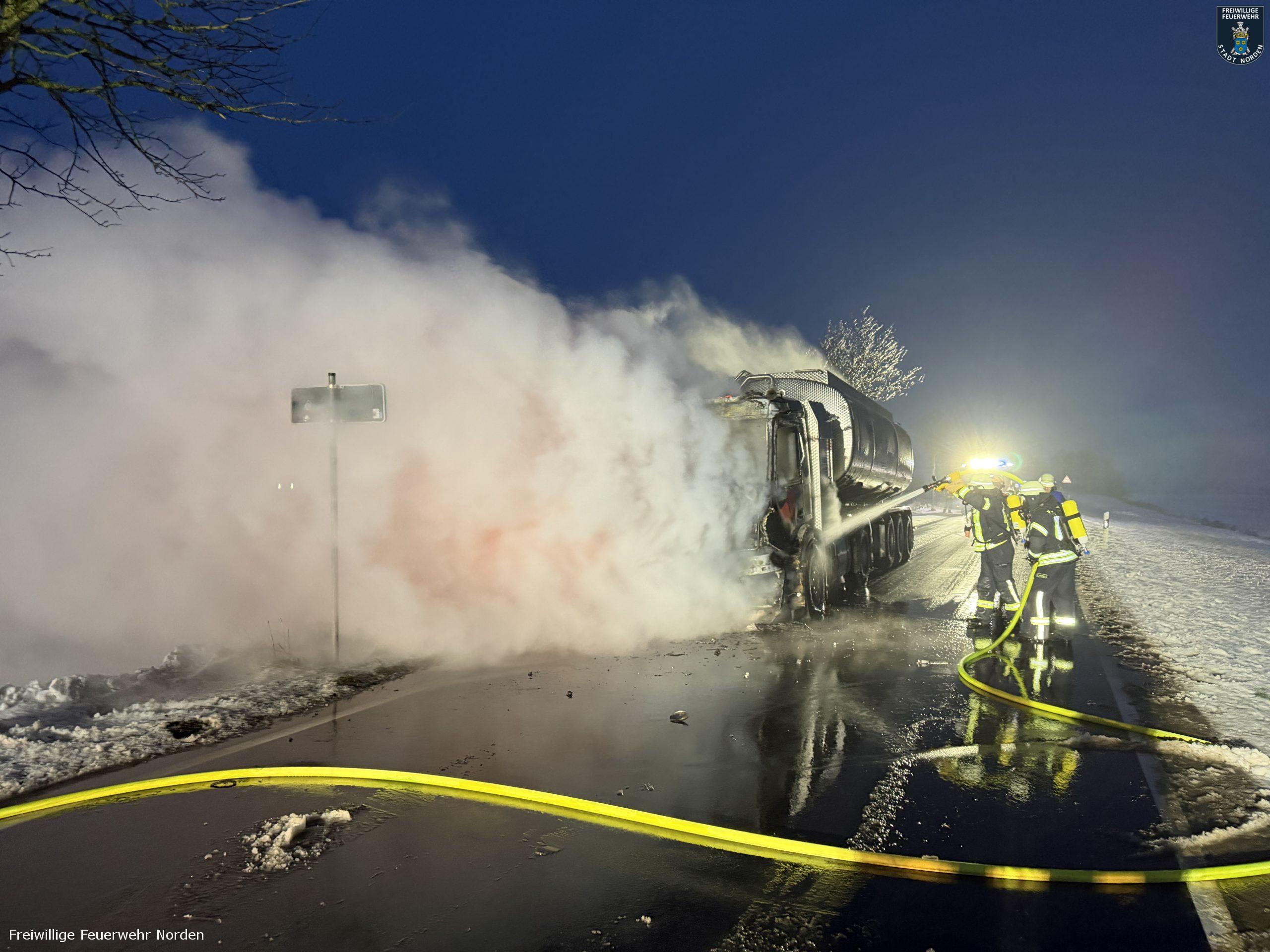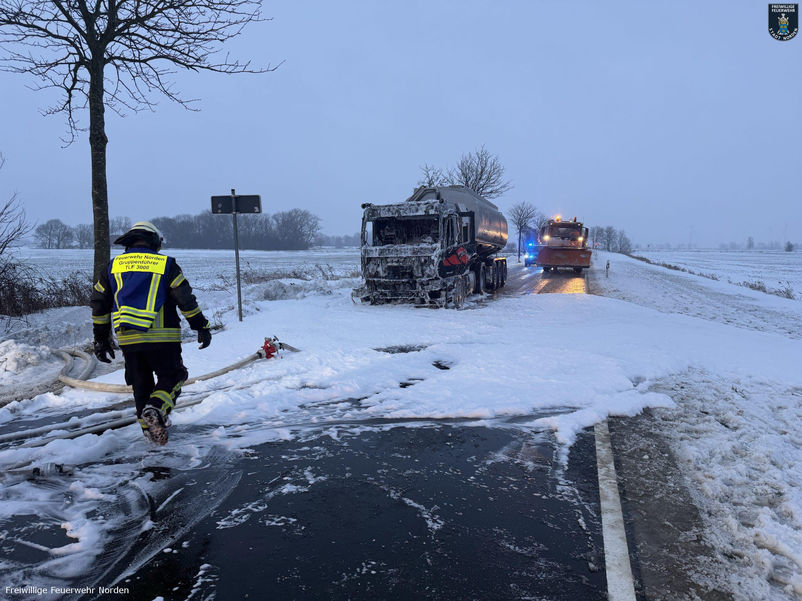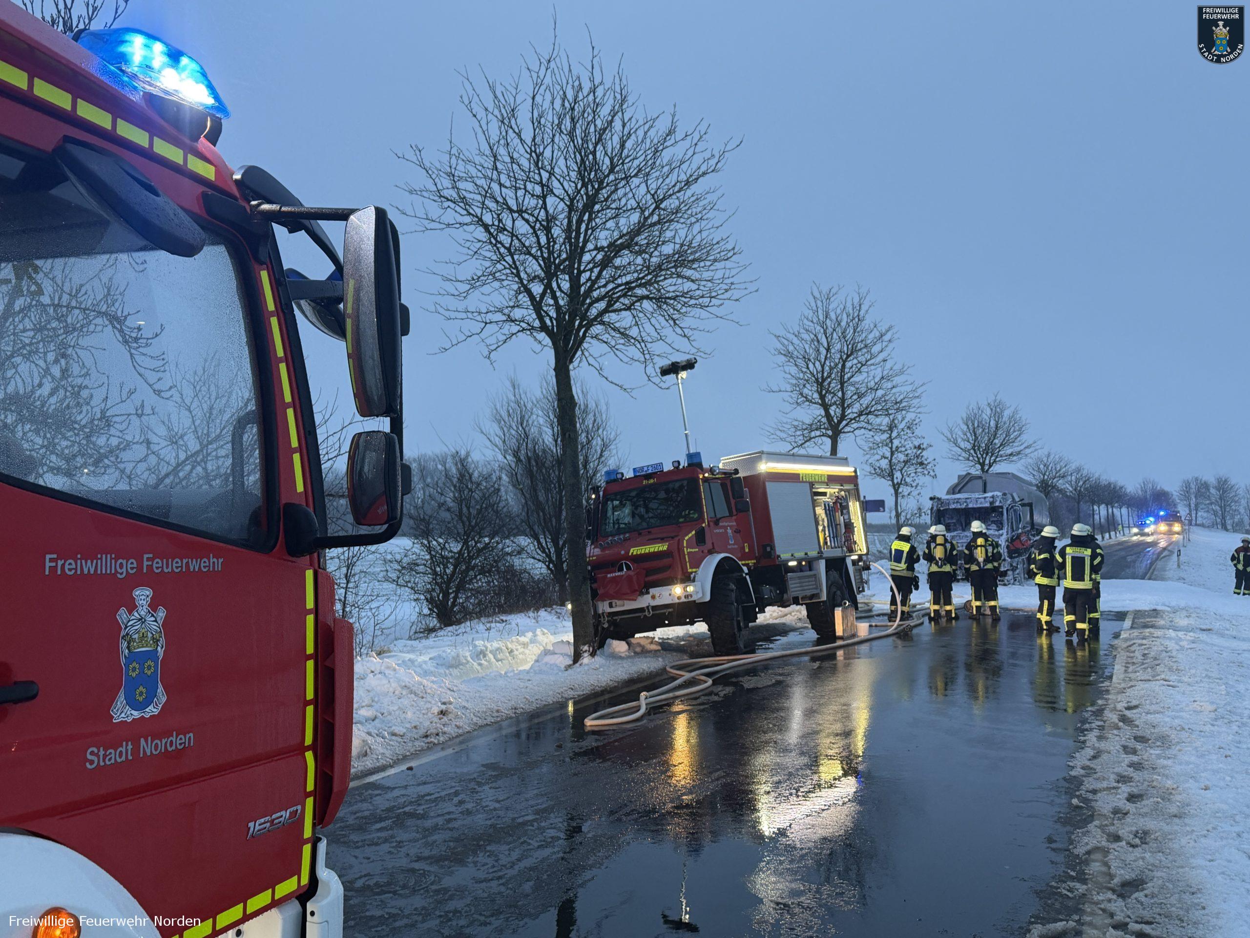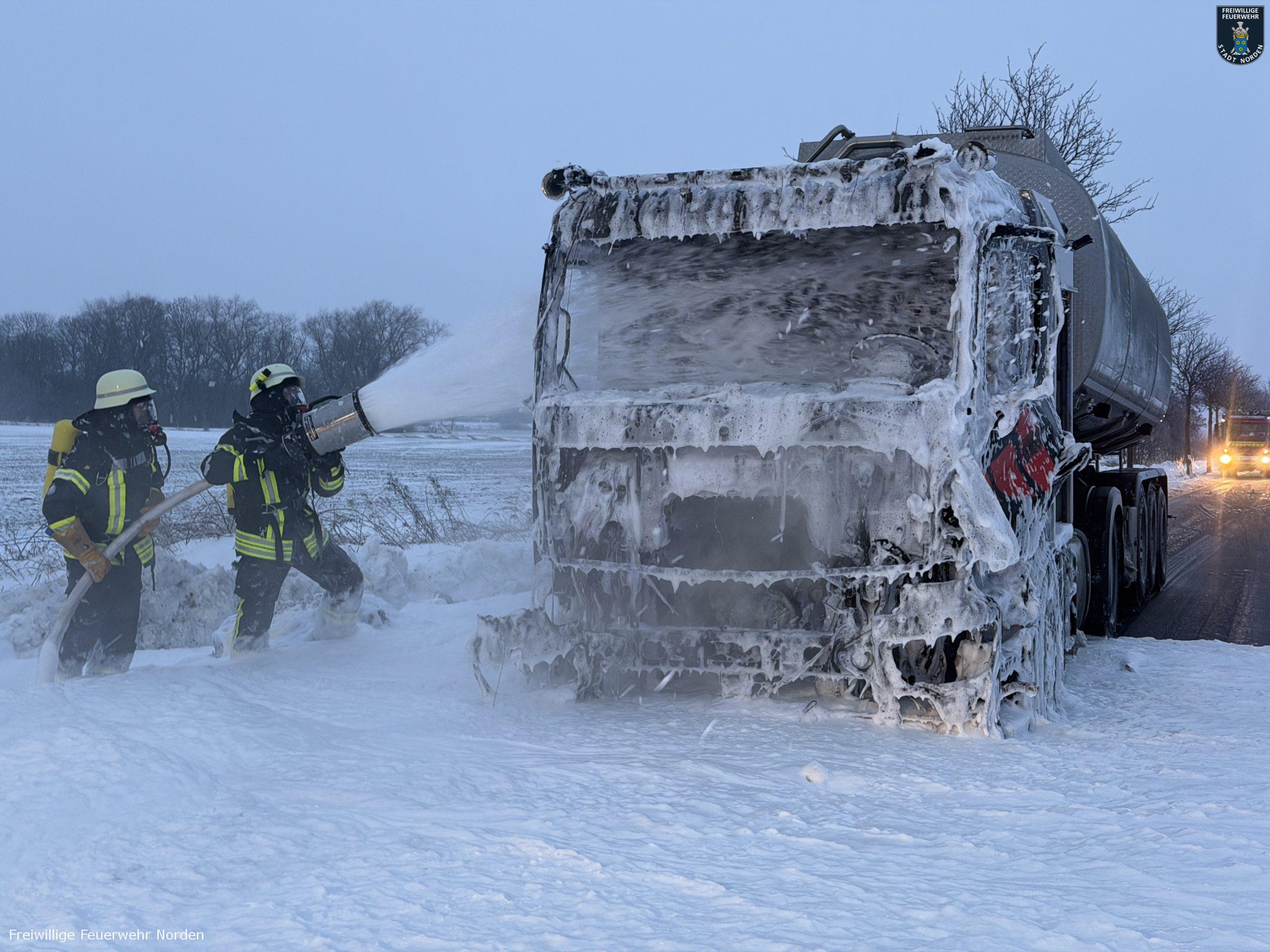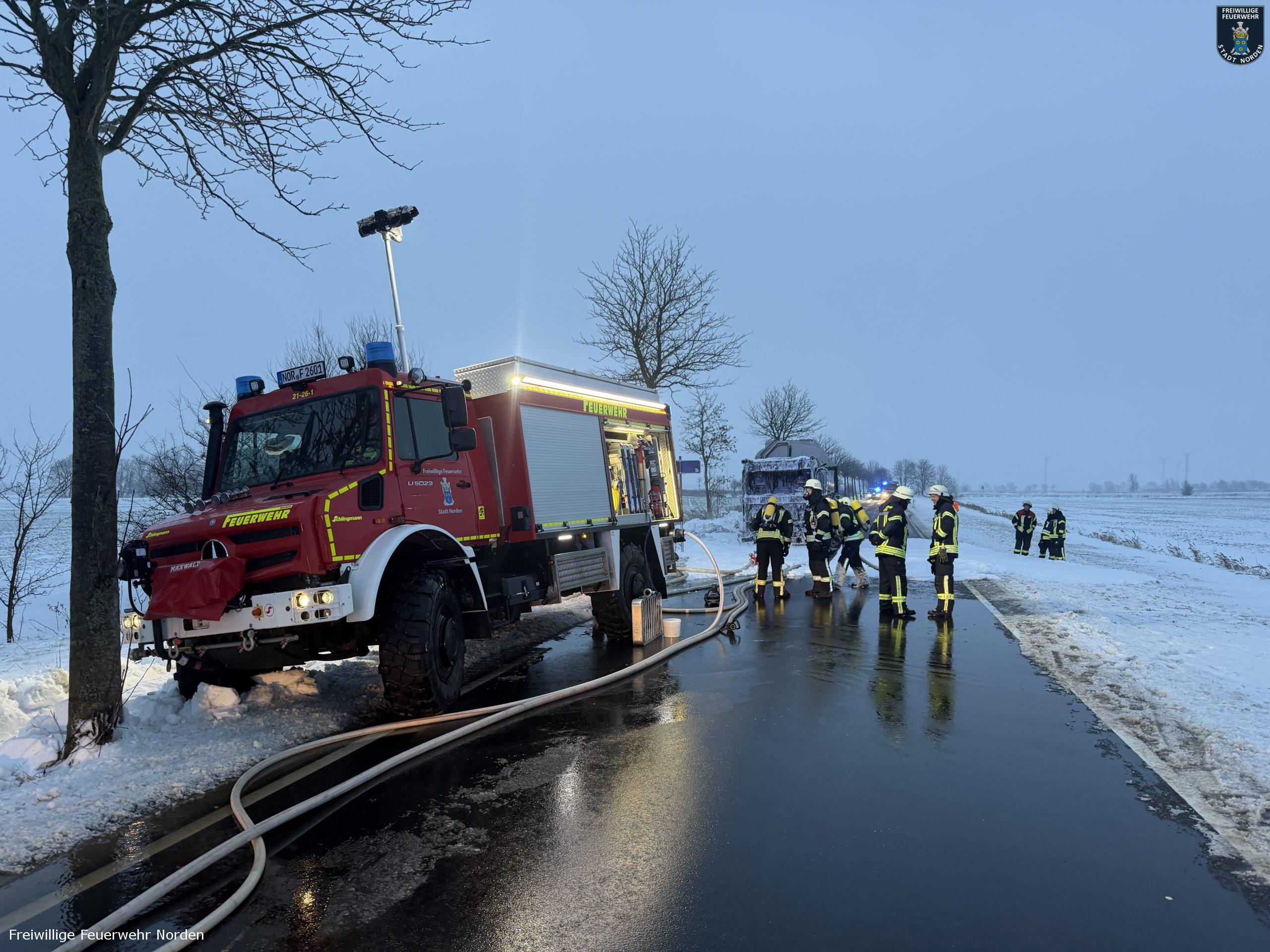 Die Zugmaschine eines Sattelzugs ist am Montag in Norden in Brand geraten. Das Milchsammelfahrzeug befuhr die Neuwesteeler Straße im Ortsteil Neuwesteel. Gegen 7.40 Uhr bemerkte der Fahrer während der Fahrt, wie auf der Beifahrerseite Rauch aus dem Fahrzeug drang. Er stoppte darauf seinen Lkw und brachte sich in Sicherheit. Er blieb unverletzt. Schnell breiteten sich die Flammen aus und ergriffen das gesamte Fahrerhaus. Die alarmierte Freiwillige Feuerwehr Norden fuhr die abgelegene Einsatzstelle mit mehreren Fahrzeugen vom Standort Leybuchtpolder und Hilfeleistungszentrum an. Die Anfahrt gestaltete sich jedoch wegen extremer Straßenglätte durch Eisregen als herausfordernd.
