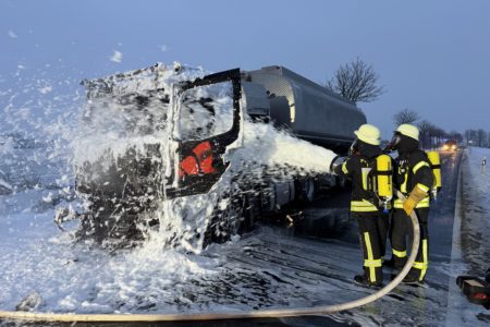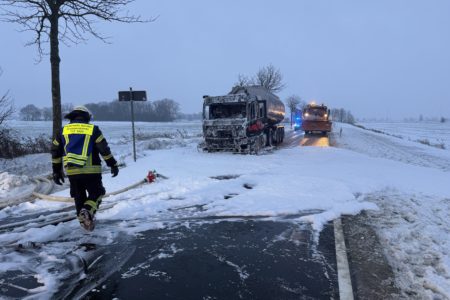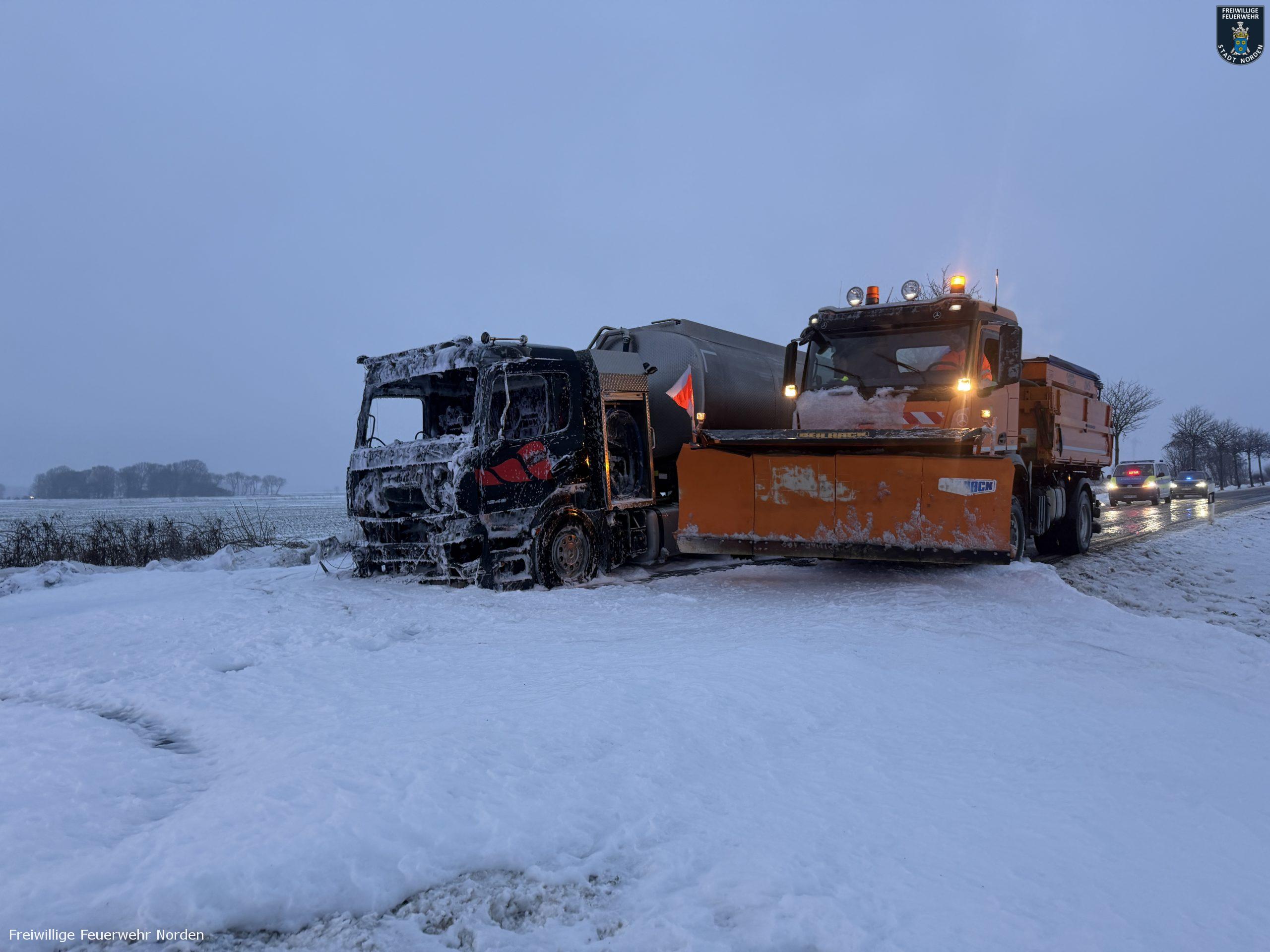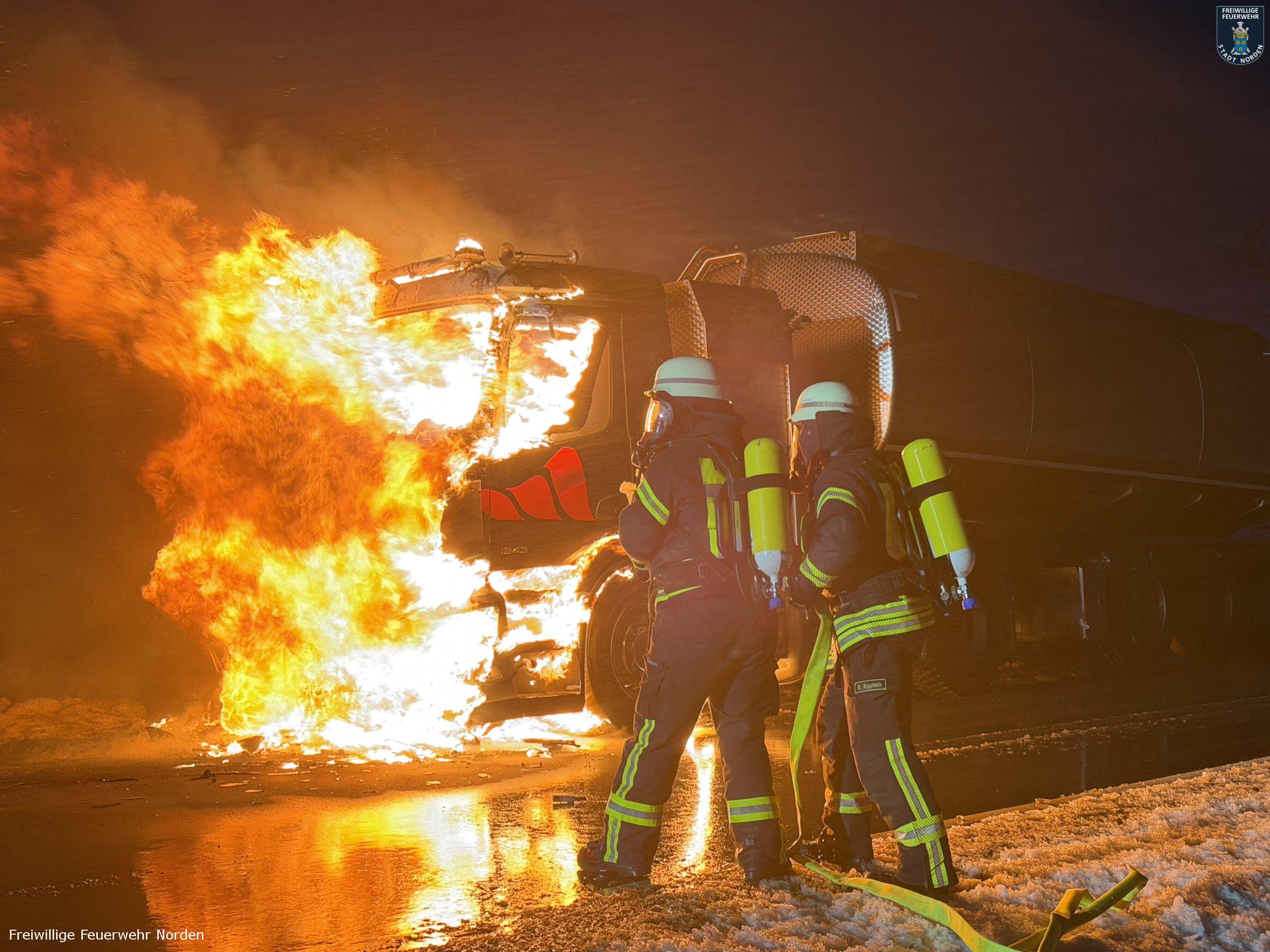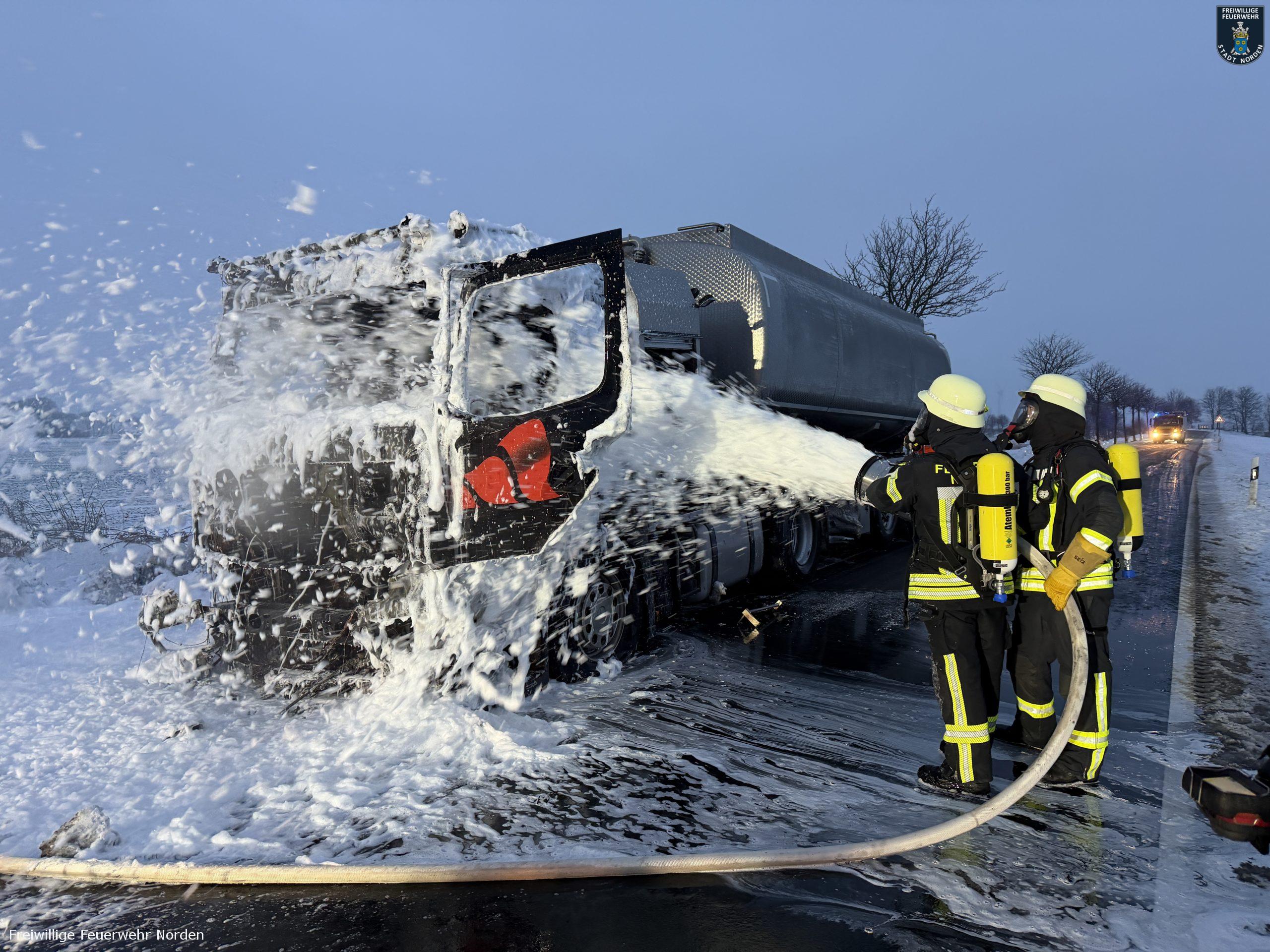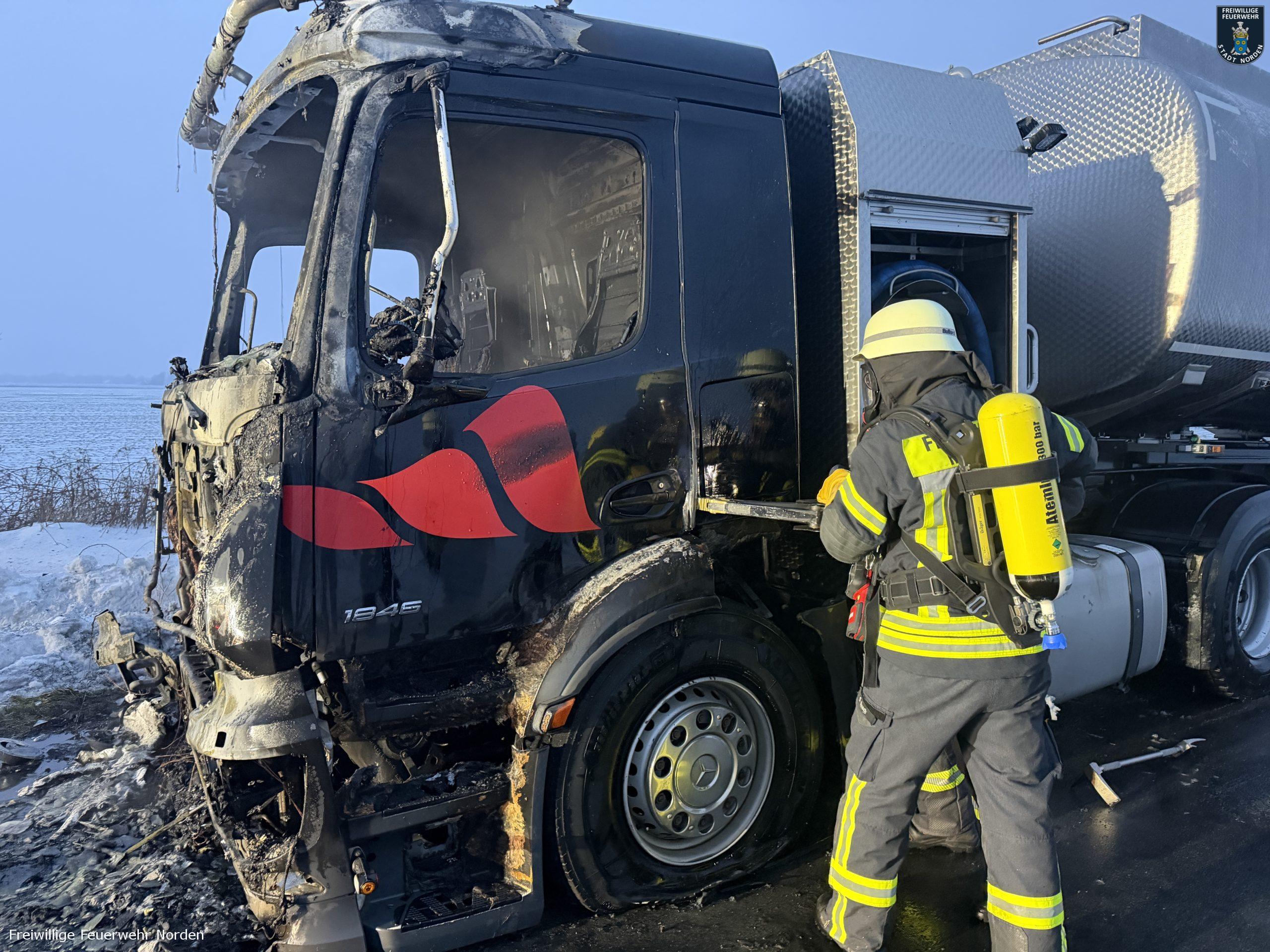 Die Zugmaschine eines Sattelzugs ist am Montag in Norden in Brand geraten. Das Milchsammelfahrzeug befuhr die Neuwesteeler Straße im Ortsteil Neuwesteel. Gegen 7.40 Uhr bemerkte der Fahrer während der Fahrt, wie auf der Beifahrerseite Rauch aus dem Fahrzeug drang. Er stoppte darauf seinen Lkw und brachte sich in Sicherheit. Er blieb unverletzt. Schnell breiteten sich die Flammen aus und ergriffen das gesamte Fahrerhaus. Die alarmierte Freiwillige Feuerwehr Norden fuhr die abgelegene Einsatzstelle mit mehreren Fahrzeugen vom Standort Leybuchtpolder und Hilfeleistungszentrum an. Die Anfahrt gestaltete sich jedoch wegen extremer Straßenglätte durch Eisregen als herausfordernd.