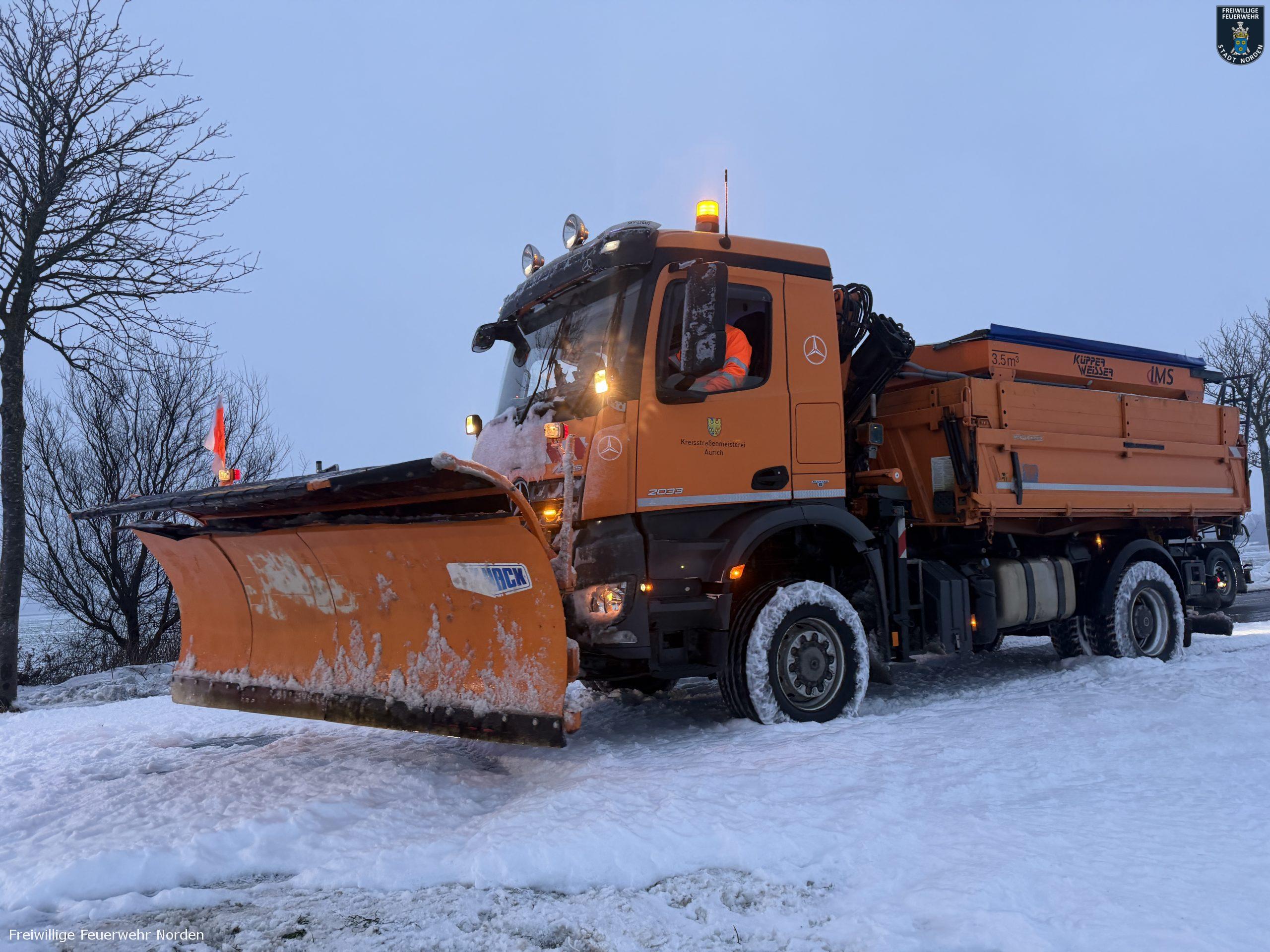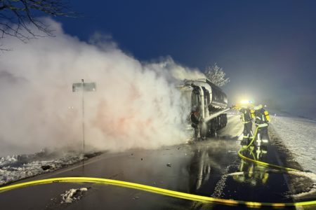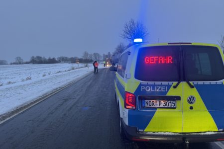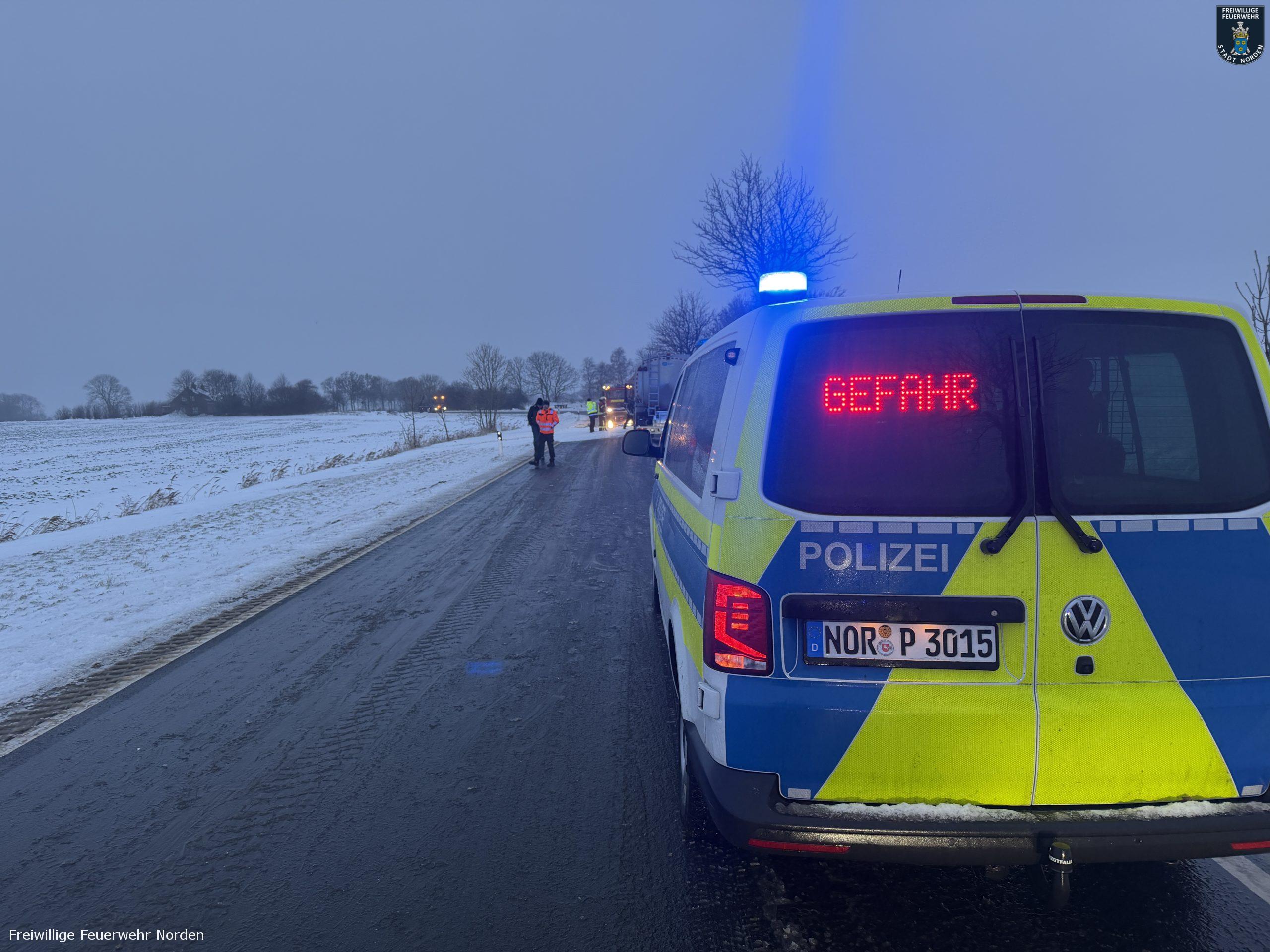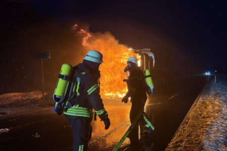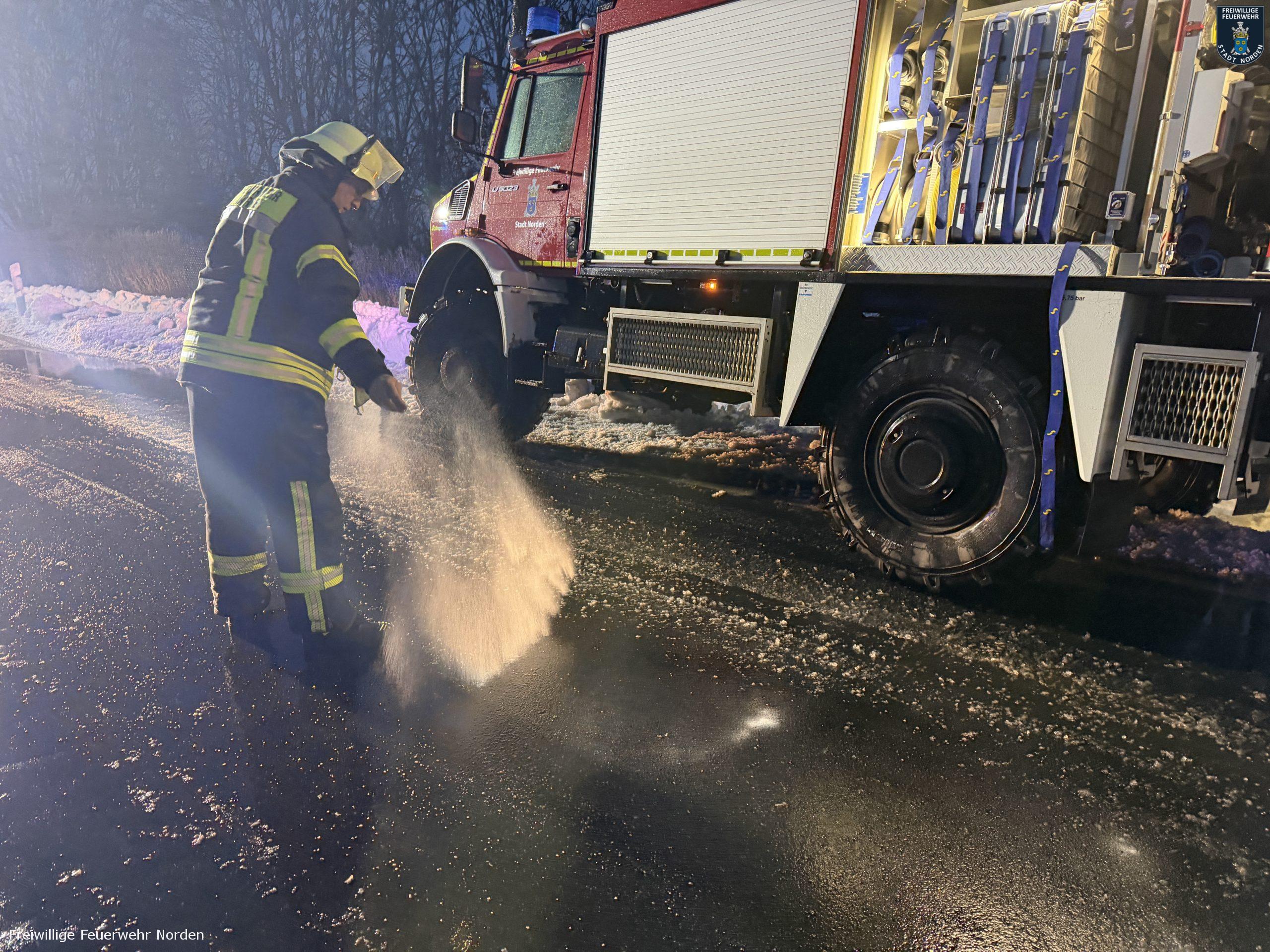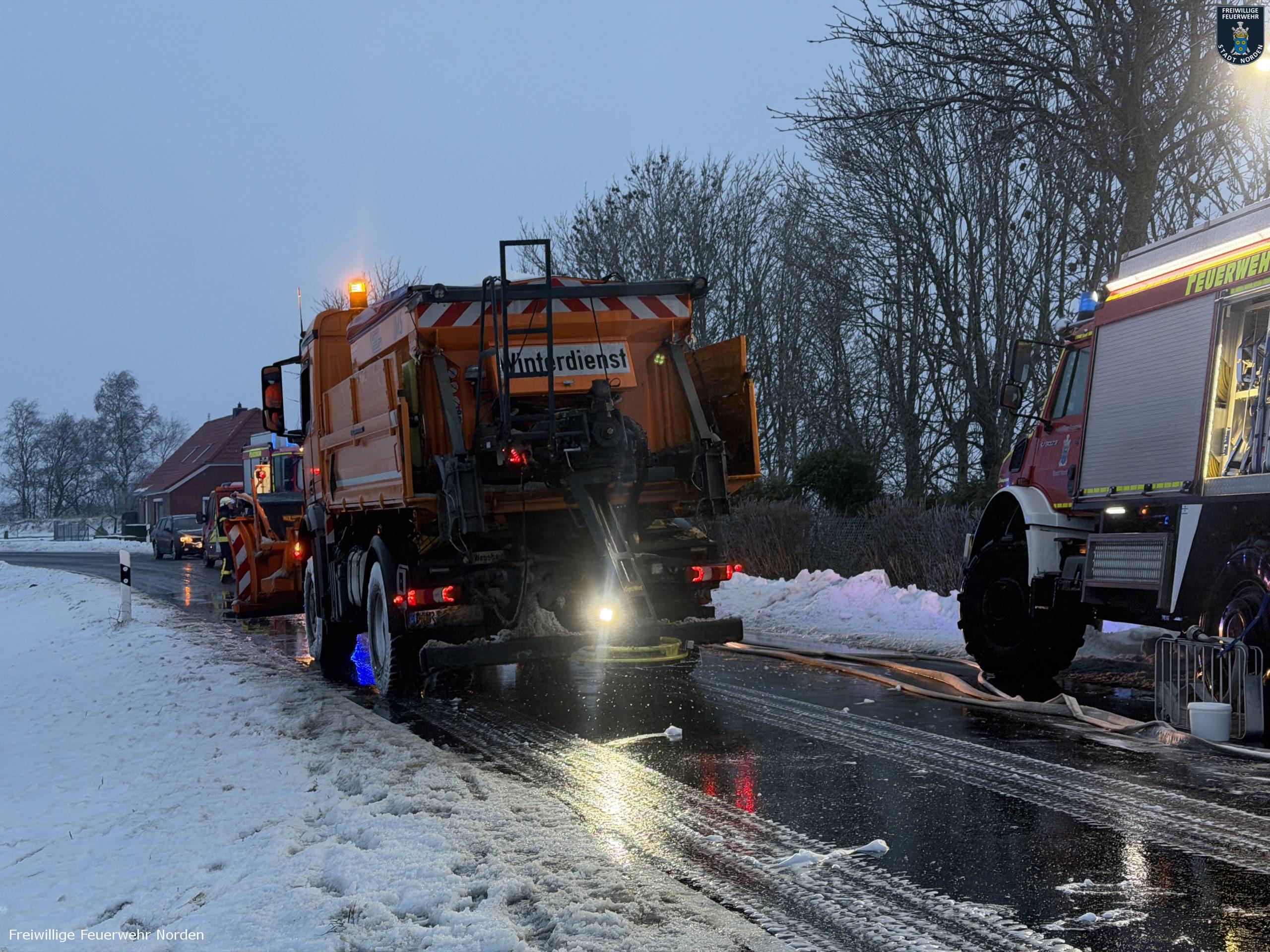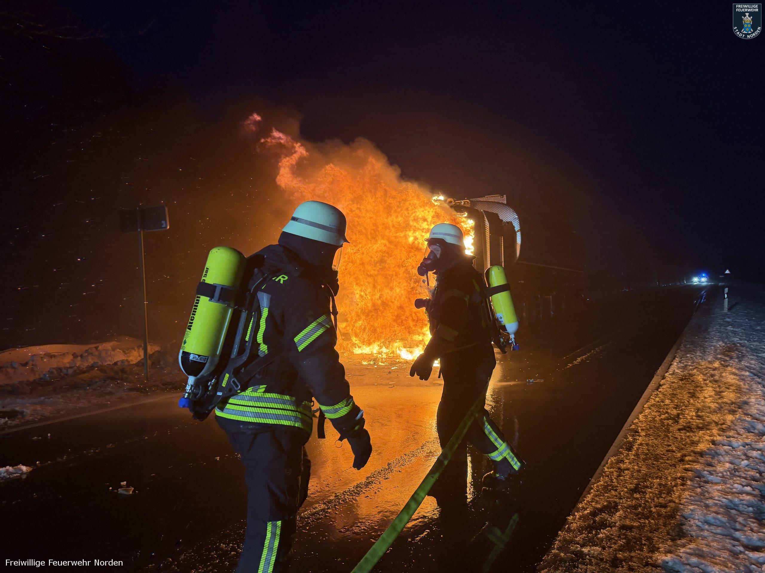 Die Zugmaschine eines Sattelzugs ist am Montag in Norden in Brand geraten. Das Milchsammelfahrzeug befuhr die Neuwesteeler Straße im Ortsteil Neuwesteel. Gegen 7.40 Uhr bemerkte der Fahrer während der Fahrt, wie auf der Beifahrerseite Rauch aus dem Fahrzeug drang. Er stoppte darauf seinen Lkw und brachte sich in Sicherheit. Er blieb unverletzt. Schnell breiteten sich die Flammen aus und ergriffen das gesamte Fahrerhaus. Die alarmierte Freiwillige Feuerwehr Norden fuhr die abgelegene Einsatzstelle mit mehreren Fahrzeugen vom Standort Leybuchtpolder und Hilfeleistungszentrum an. Die Anfahrt gestaltete sich jedoch wegen extremer Straßenglätte durch Eisregen als herausfordernd.
