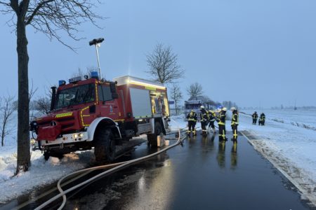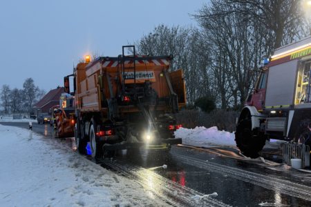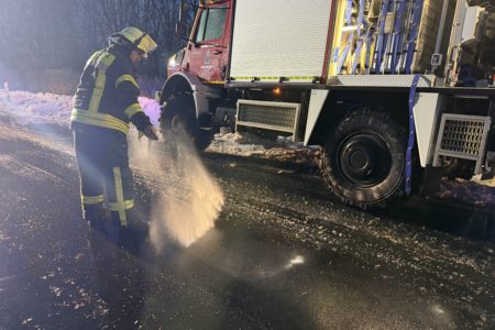 Auch die Einsatzstelle selbst war von Eis überzogen. Die Feuerwehrleute sowie ein angeforderter Streuwagen der Kreisstraßenmeisterei streuten vor Ort Streusalz und sorgten so für sichere Arbeitsbedingungen. Auch wenn die Zugmaschine nicht mehr zu retten war, so konnte die Feuerwehr ein Übergreifen auf den teilgefüllten Tankwagen verhindern. Zur Brandbekämpfung kam auch Schaum zum Einsatz. Für die Sicherstellung der Löschwasserversorgung kam das Tanklöschfahrzeug zum Einsatz. Ein nahgelegener Hydrant war mit Schnee bedeckt und somit nicht nutzbar. Die Feuerwehr konnte den Einsatzort nach eineinhalb Stunden verlassen. Die Bergungs- und Reinigungsarbeiten haben noch mehrere Stunden angedauert.