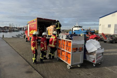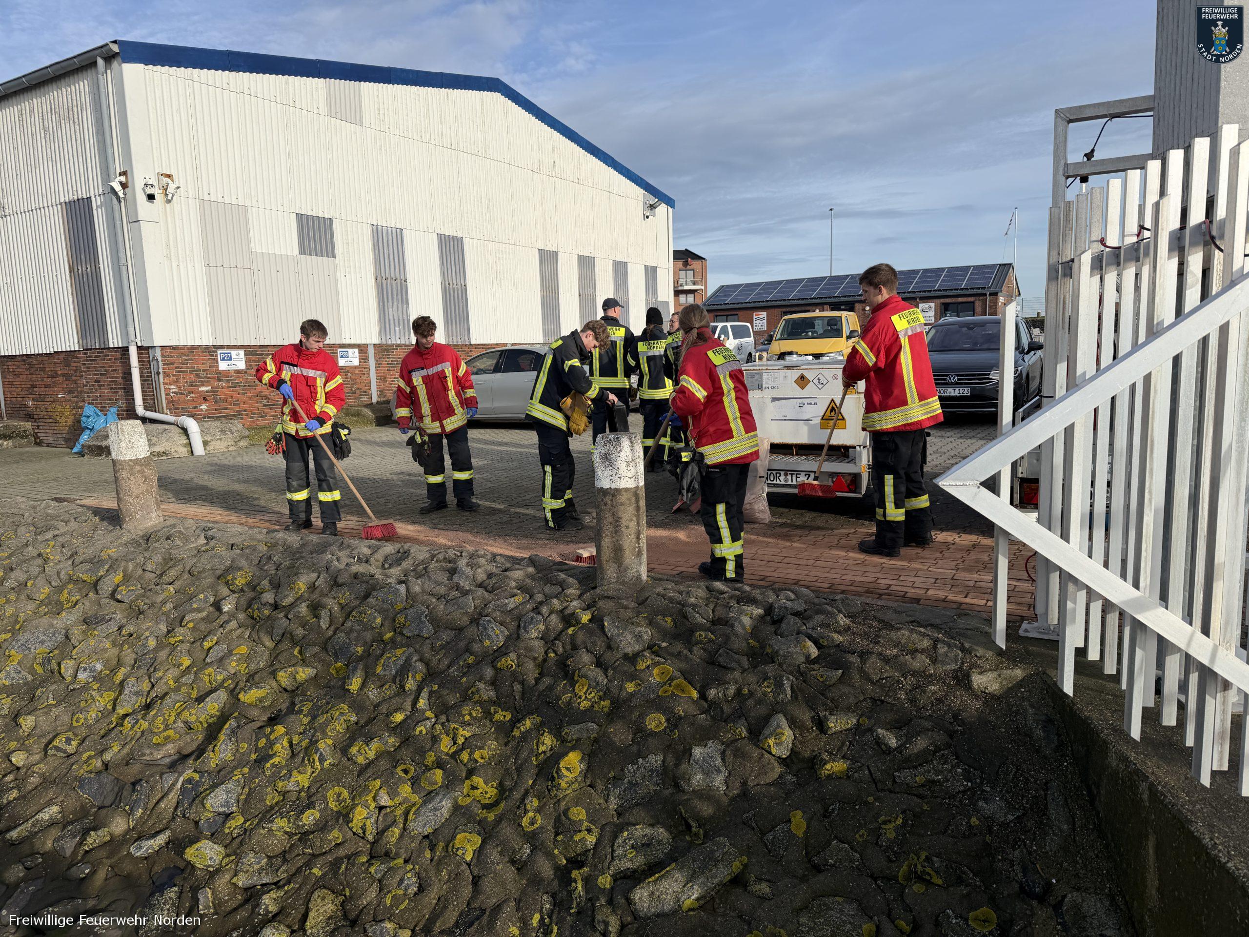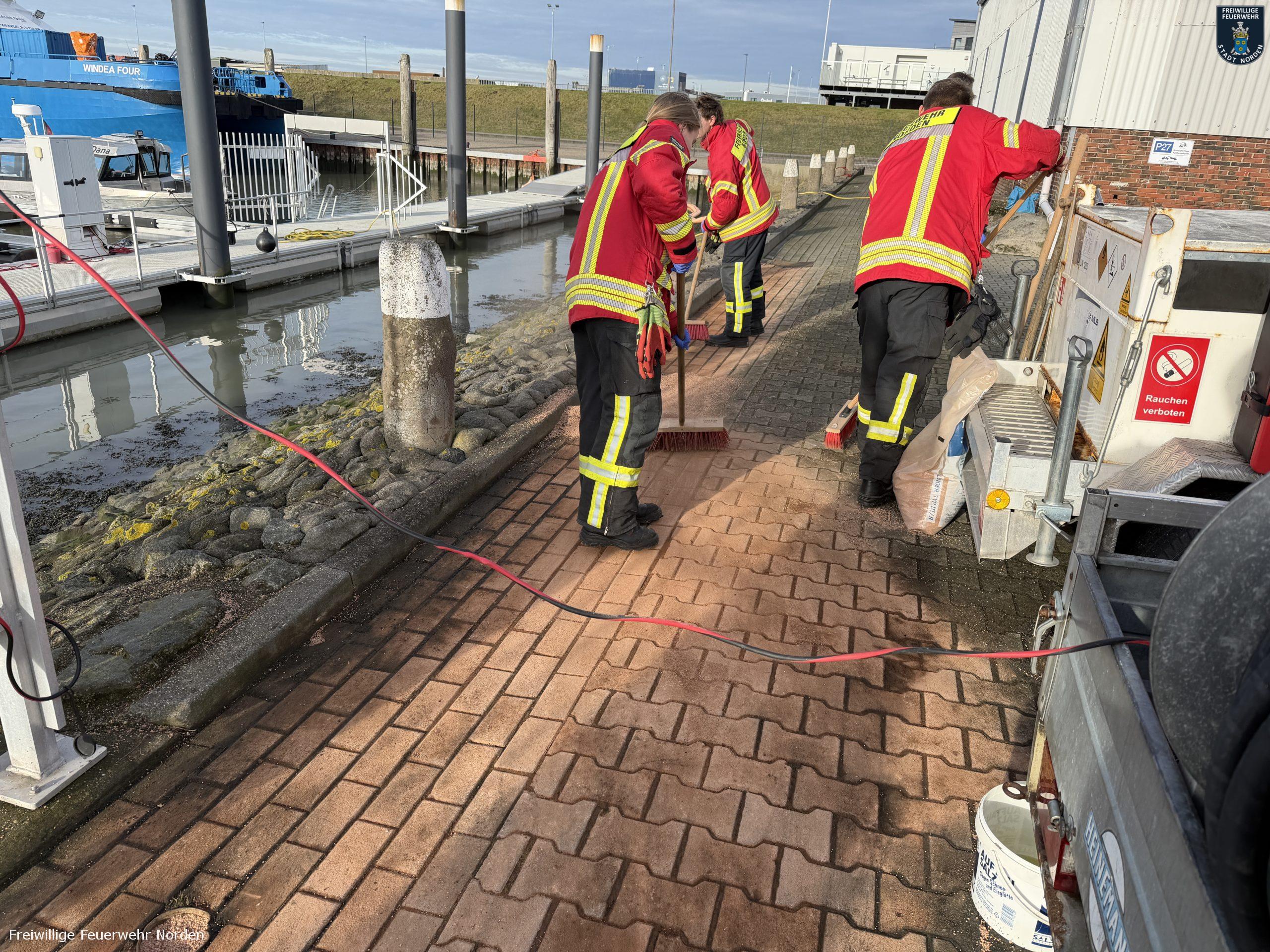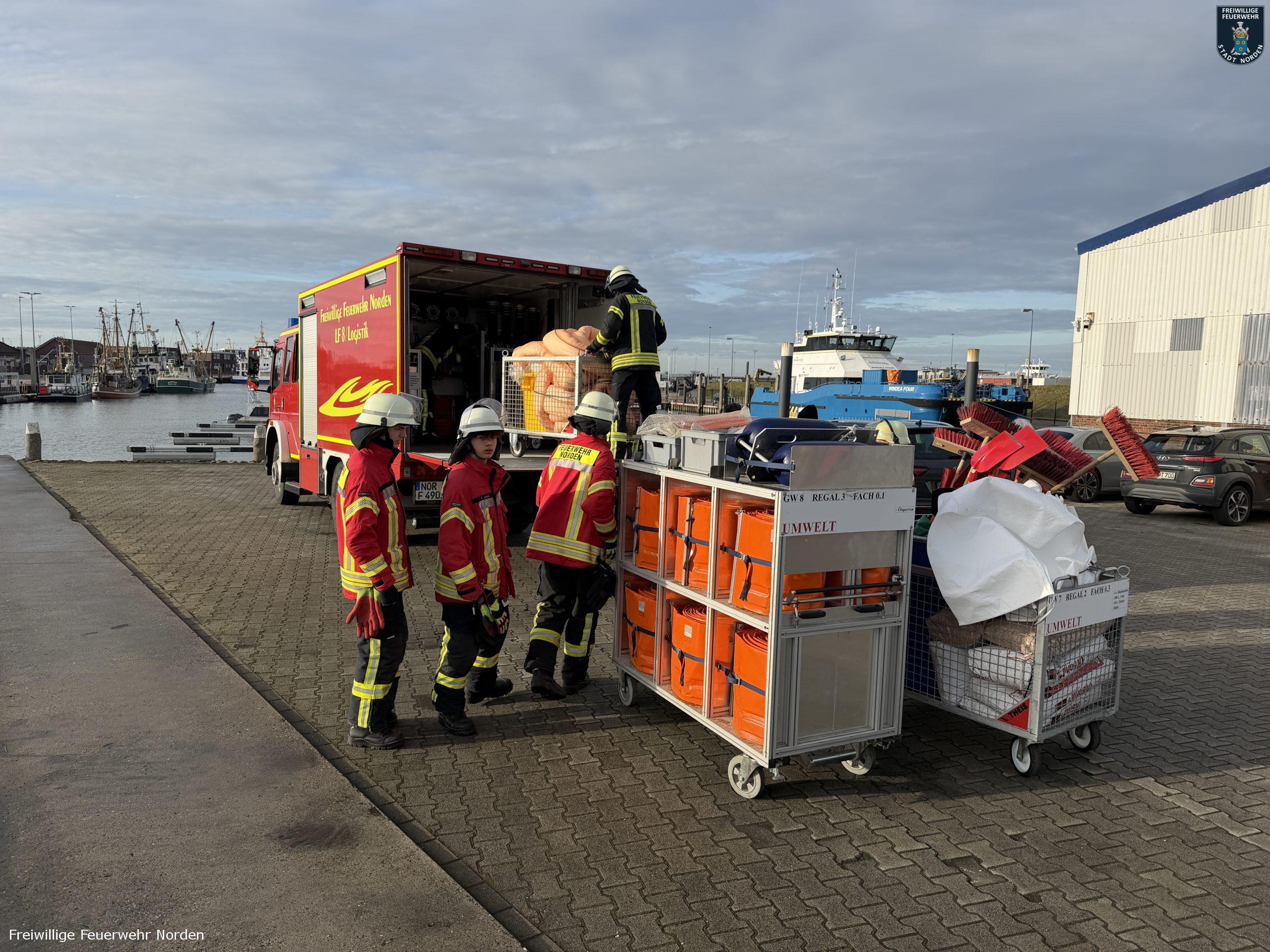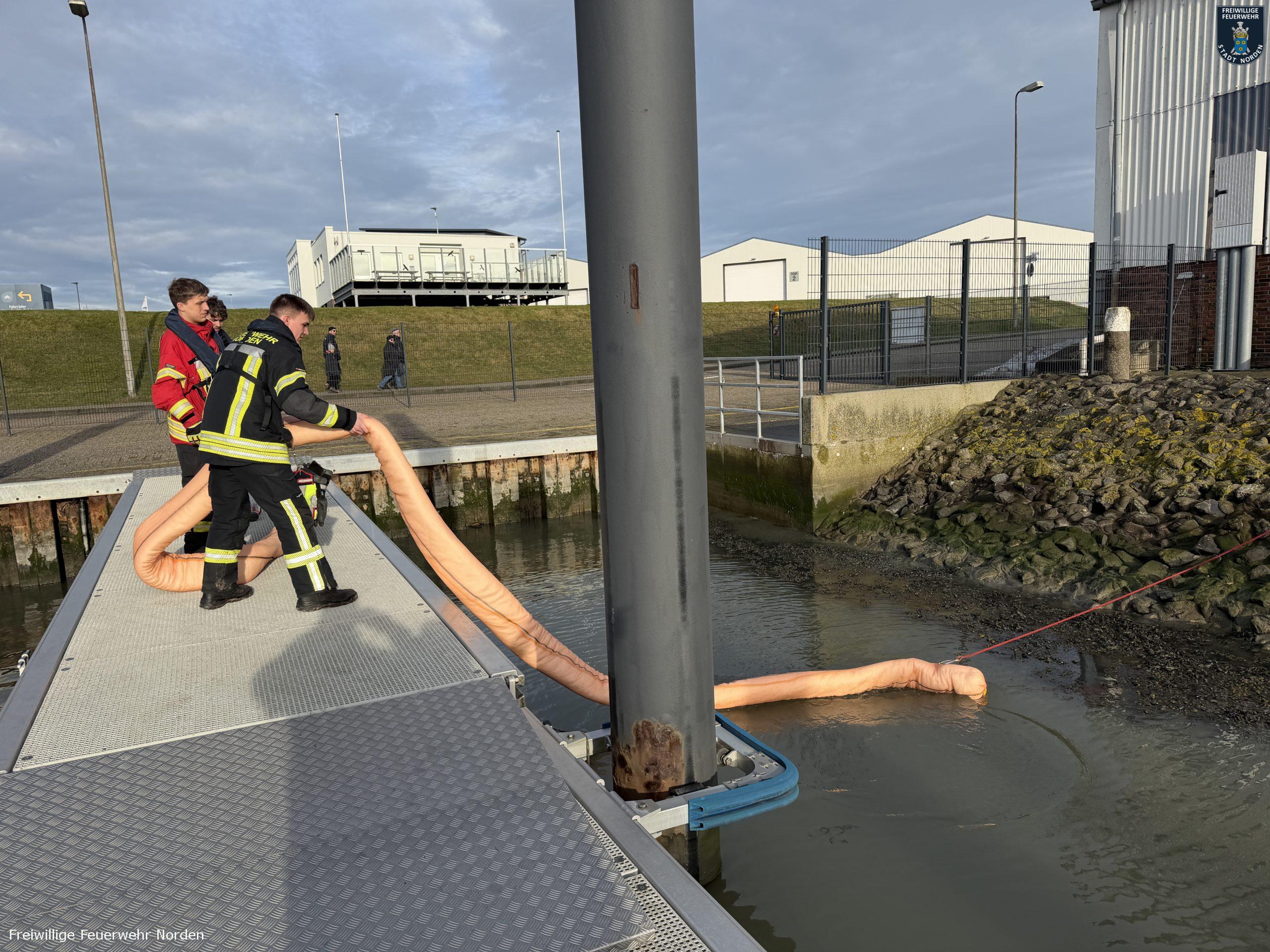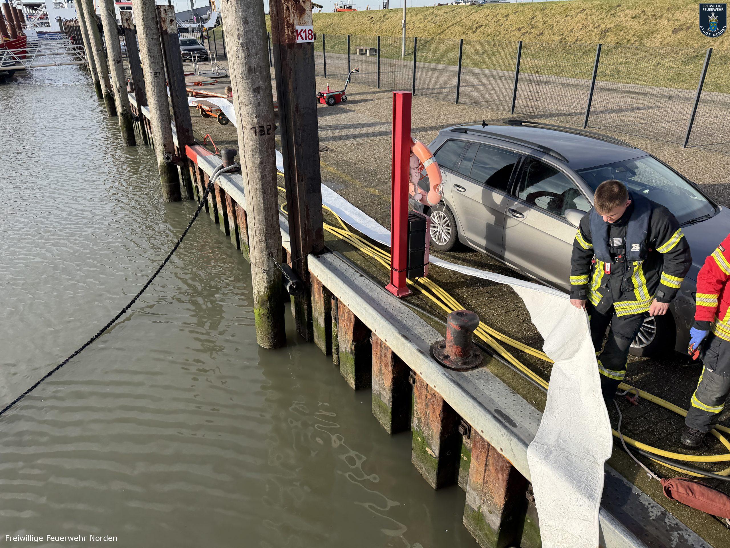 Im Norddeicher Osthafen ist am Sonnabendvormittag Benzin ausgelaufen und ins Hafenbecken gelangt. Der Kraftstoff trat aus einer mobilen Tankanlage auf einem Anhänger aus und lief über die Oberflächenentwässerung in den Hafen. Der Verursacher schätzte die ausgelaufene Menge auf bis zu 70 Liter. Er benachrichtigte die Freiwillige Feuerwehr Norden, die sich mit Ölsperren und Bindemittel um die ausgelaufene Flüssigkeit kümmerte. Die Einsatzkräfte erreichte die Alarmierung während der diesjährigen Weihnachtsbaumsammelaktion. Das Fahrzeug am Sammelpunkt im Ortsteil Bargebur rückte daraufhin von dort ab.