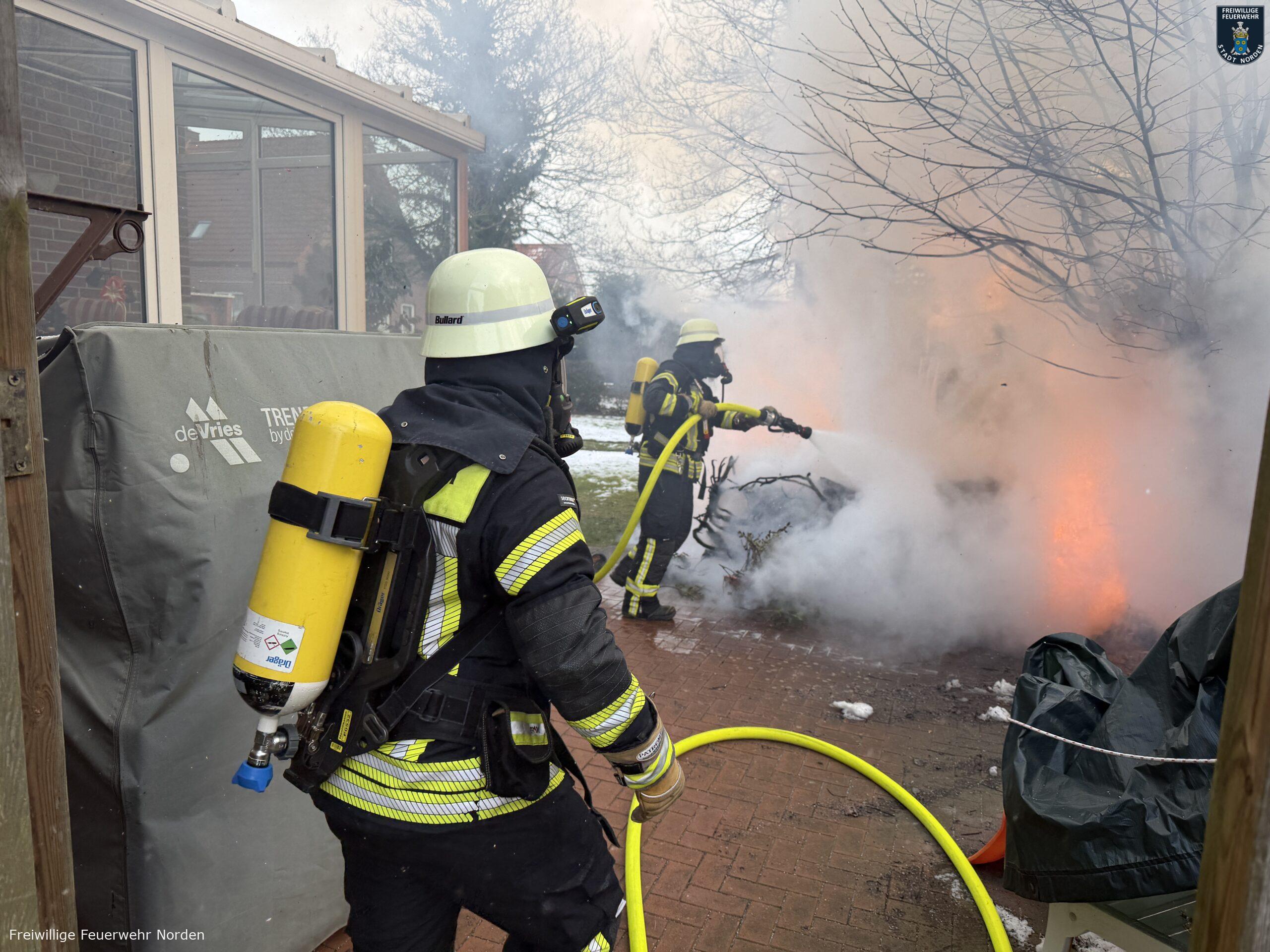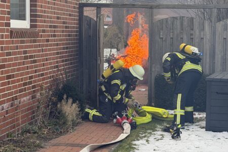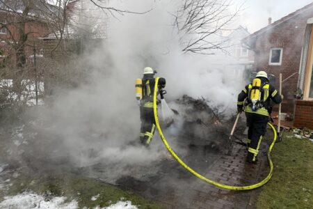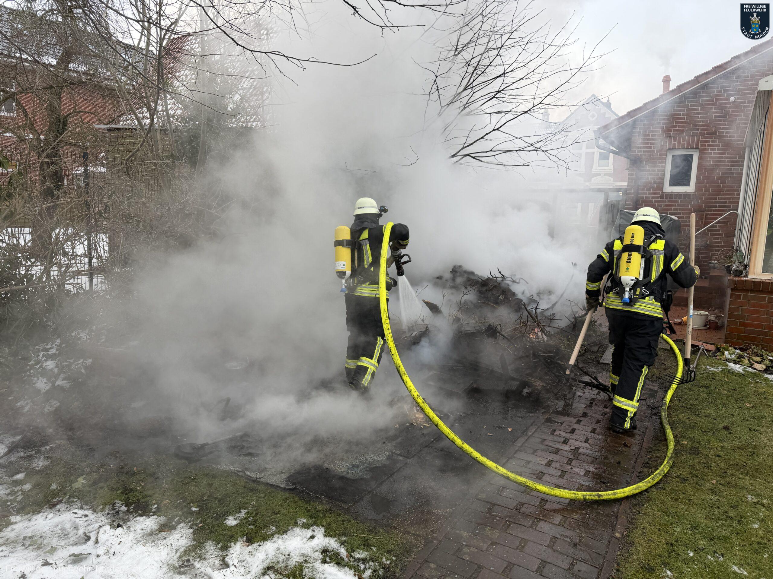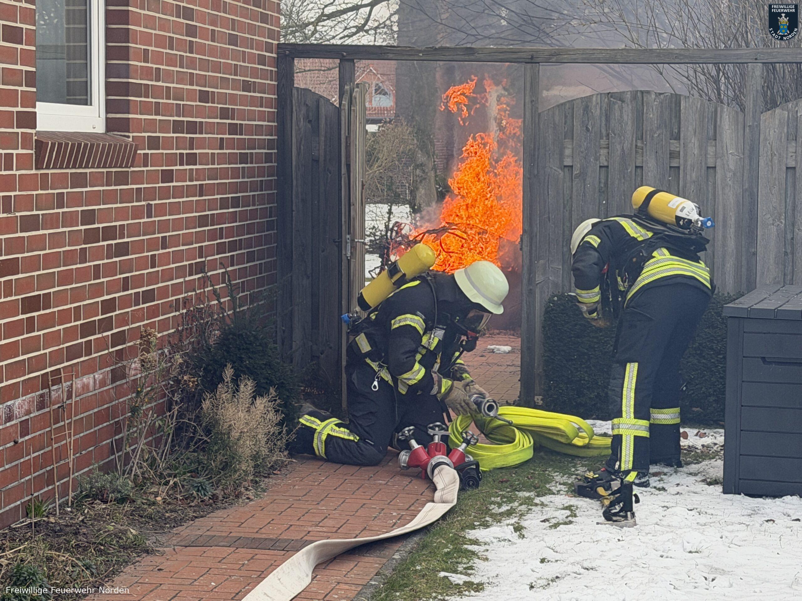 Im Zentrum von Norden hat am Dienstagvormittag ein Gartenhaus gebrannt. Gegen 9 Uhr ging der erste Notruf aus der Bleicherslohne bei der Leitstelle Ostfriesland ein. Ein zirka drei mal drei Meter großer Holzschuppen stand dort in Vollbrand. Die Flammen bedrohten ein nahestehendes Einfamilienhaus. Bei Ankunft der Freiwilligen Feuerwehr Norden waren bereits die Scheiben von einem daran angebauten Wintergarten durch die Hitze geplatzt.