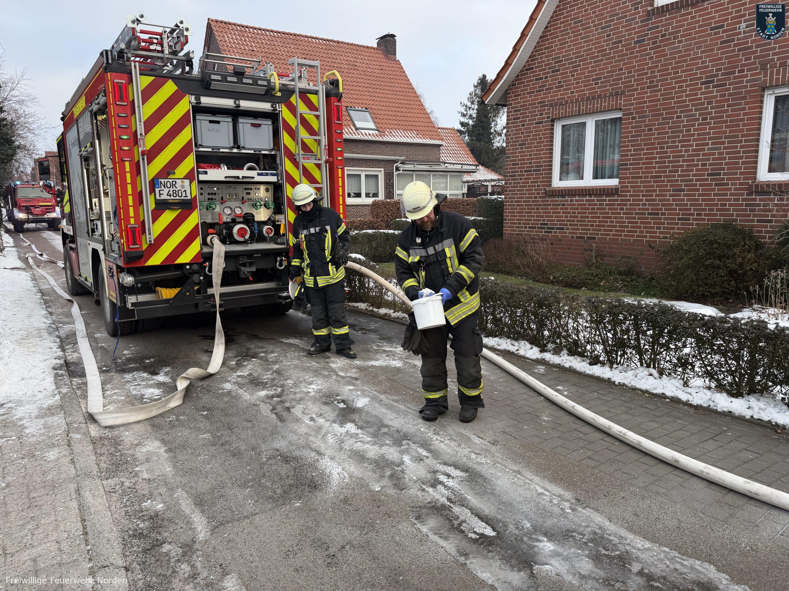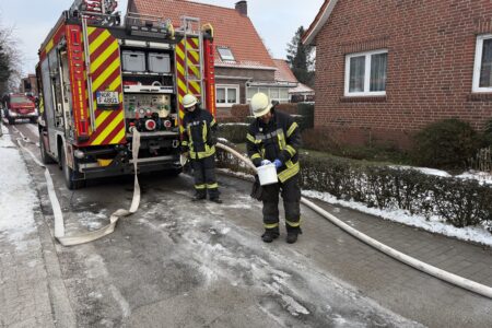 Ein Atemschutztrupp konnte die Flammen schnell unter Kontrolle bringen und den Brand löschen. Die Gefahr für das Wohnhaus war damit gebannt. Für die Einsatzkräfte wuchs die Gefahr jedoch durch Glatteis. Löschwasser gefror bei Minus 5 Grad blitzschnell und sorgte für Rutschgefahr. Die Feuerwehrleute streuten die Einsatzstelle daher mit Streusalz ab.
