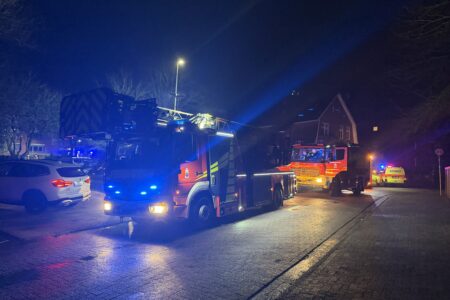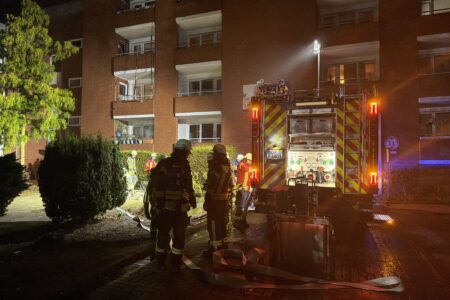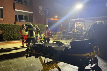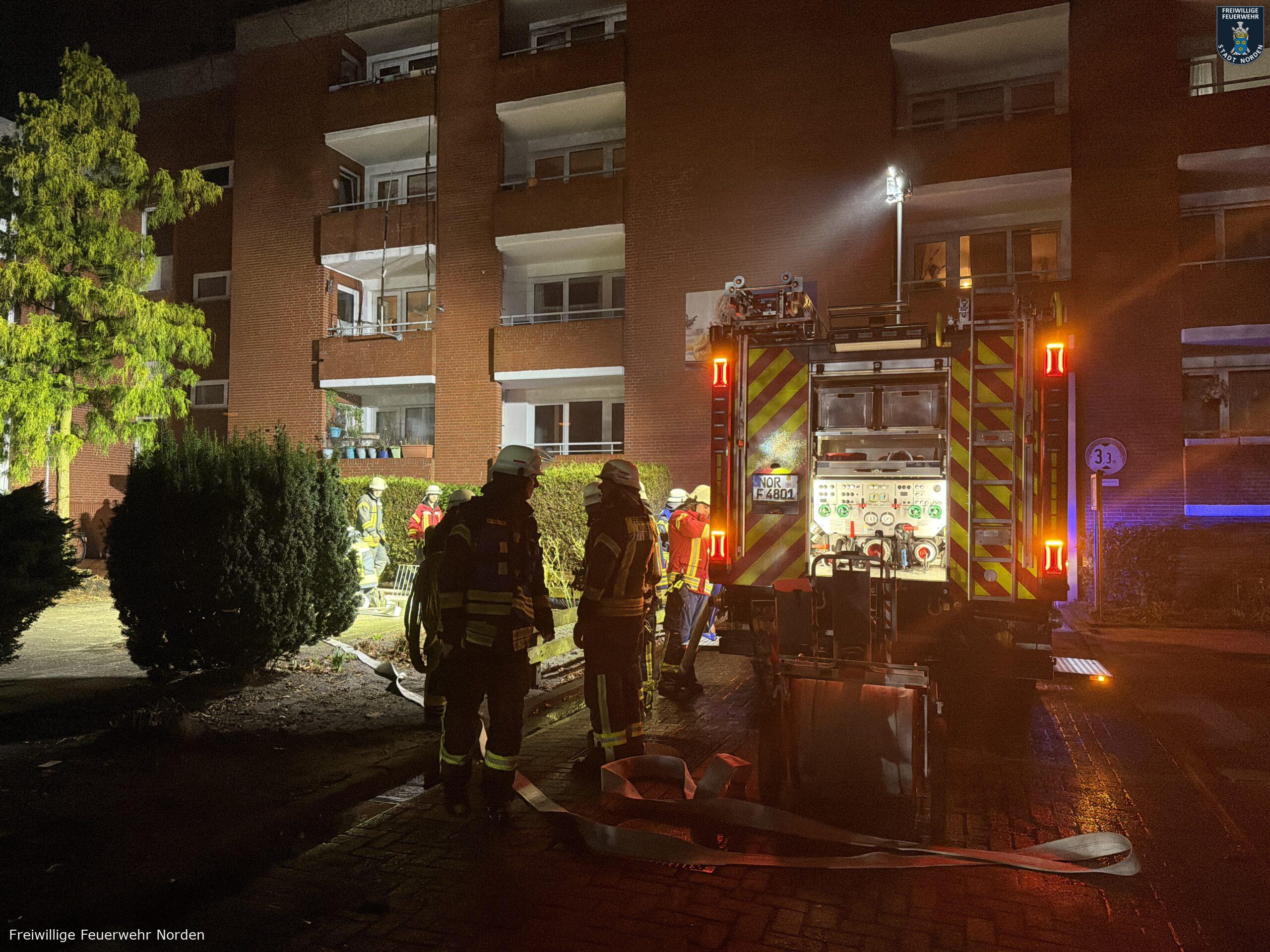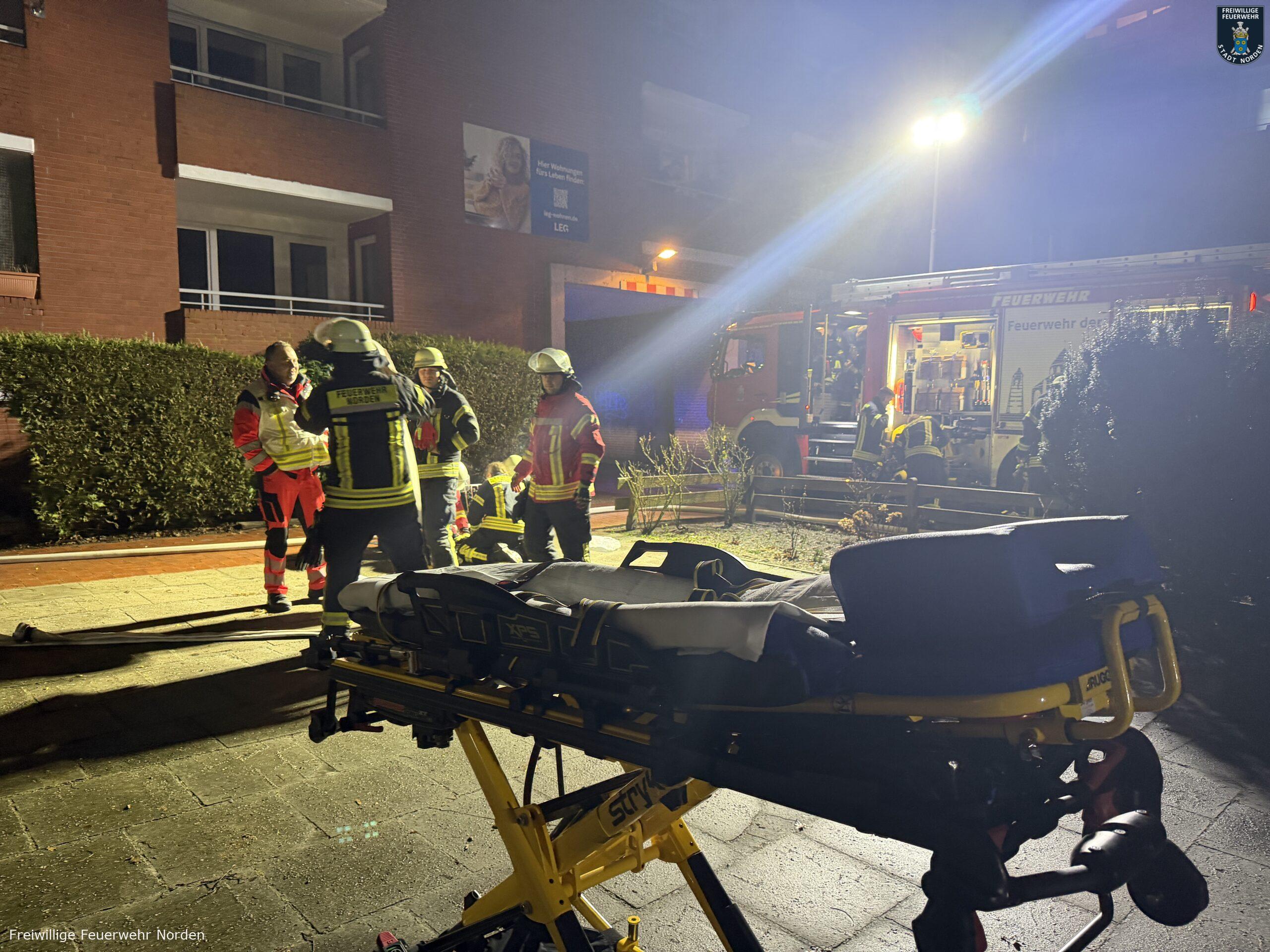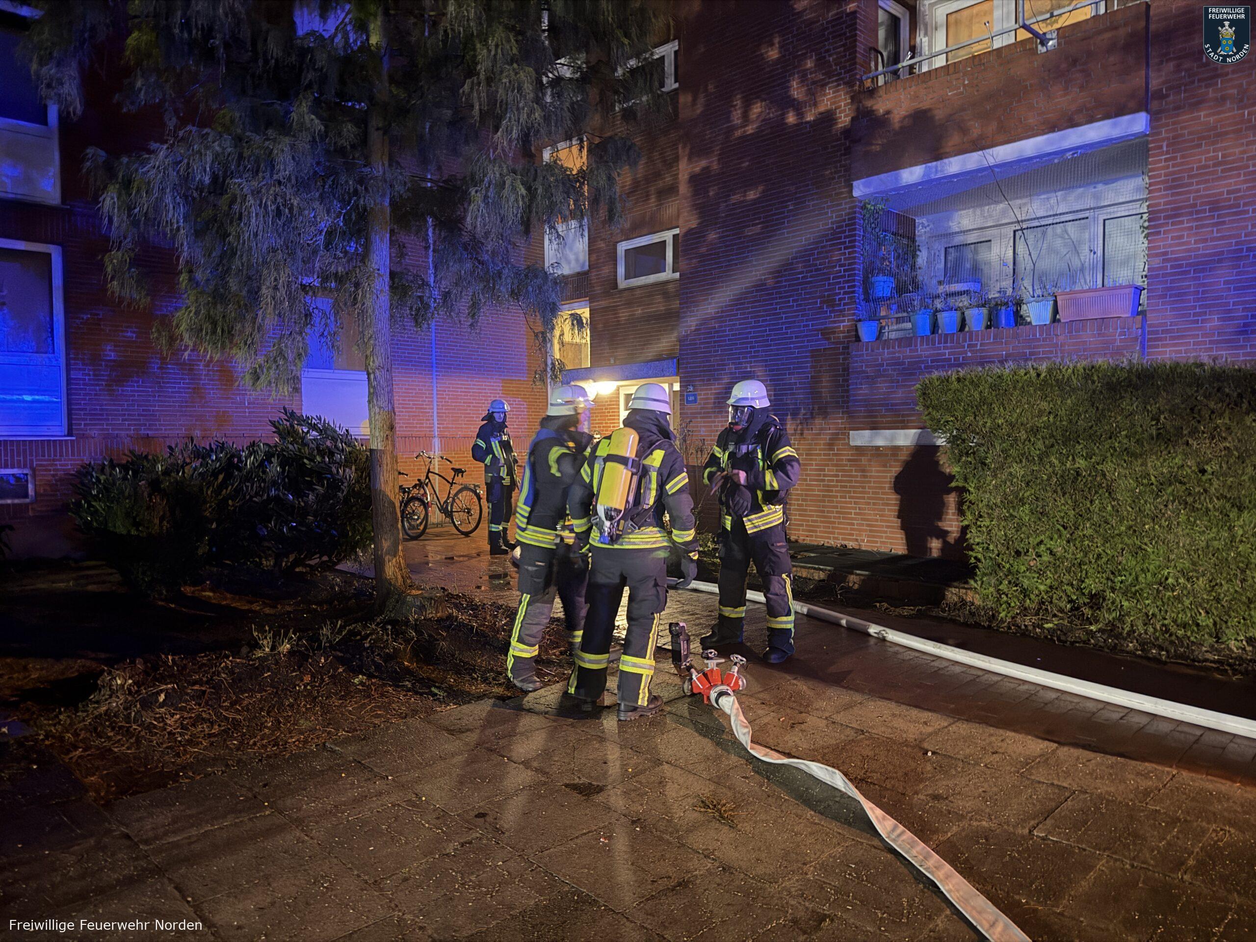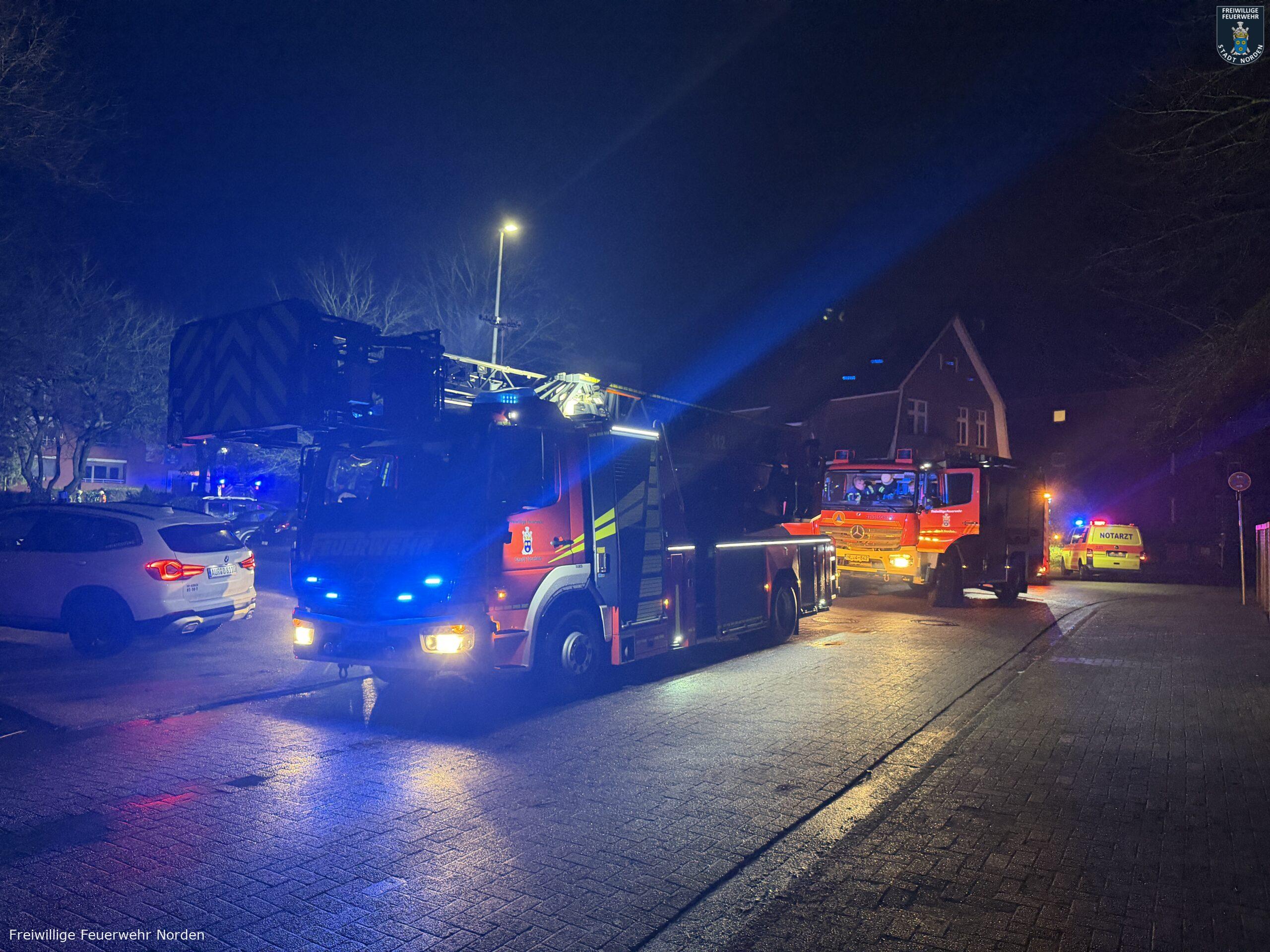 Einen erkrankten Mann hat die Freiwillige Feuerwehr Norden am späten Freitagabend aus seiner verrauchten Wohnung gerettet. Bewohner eines Mehrparteienhauses in der Kirchstraße hatten zunächst gegen 23 Uhr den Alarmton eines Heimrauchmelders im Gebäude gehört und den Notruf gewählt. Bei der Erkundung stellten die Feuerwehrleute Brandgeruch in einem Flur im ersten Obergeschoss fest. Weitere Bewohner gaben den Hinweis, dass in der Wohnung ein älterer Mann wohnt und dieser sich mit großer Wahrscheinlichkeit in der Wohnung befindet. Inzwischen waren in der Wohnung auch mehrere Rauchmelder zu hören. Da der Mann nicht auf heftiges Klopfen der Feuerwehr reagierte, wurde die Alarmstufe auf „Feuer 2 – Menschenleben in Gefahr“ erhöht. Weitere Kräfte der Feuerwehr, das Deutsche Rote Kreuz und auch der Rettungsdienst wurden daraufhin entsandt.