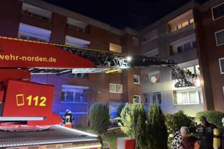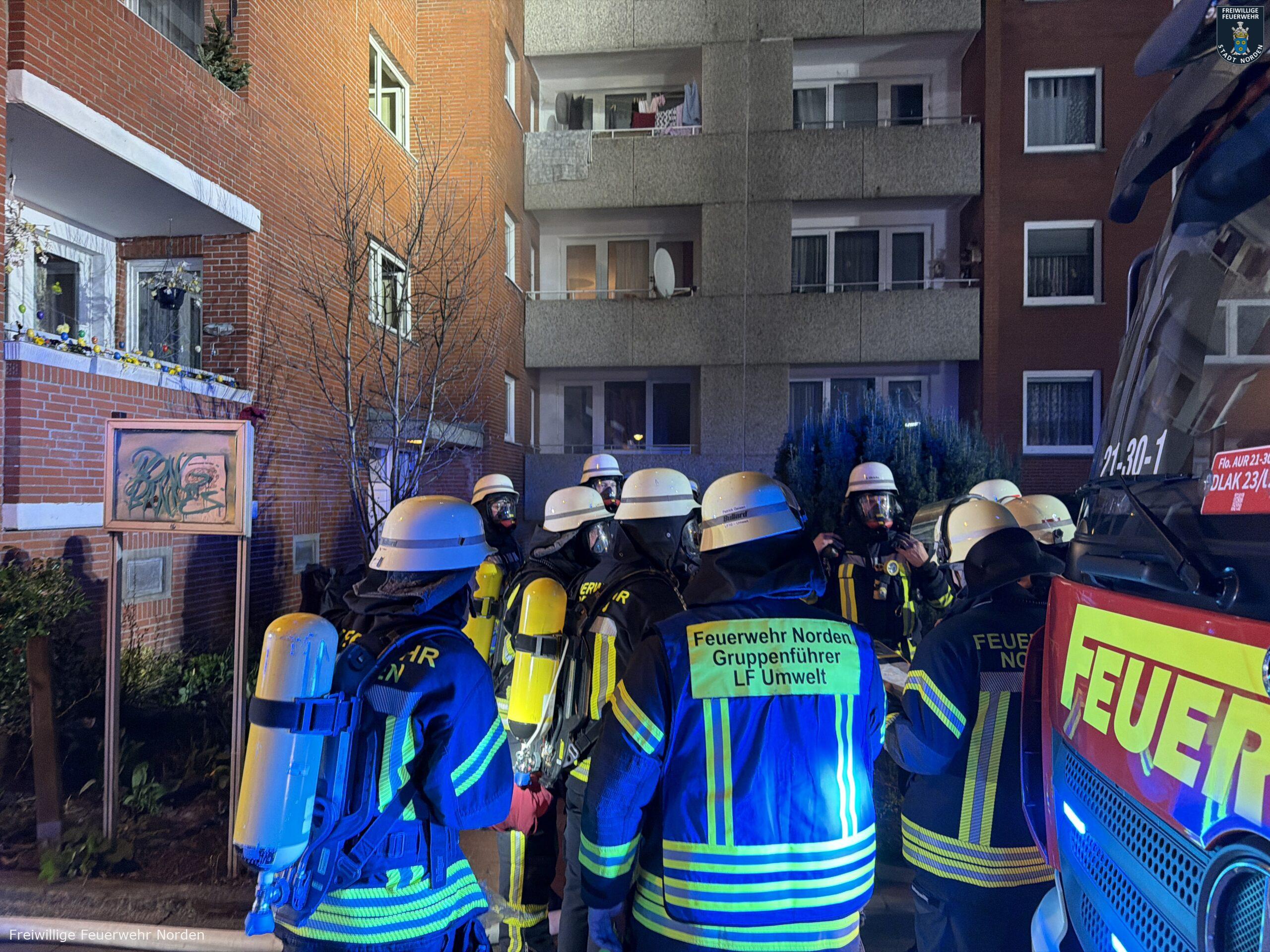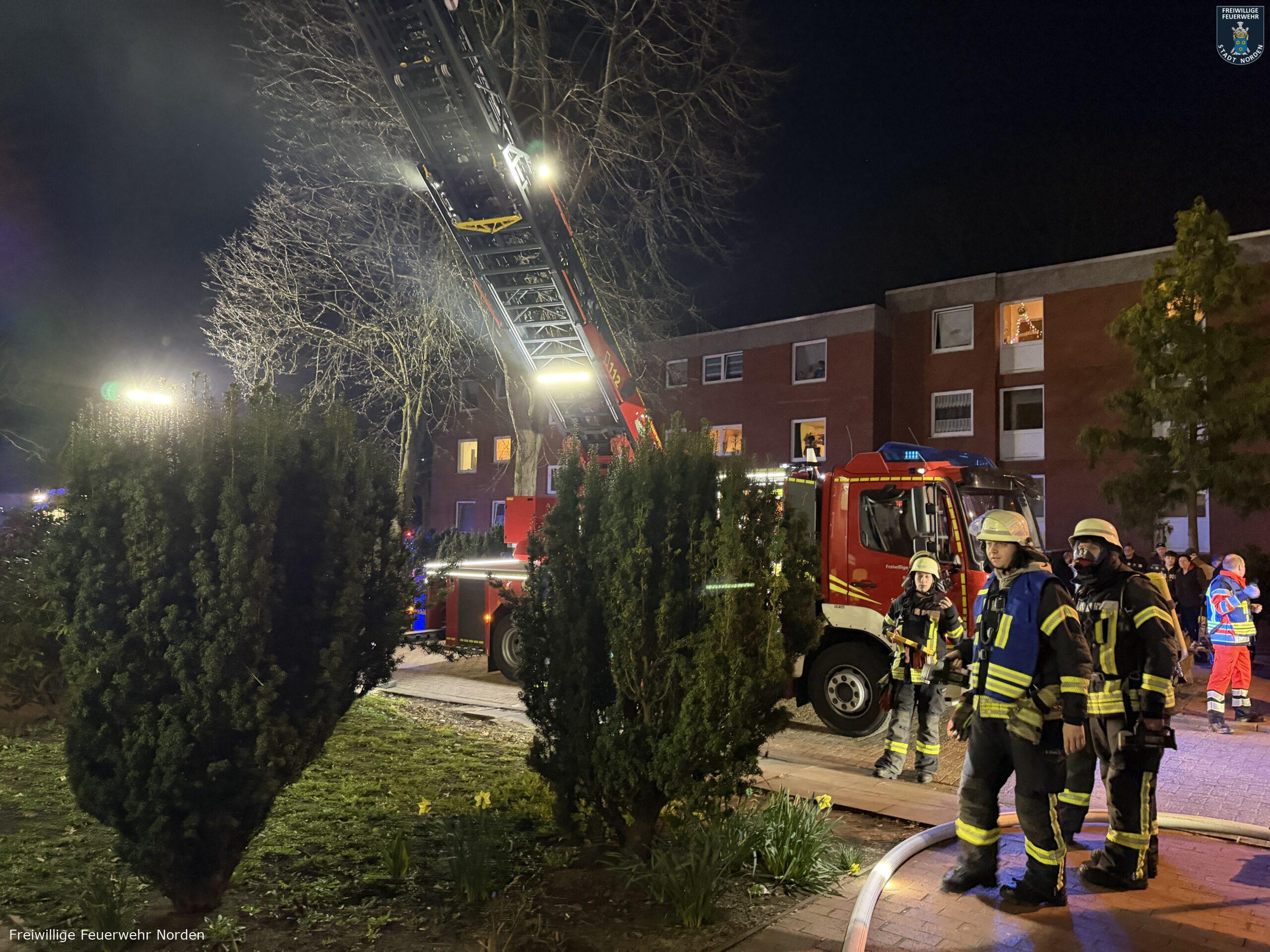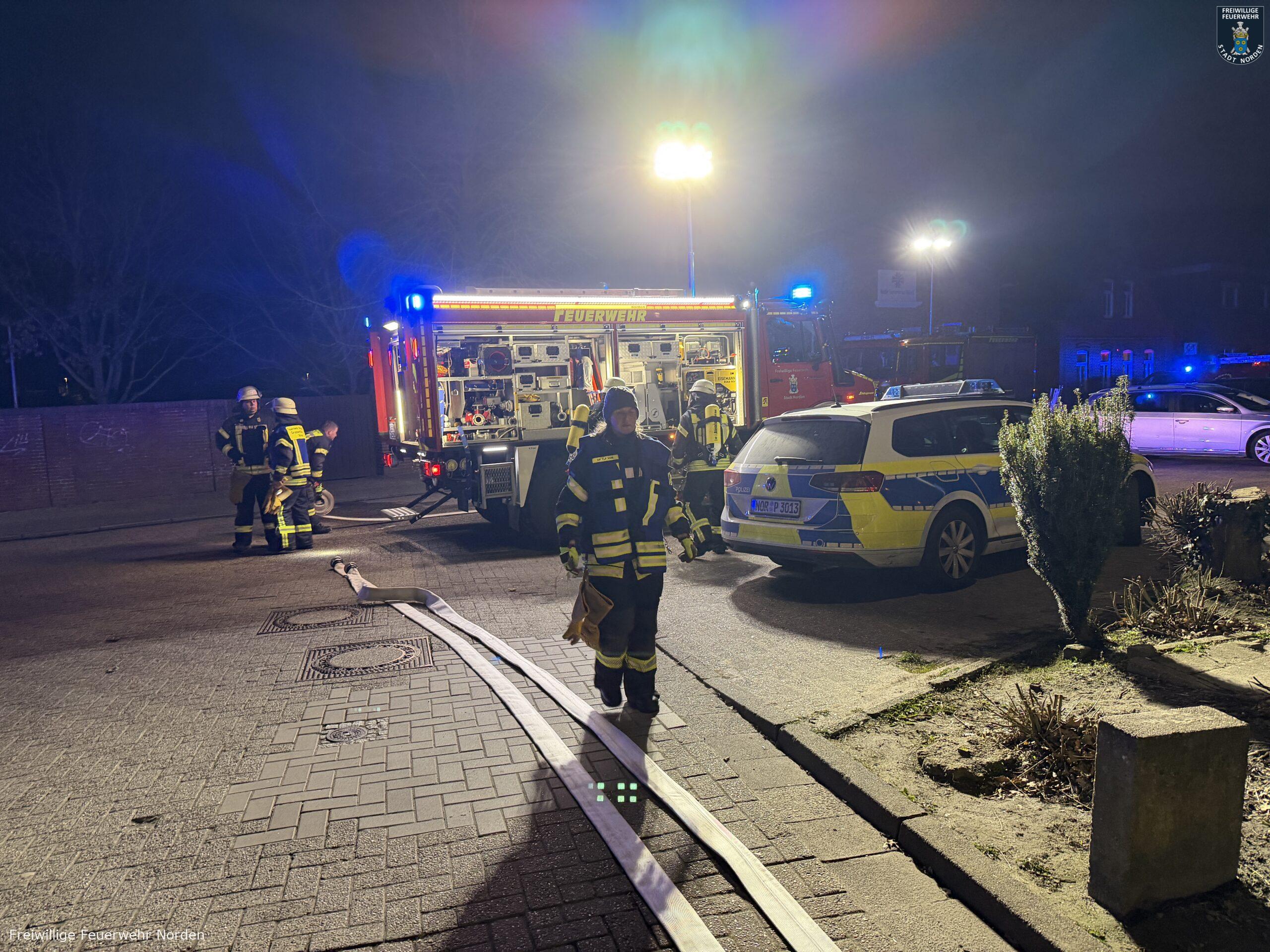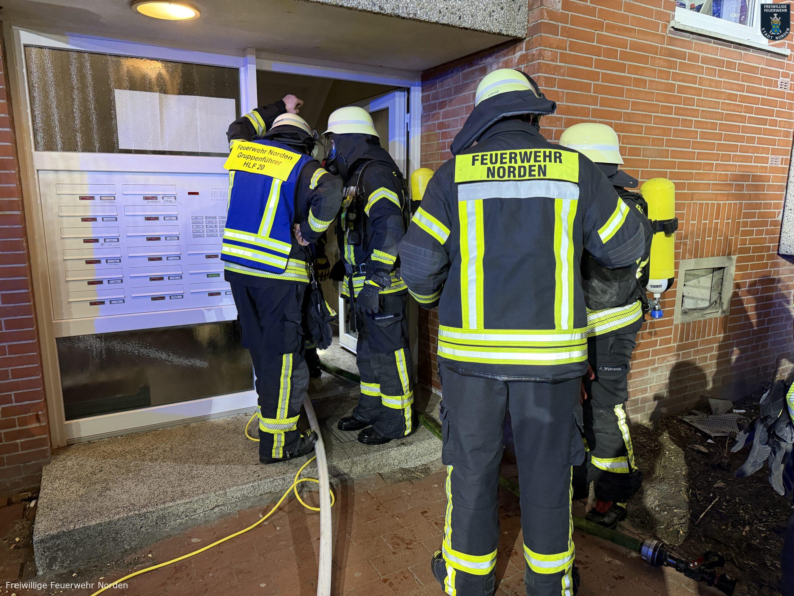 In Norden ist es am Sonntagabend in einem Mehrparteienhaus in der Kirchstraße zu einem Kellerbrand gekommen. Gegen 19.30 Uhr wurde von Anwohnern per Notruf Rauch gemeldet, der aus einem Kellerfenster drang. Die alarmierte Freiwillige Feuerwehr Norden konnte dies vor Ort bestätigen. Der Rauch breitete sich zudem im Keller und im Treppenhaus aus. Als erstes verschloss die Feuerwehr den Keller mit einem Rauchvorhang und begann das Treppenhaus mit einem Hochleistungslüfter zu entrauchen. Schnell war der Fluchtweg damit für die über 20 Hausbewohner wieder hergestellt. Feuerwehr und Polizei begannen dann sofort alle 15 Wohneinheiten zu evakuieren. Mit Hilfe der Einsatzkräfte wurden 15 Hausbewohner, darunter auch mehrere Kinder in Sicherheit gebracht. Sechs Bewohner flüchteten eigenständig.