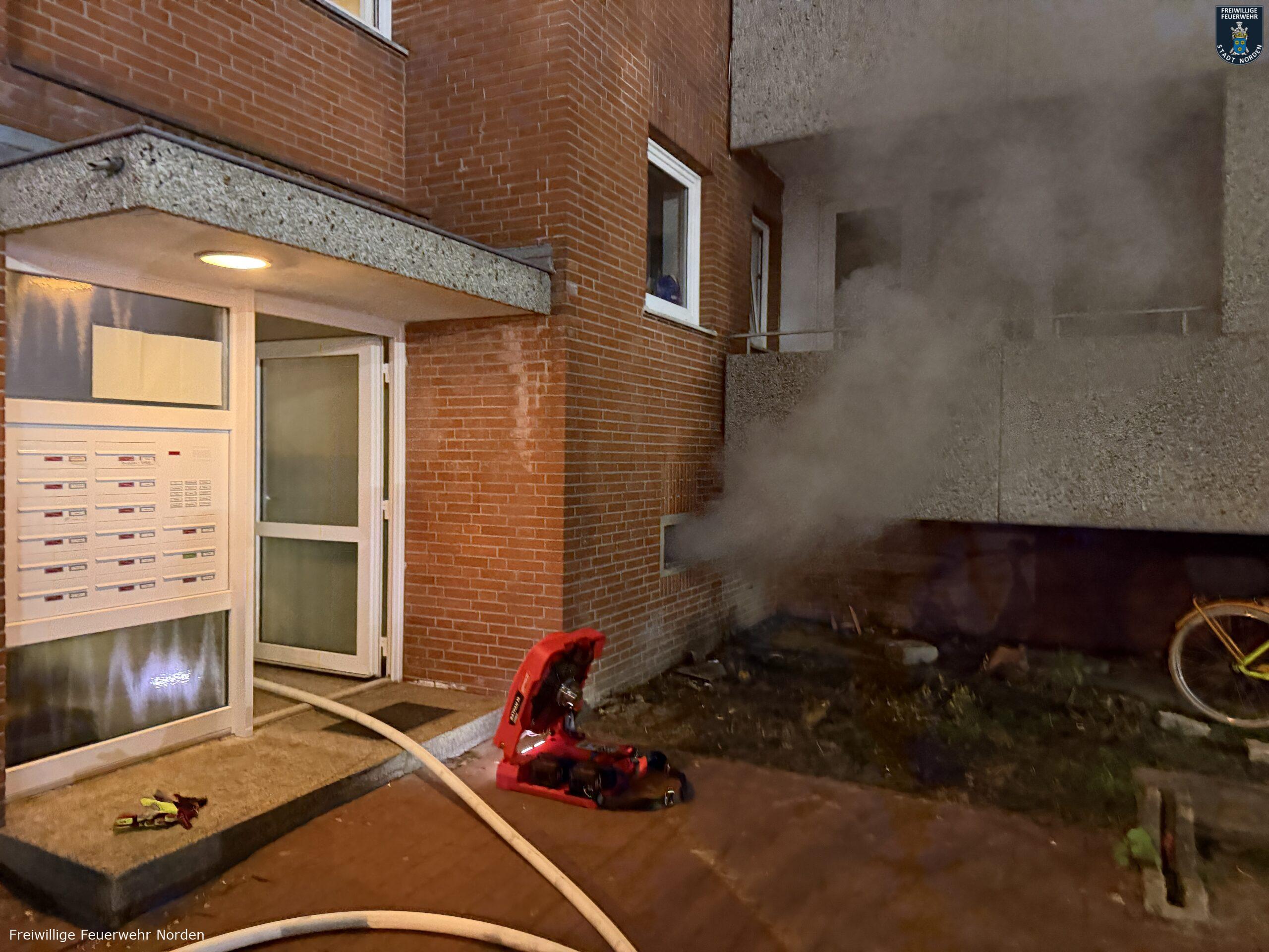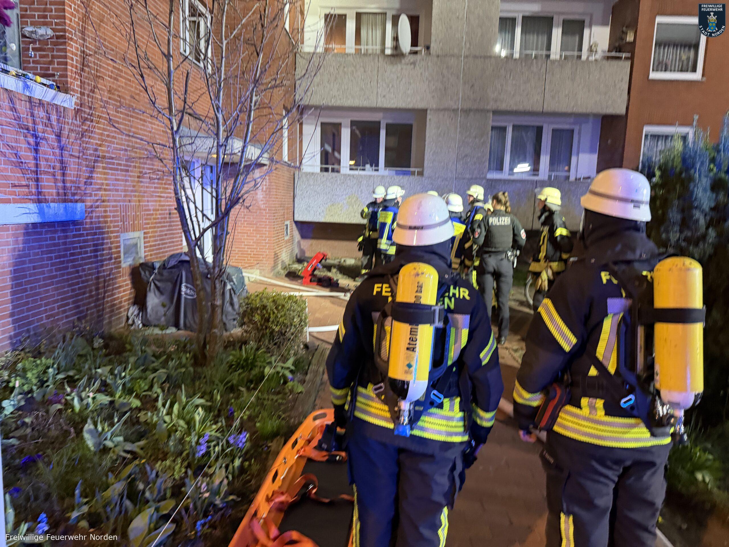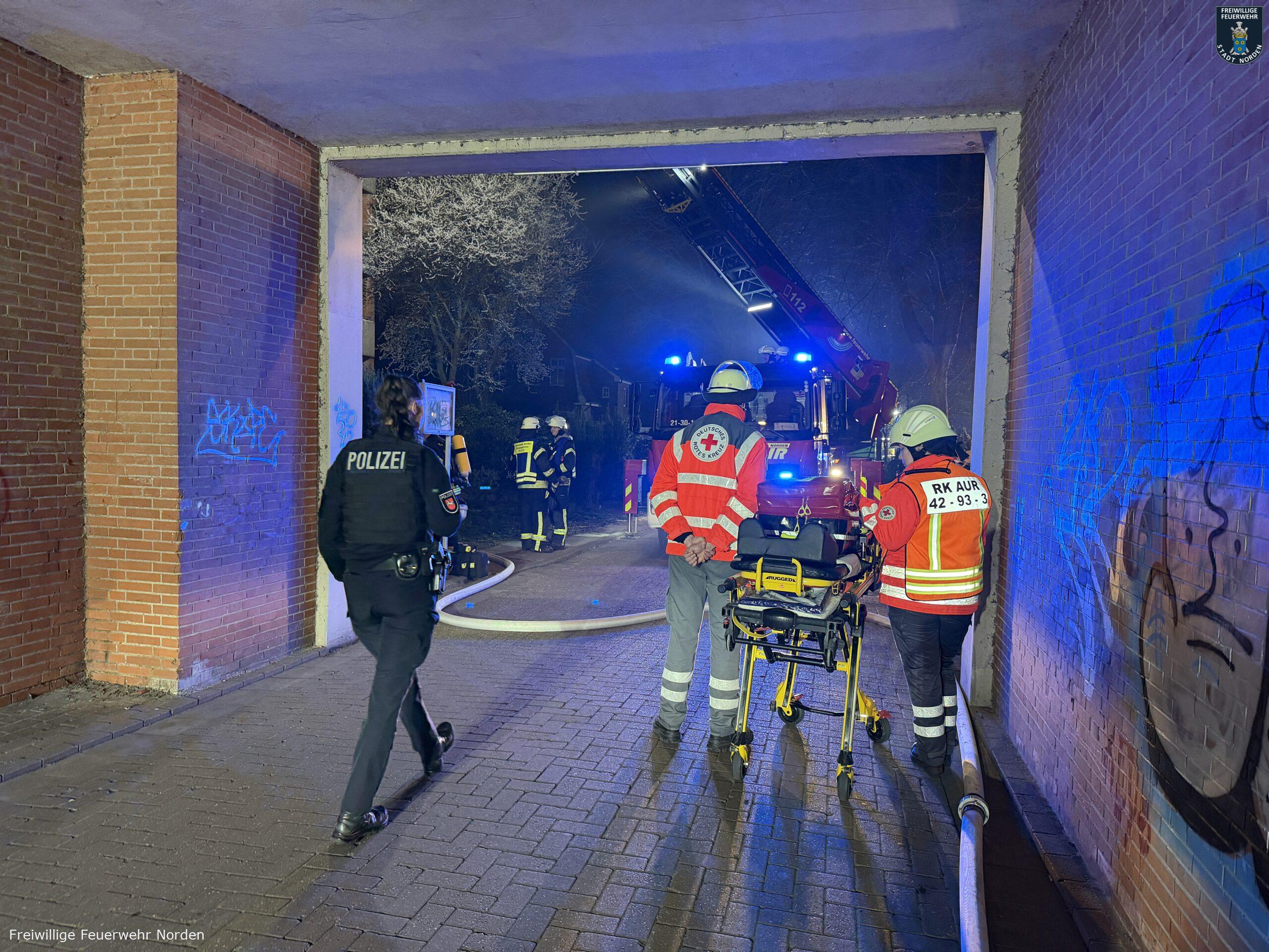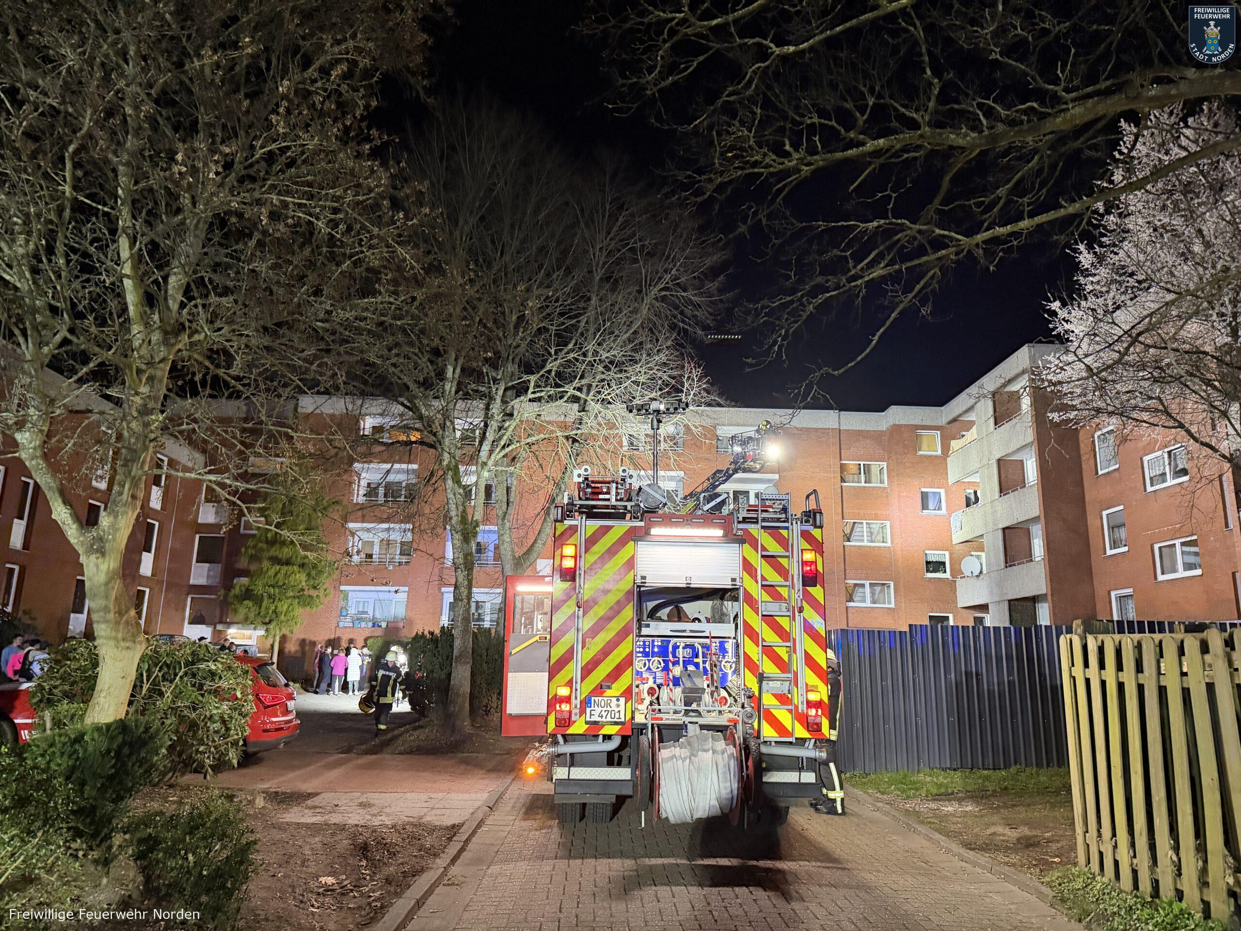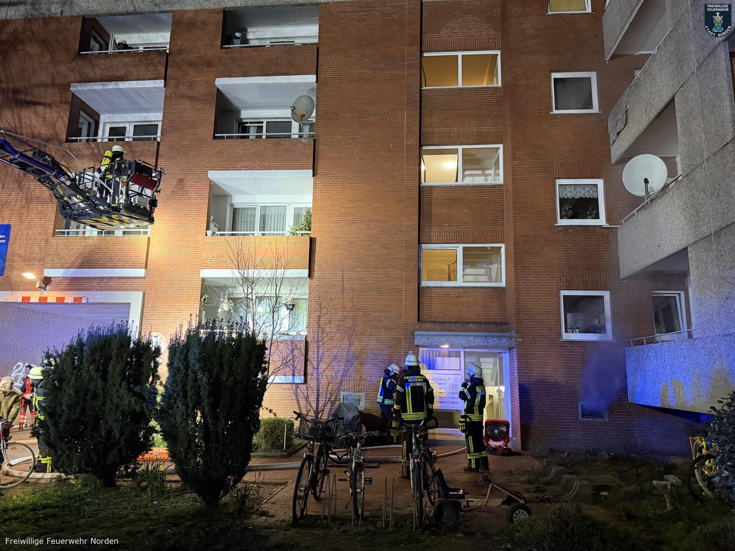 In Norden ist es am Sonntagabend in einem Mehrparteienhaus in der Kirchstraße zu einem Kellerbrand gekommen. Gegen 19.30 Uhr wurde von Anwohnern per Notruf Rauch gemeldet, der aus einem Kellerfenster drang. Die alarmierte Freiwillige Feuerwehr Norden konnte dies vor Ort bestätigen. Der Rauch breitete sich zudem im Keller und im Treppenhaus aus. Als erstes verschloss die Feuerwehr den Keller mit einem Rauchvorhang und begann das Treppenhaus mit einem Hochleistungslüfter zu entrauchen. Schnell war der Fluchtweg damit für die über 20 Hausbewohner wieder hergestellt. Feuerwehr und Polizei begannen dann sofort alle 15 Wohneinheiten zu evakuieren. Mit Hilfe der Einsatzkräfte wurden 15 Hausbewohner, darunter auch mehrere Kinder in Sicherheit gebracht. Sechs Bewohner flüchteten eigenständig.