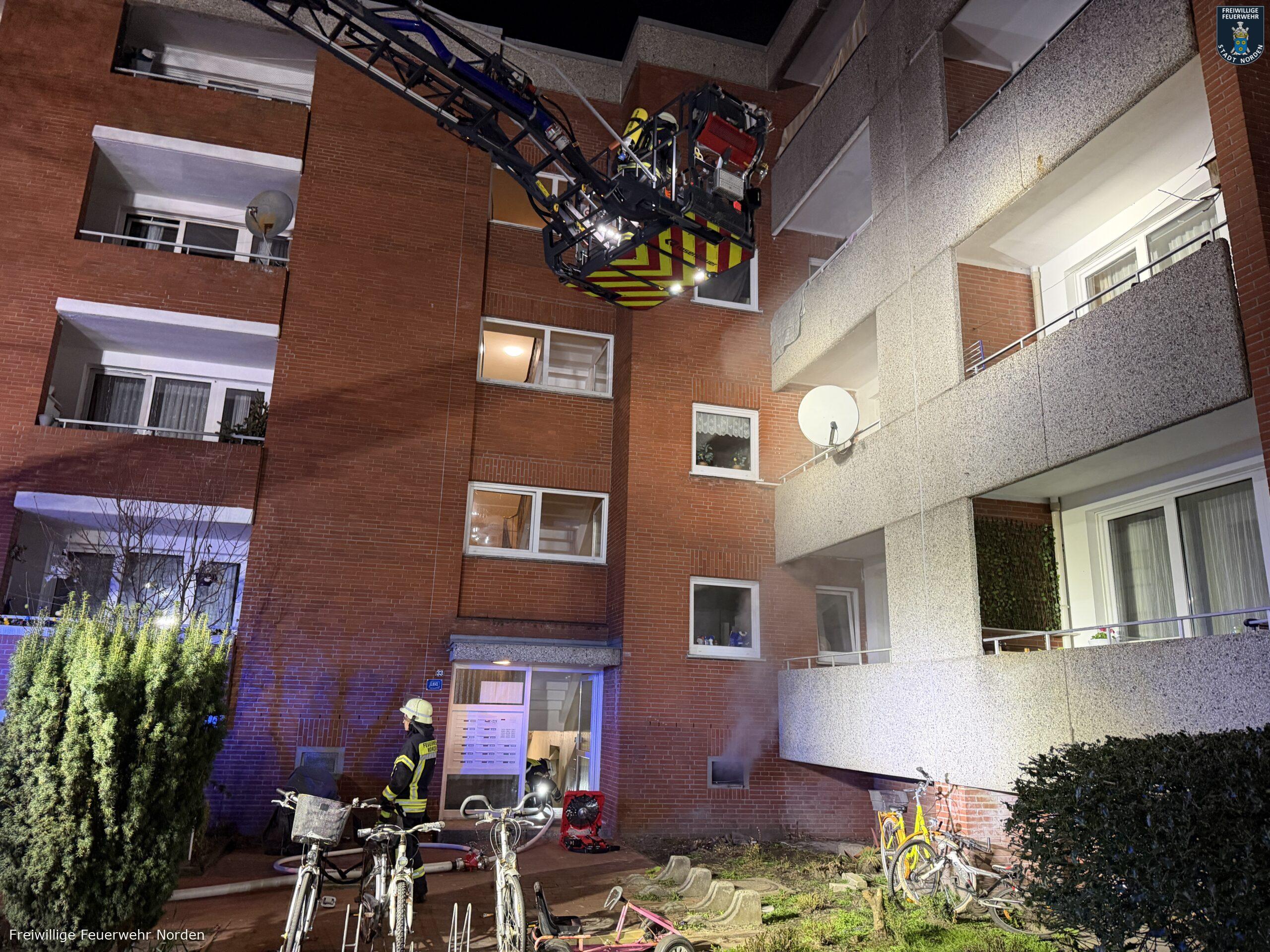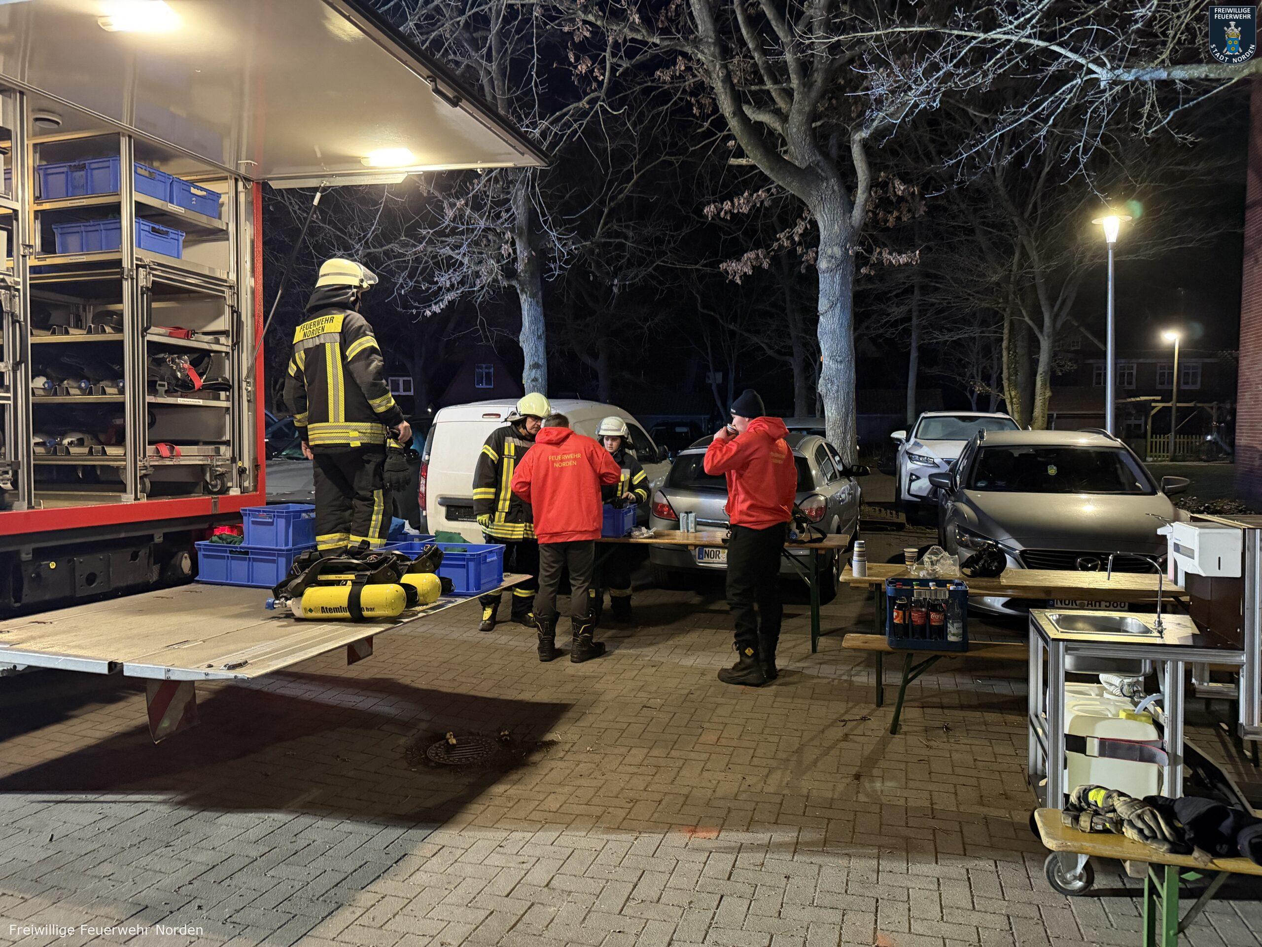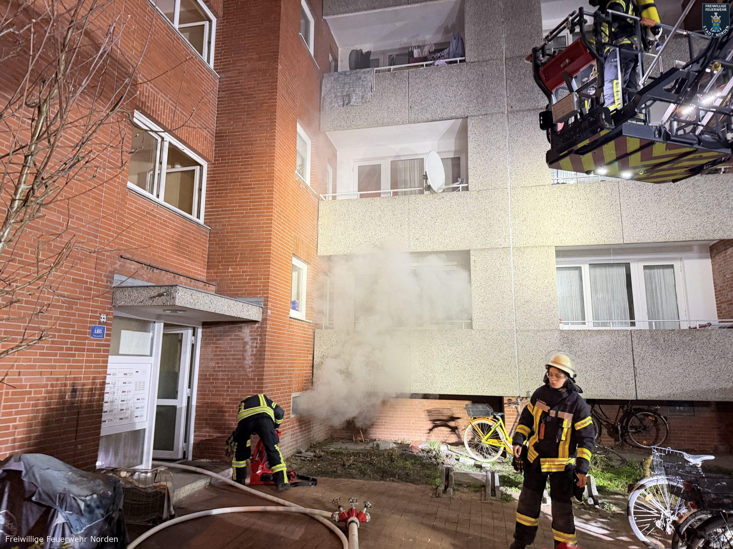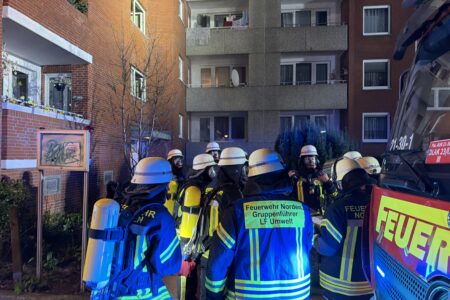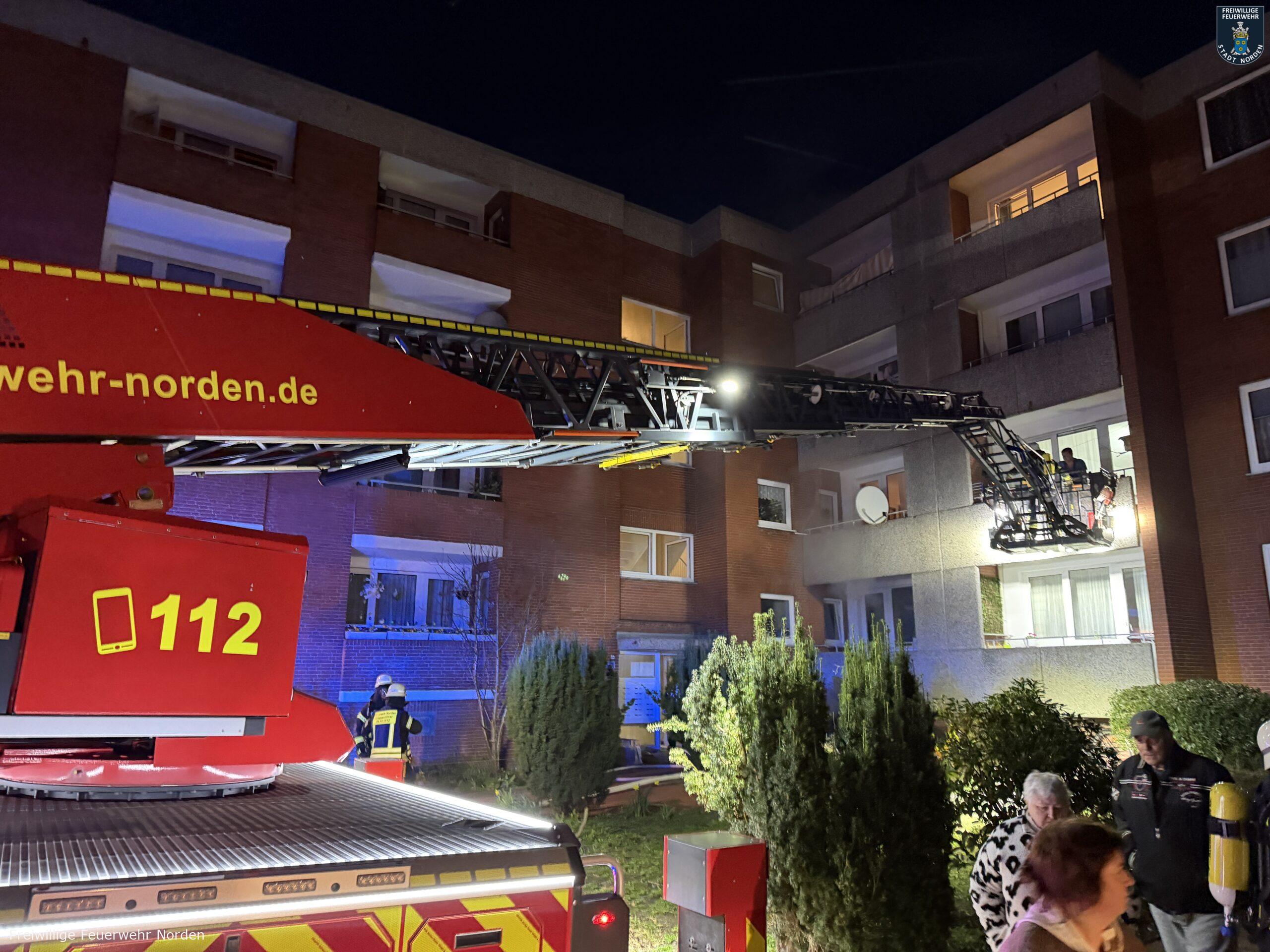 In Norden ist es am Sonntagabend in einem Mehrparteienhaus in der Kirchstraße zu einem Kellerbrand gekommen. Gegen 19.30 Uhr wurde von Anwohnern per Notruf Rauch gemeldet, der aus einem Kellerfenster drang. Die alarmierte Freiwillige Feuerwehr Norden konnte dies vor Ort bestätigen. Der Rauch breitete sich zudem im Keller und im Treppenhaus aus. Als erstes verschloss die Feuerwehr den Keller mit einem Rauchvorhang und begann das Treppenhaus mit einem Hochleistungslüfter zu entrauchen. Schnell war der Fluchtweg damit für die über 20 Hausbewohner wieder hergestellt. Feuerwehr und Polizei begannen dann sofort alle 15 Wohneinheiten zu evakuieren. Mit Hilfe der Einsatzkräfte wurden 15 Hausbewohner, darunter auch mehrere Kinder in Sicherheit gebracht. Sechs Bewohner flüchteten eigenständig.