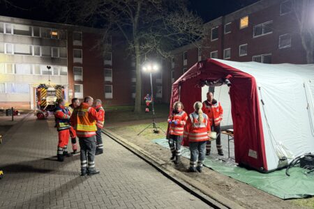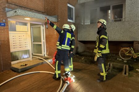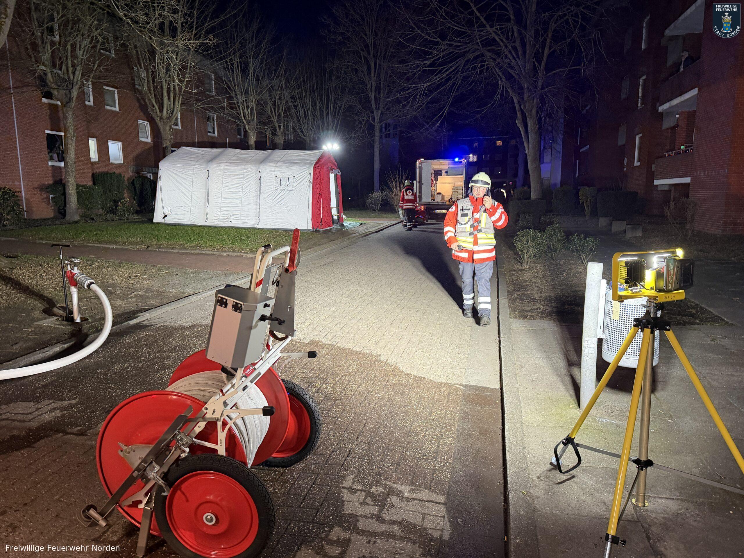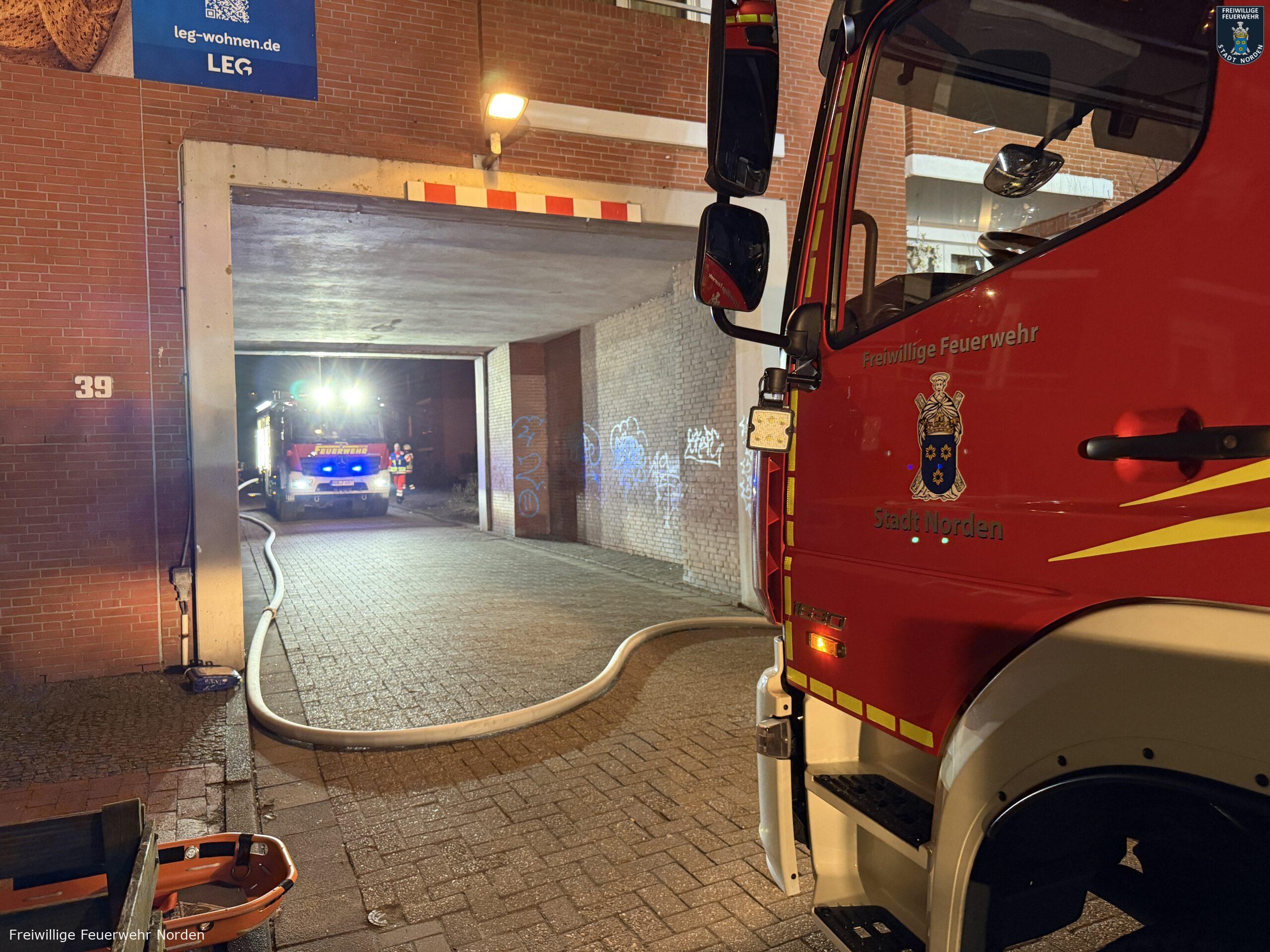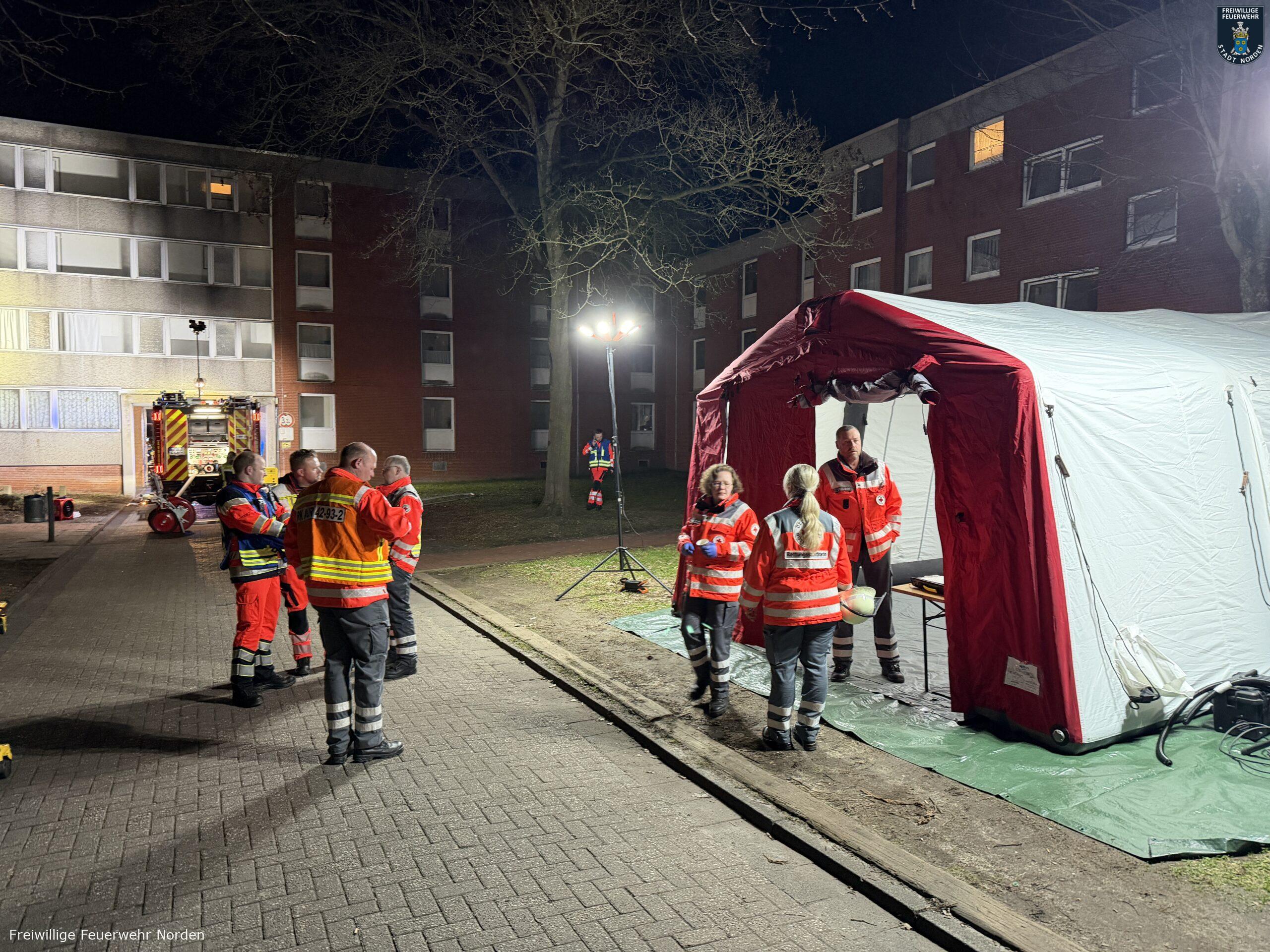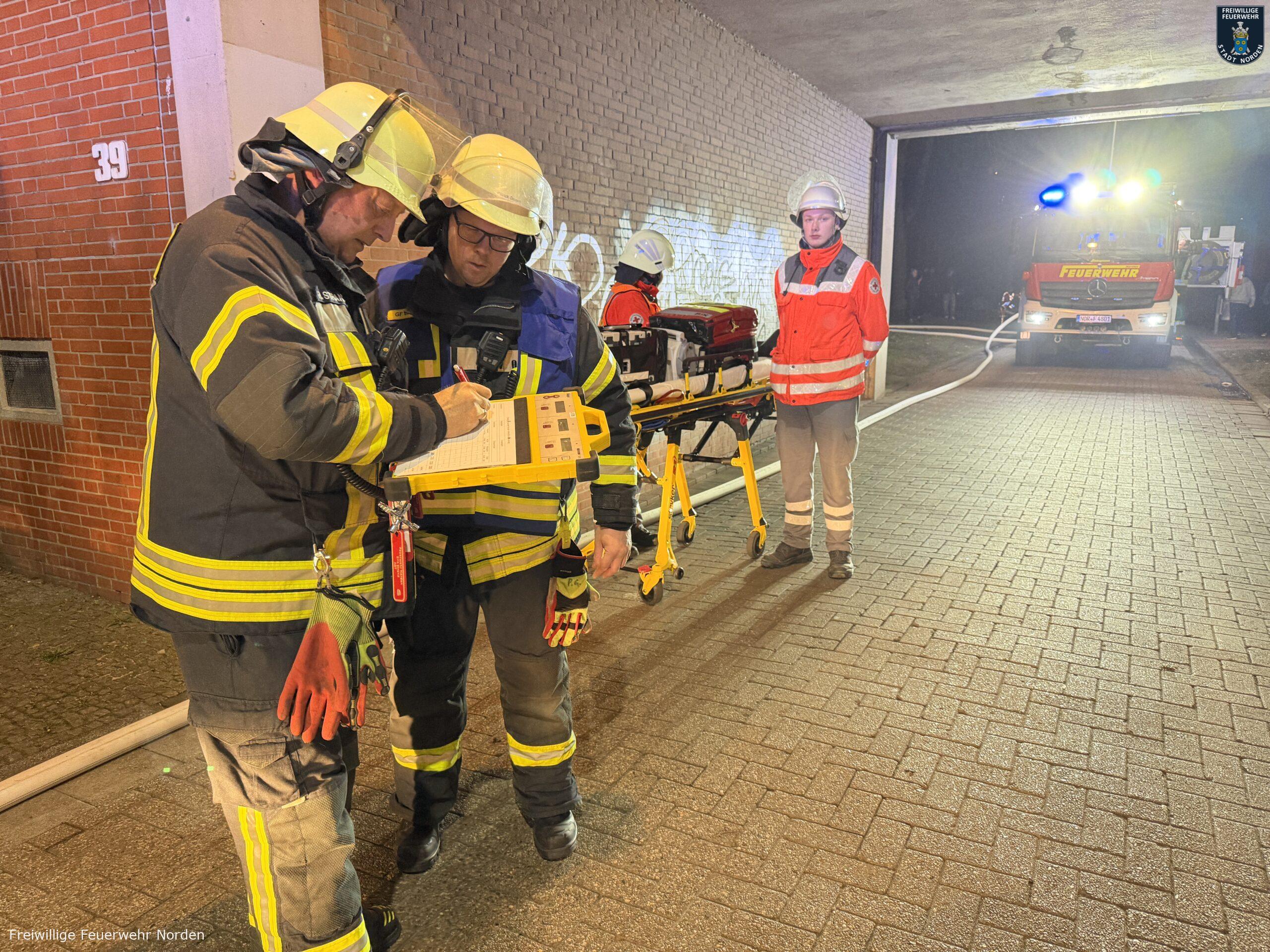 In Norden ist es am Sonntagabend in einem Mehrparteienhaus in der Kirchstraße zu einem Kellerbrand gekommen. Gegen 19.30 Uhr wurde von Anwohnern per Notruf Rauch gemeldet, der aus einem Kellerfenster drang. Die alarmierte Freiwillige Feuerwehr Norden konnte dies vor Ort bestätigen. Der Rauch breitete sich zudem im Keller und im Treppenhaus aus. Als erstes verschloss die Feuerwehr den Keller mit einem Rauchvorhang und begann das Treppenhaus mit einem Hochleistungslüfter zu entrauchen. Schnell war der Fluchtweg damit für die über 20 Hausbewohner wieder hergestellt. Feuerwehr und Polizei begannen dann sofort alle 15 Wohneinheiten zu evakuieren. Mit Hilfe der Einsatzkräfte wurden 15 Hausbewohner, darunter auch mehrere Kinder in Sicherheit gebracht. Sechs Bewohner flüchteten eigenständig.
