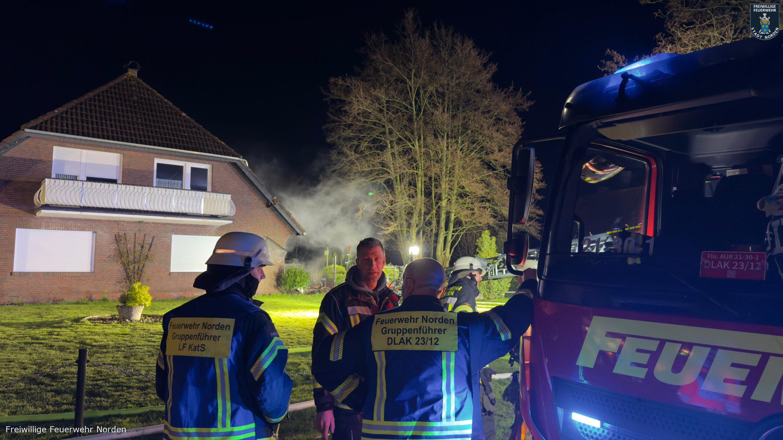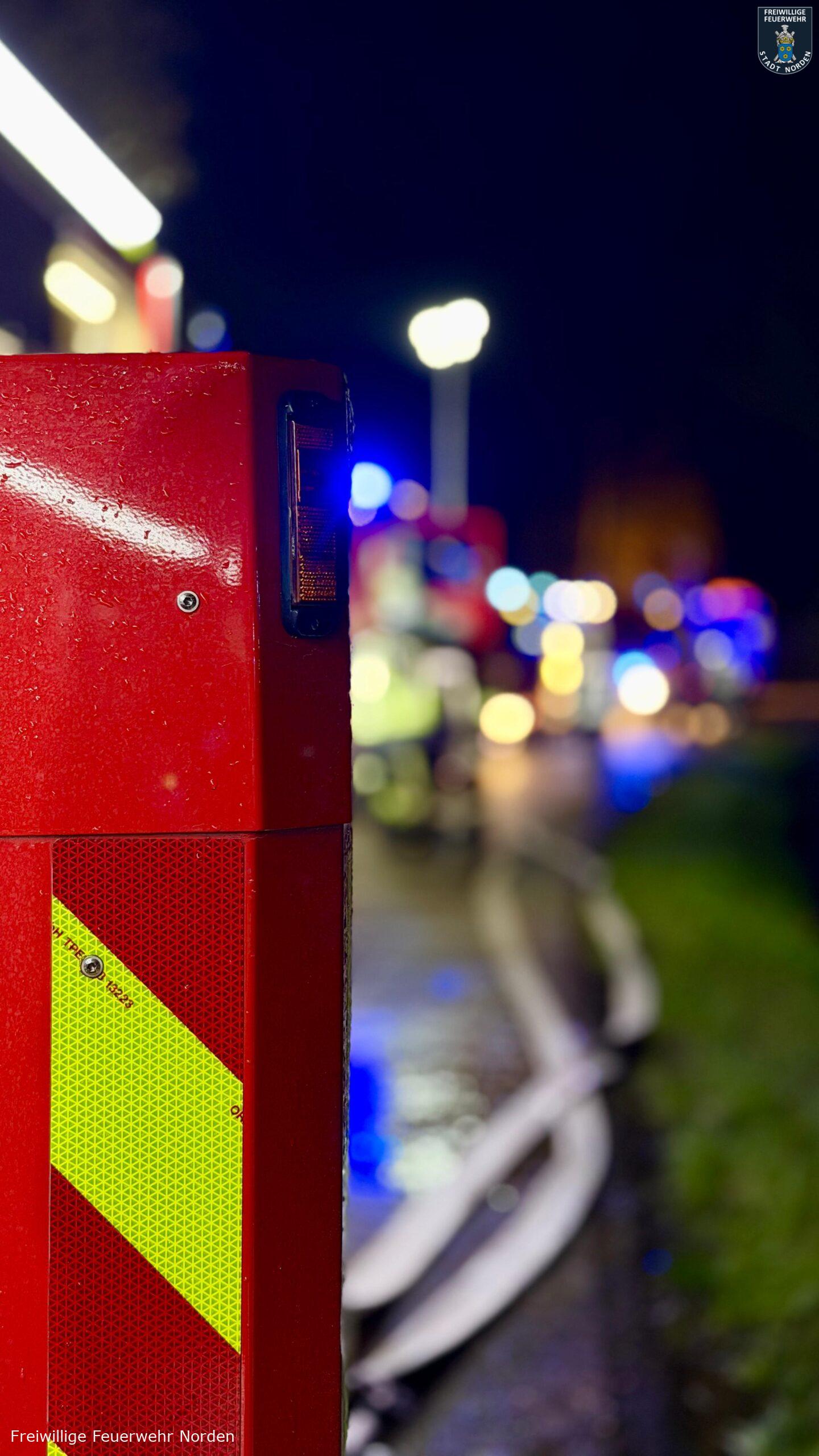Am Montagmorgen wurde die Freiwillige Feuerwehr Norden mit der Drehleiter und einem Löschfahrzeug sowie mit dem in Norden stationierten Einsatzleitwagen (ELW) 2 des Landkreises Aurich zur Unterstützung in die Gemeinde Großheide alarmiert. In der Bürgermeister-Oldewurtel-Straße im Ortsteil Menstede wurde zunächst ein Dachstuhlbrand mit noch vermuteten Personen im Gebäude gemeldet. Vor Ort konnte dann ein Feuer im Bereich der Terrasse eines Wohnhauses festgestellt werden welches auf ein Wohngebäude überzugreifen drohte. Beim Eintreffen der ersten Rettungskräfte hatten die Bewohner mit Hilfe von Nachbarn das Haus bereits verlassen, Verletzte gab es nicht. Neben der Freiwilligen Feuerwehr Norden waren die Freiwilligen Feuerwehren der Gemeinde Großheide, die Freiwillige Feuerwehr Westerholt (Landkreis Wittmund) sowie die Polizei, der Deutsche Rote Kreuz und der Rettungsdienst des Landkreises Aurich mit Notarzt im Einsatz.