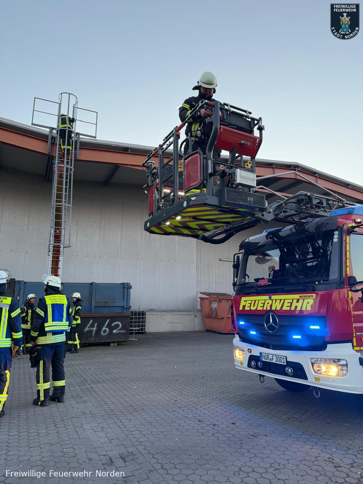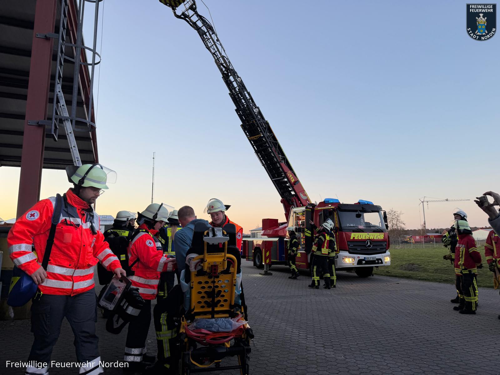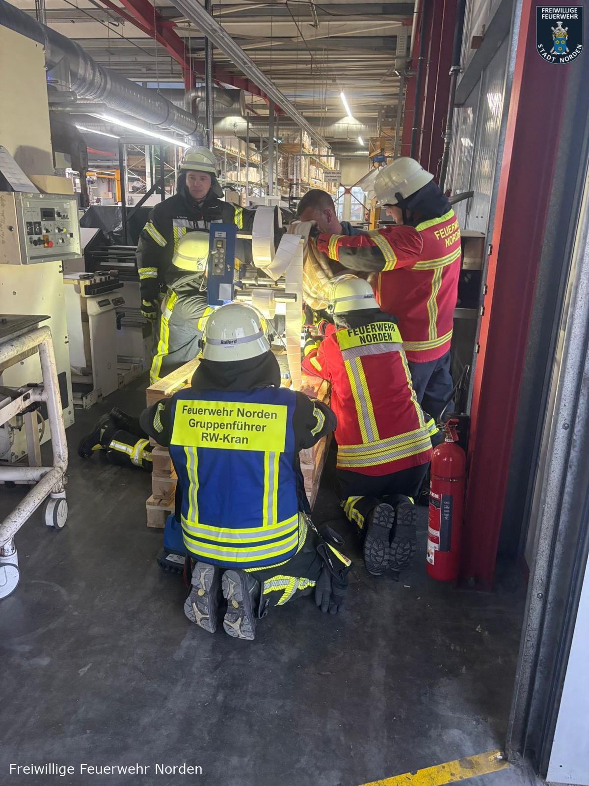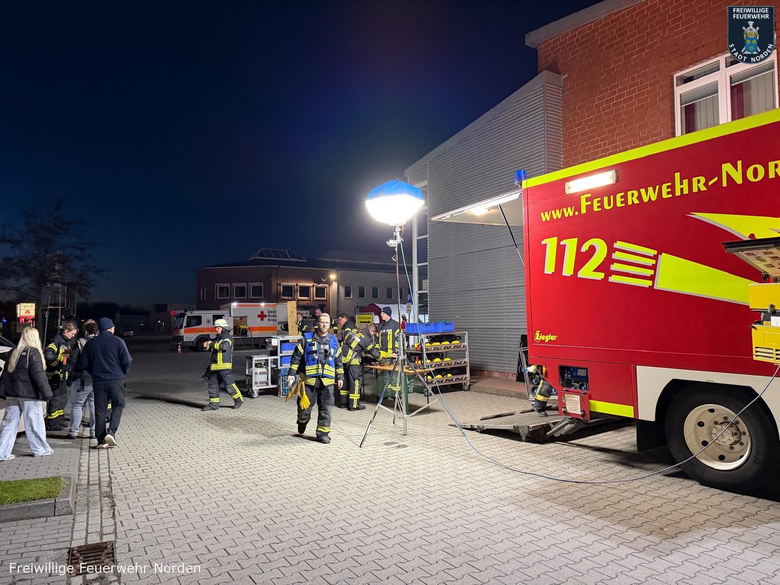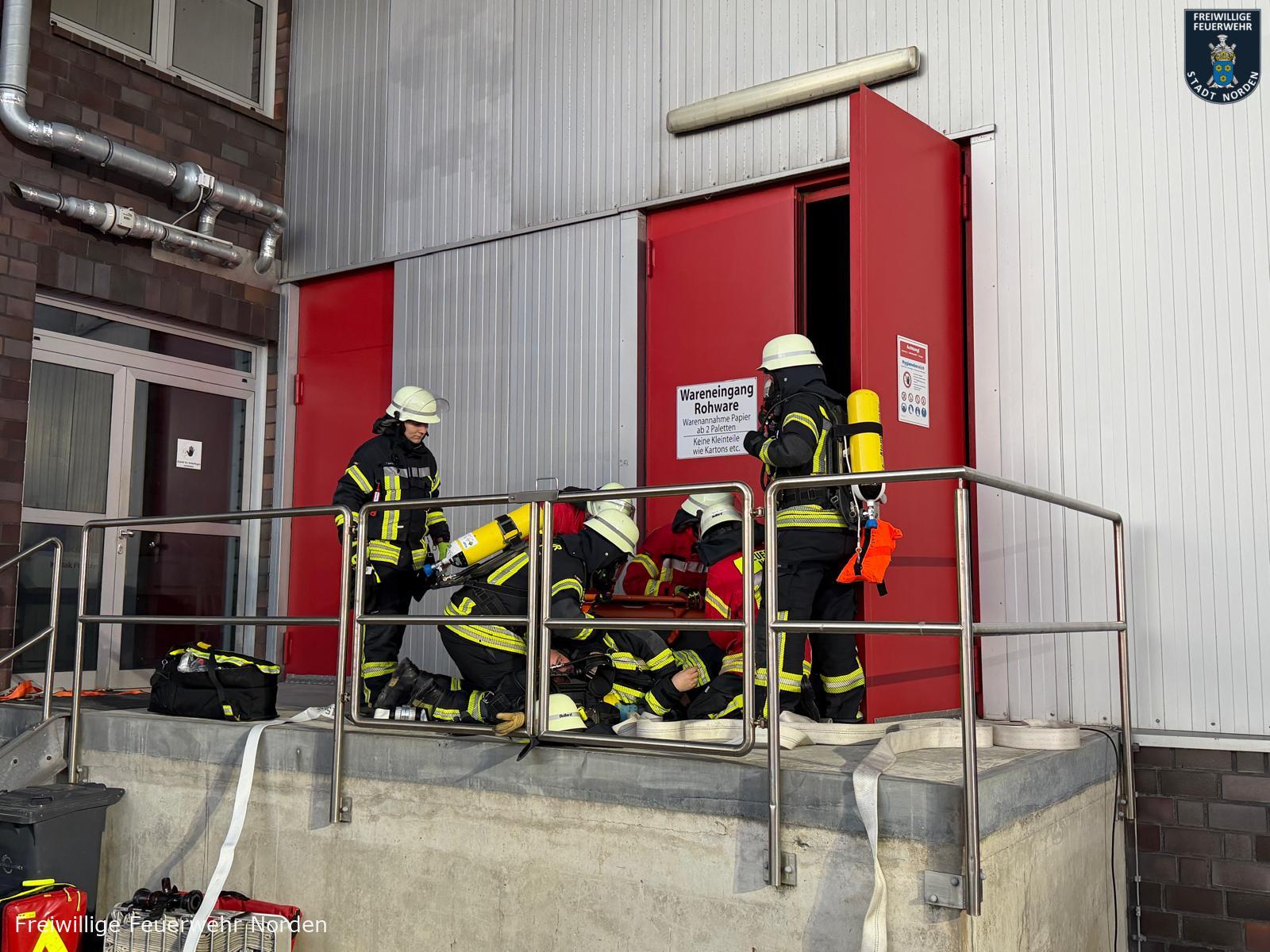 Einsatzleiter Ralf Scharfenort hatte es mit mehreren Szenarien gleichzeitig zu tun. Zunächst meldete die automatische Brandmeldeanlage des Objektes ein Feuer. Vor Ort konnte ein Feuer in einem Lager für Rohware festgestellt werden. Löschmaßnahmen durch Mitarbeiter bleiben zunächst ohne Wirkung, daraufhin wird das Gebäude evakuiert, zwei Mitarbeiter werden vermisst. Umgehend wurde Vollalarm für die gesamte Freiwillige Feuerwehr Norden sowie das Deutsche Rote Kreuz (DRK) ausgelöst. Zum Zeitpunkt des Brandausbruchs befinden sich noch zwei Handwerker auf dem Dach im rückwärtigen Teil des Gebäudes. Ein Mitarbeiter wird mit einer Hand in einer Druckmaschine eingeklemmt. Eine Löschwasserversorgung muss zunächst im Pendelverkehr sichergestellt und dann aus einem offenen Gewässer vom Südring aufgebaut werden. Das für die Brandbekämpfung im Lager verwendete Löschwasser läuft kontaminiert mit Farbe aus dem nördlichen Teil des Gebäudes in einen Graben.