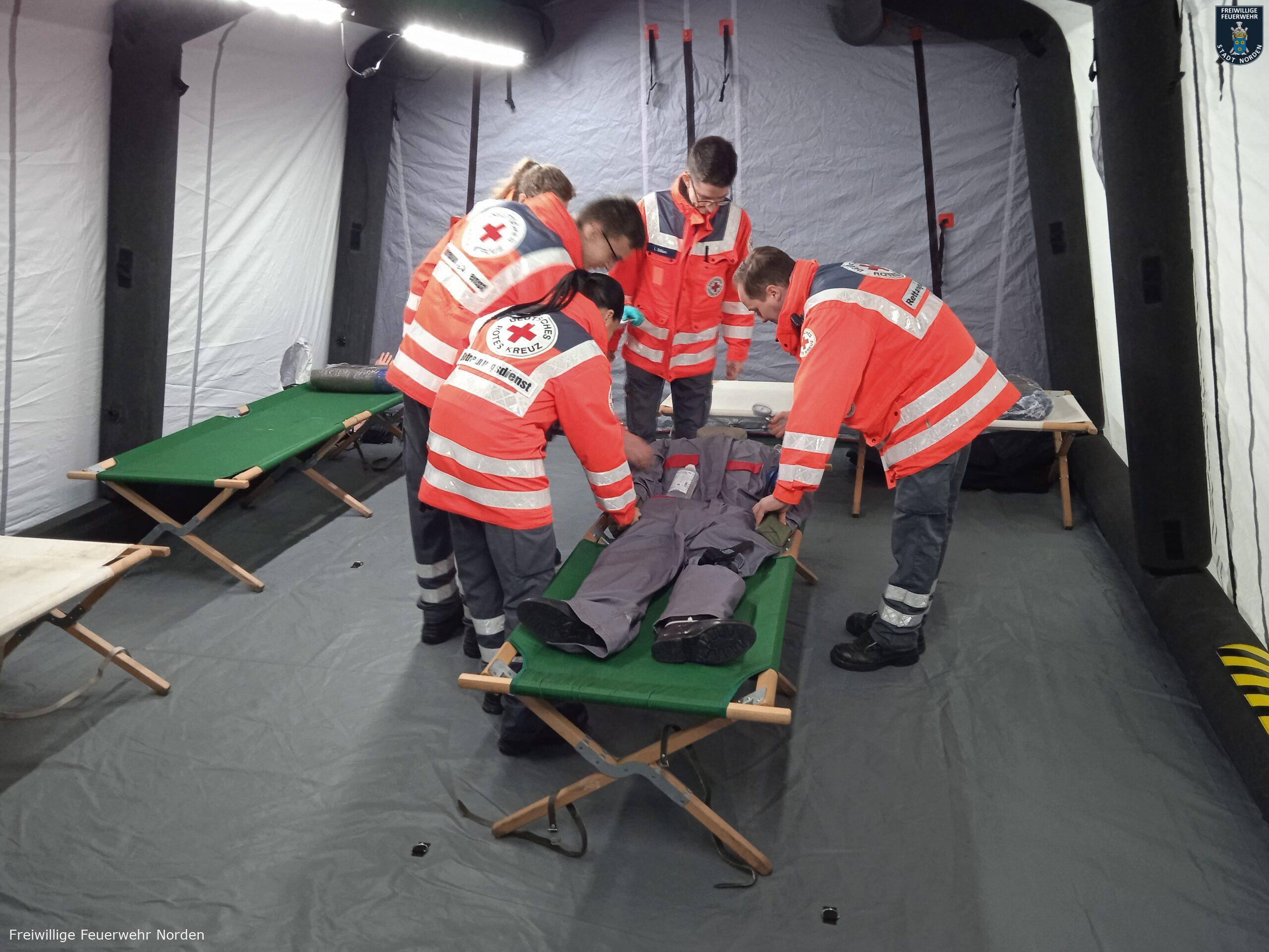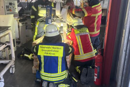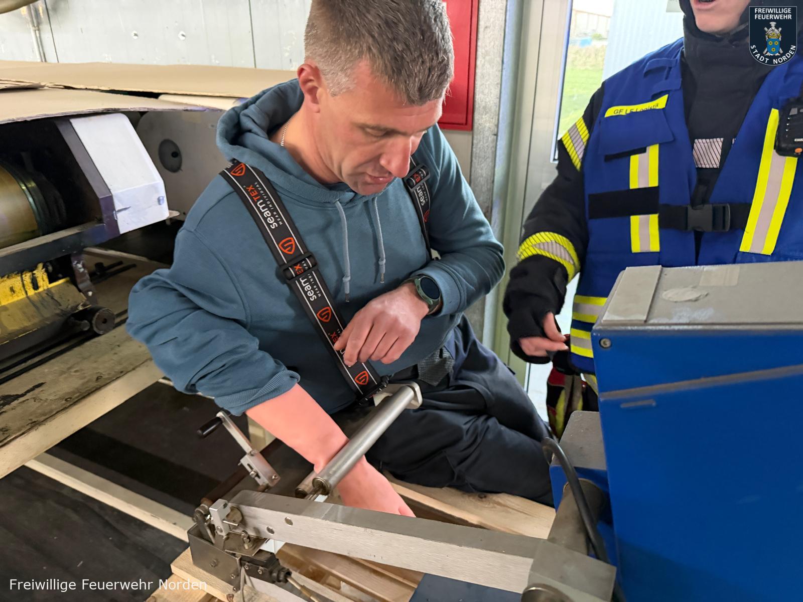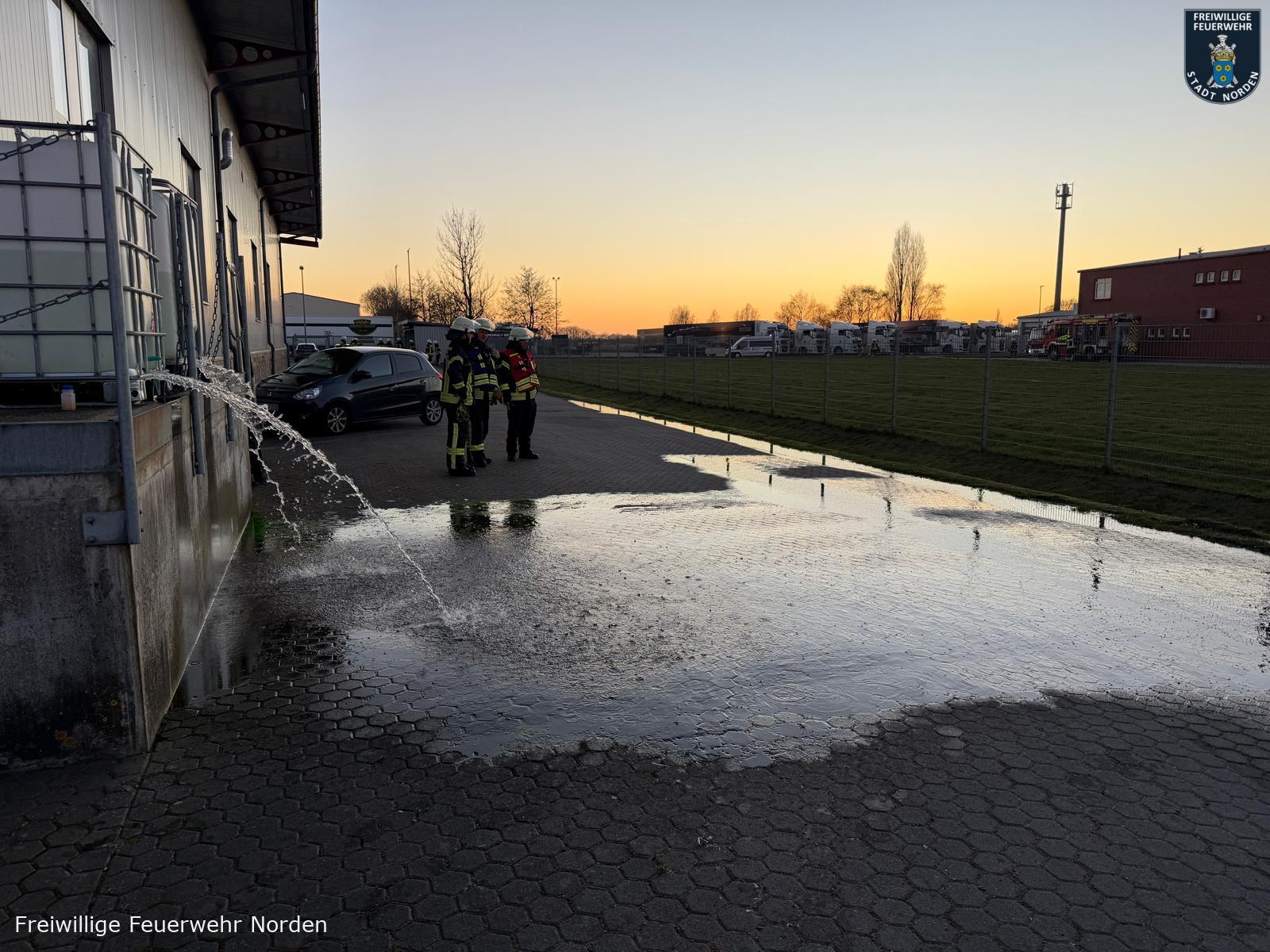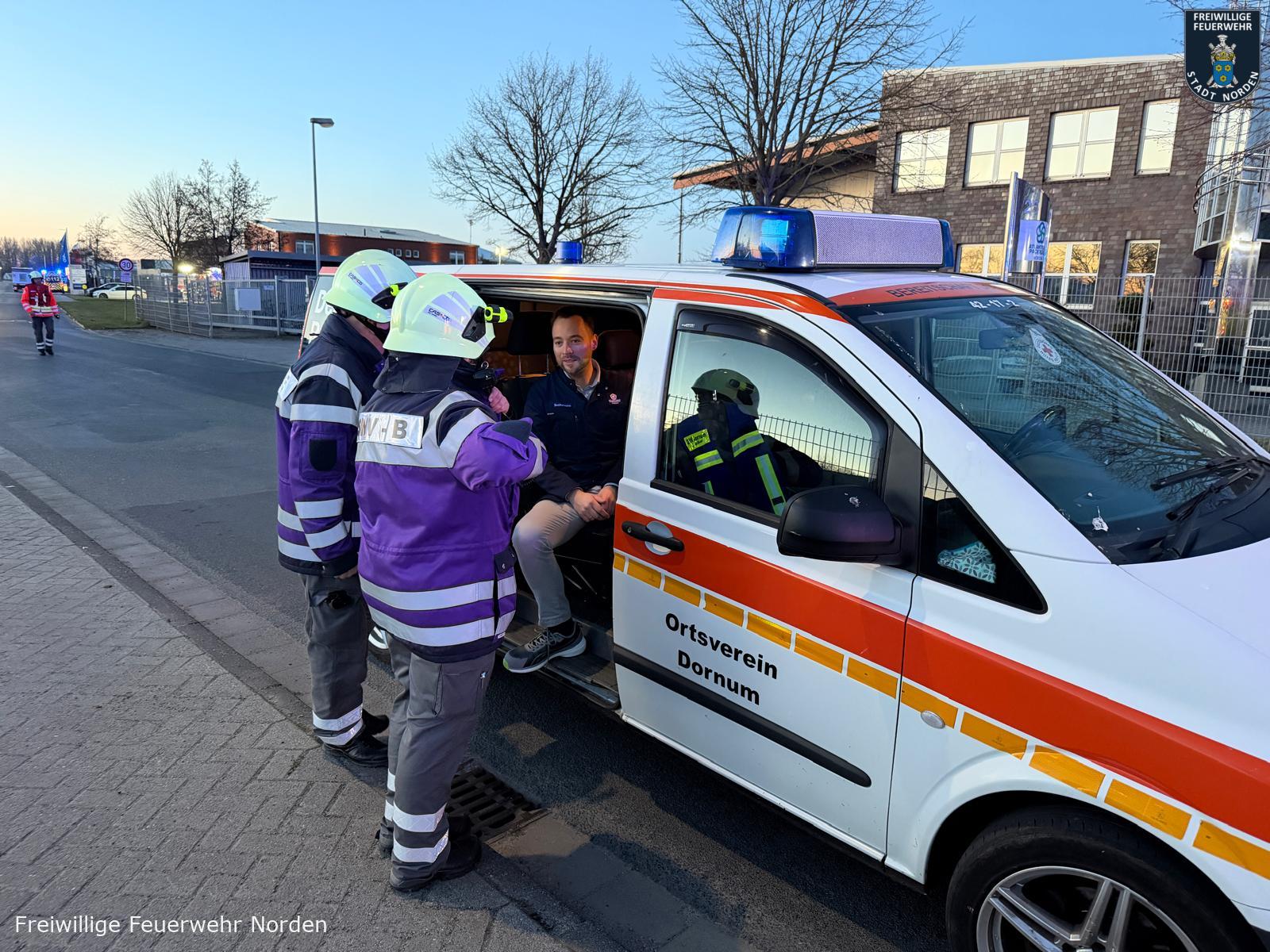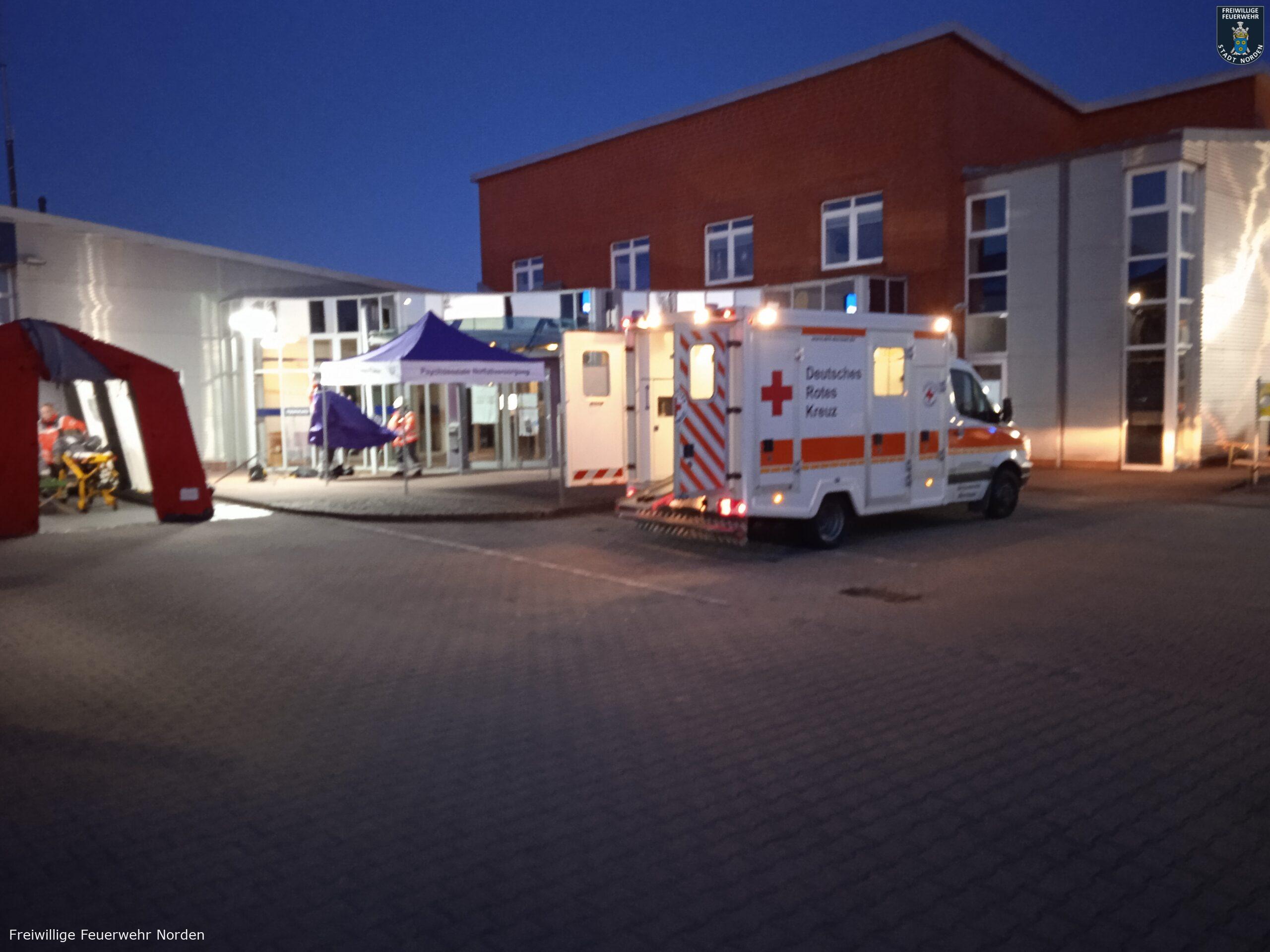 Einsatzleiter Ralf Scharfenort hatte es mit mehreren Szenarien gleichzeitig zu tun. Zunächst meldete die automatische Brandmeldeanlage des Objektes ein Feuer. Vor Ort konnte ein Feuer in einem Lager für Rohware festgestellt werden. Löschmaßnahmen durch Mitarbeiter bleiben zunächst ohne Wirkung, daraufhin wird das Gebäude evakuiert, zwei Mitarbeiter werden vermisst. Umgehend wurde Vollalarm für die gesamte Freiwillige Feuerwehr Norden sowie das Deutsche Rote Kreuz (DRK) ausgelöst. Zum Zeitpunkt des Brandausbruchs befinden sich noch zwei Handwerker auf dem Dach im rückwärtigen Teil des Gebäudes. Ein Mitarbeiter wird mit einer Hand in einer Druckmaschine eingeklemmt. Eine Löschwasserversorgung muss zunächst im Pendelverkehr sichergestellt und dann aus einem offenen Gewässer vom Südring aufgebaut werden. Das für die Brandbekämpfung im Lager verwendete Löschwasser läuft kontaminiert mit Farbe aus dem nördlichen Teil des Gebäudes in einen Graben.