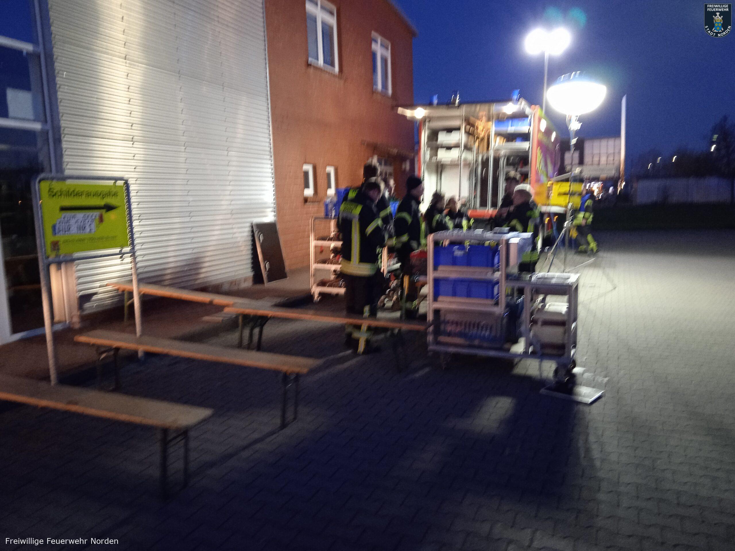 Ebenfalls auf dem Gelände der Zulassungsstelle wurde von der Norder Wehr die Einsatzleitung und eine Atemschutzsammelstelle eingerichtet sowie von dort aus die Einsatzstelle mit einer Drohne beflogen.