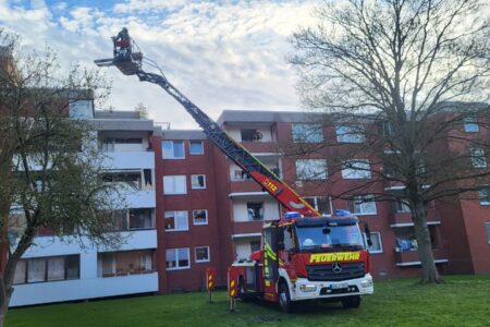 Eine akut erkrankte Frau musste am Donnerstagmorgen mit der Drehleiter der Norder Feuerwehr aus einem Wohnblock in der Kirchstraße in Norden gerettet werden. Der Rettungsdienst behandelte die Patientin in ihrer Wohnung im vierten Obergeschoss. Um die Frau möglichst schonend aus dem Haus zum Rettungswagen auf der Straße zu transportieren, entschied man sich für den Einsatz der Drehleiter. Hand in Hand arbeiteten Feuerwehr und Rettungsdienst hierbei zusammen. Nach einer halben Stunde war die Erkrankte auf dem Weg in ein Krankenhaus.