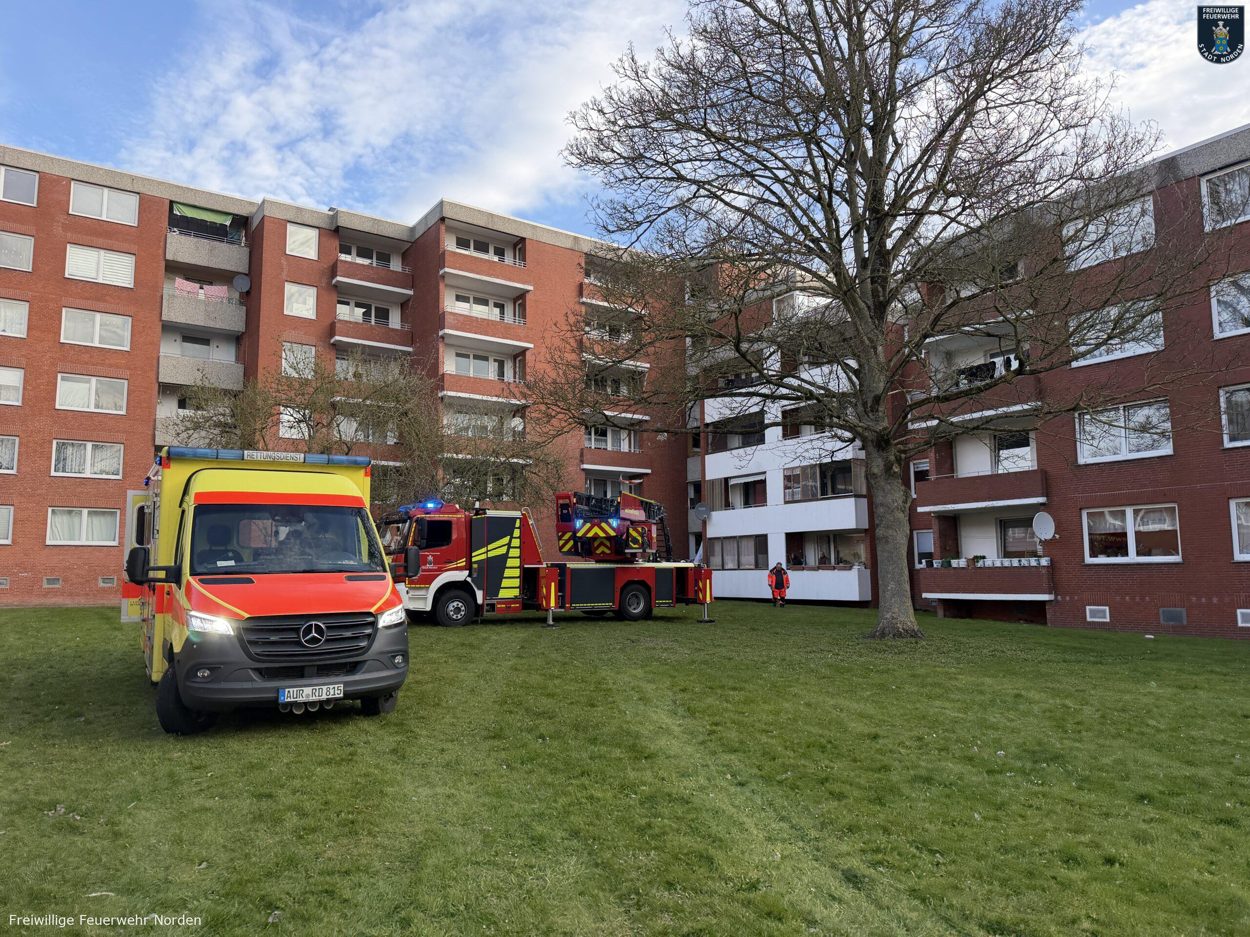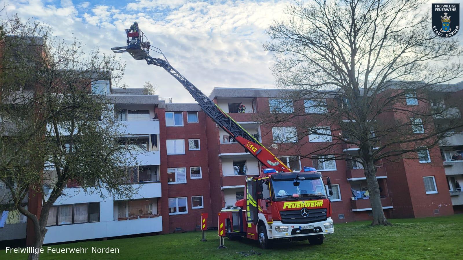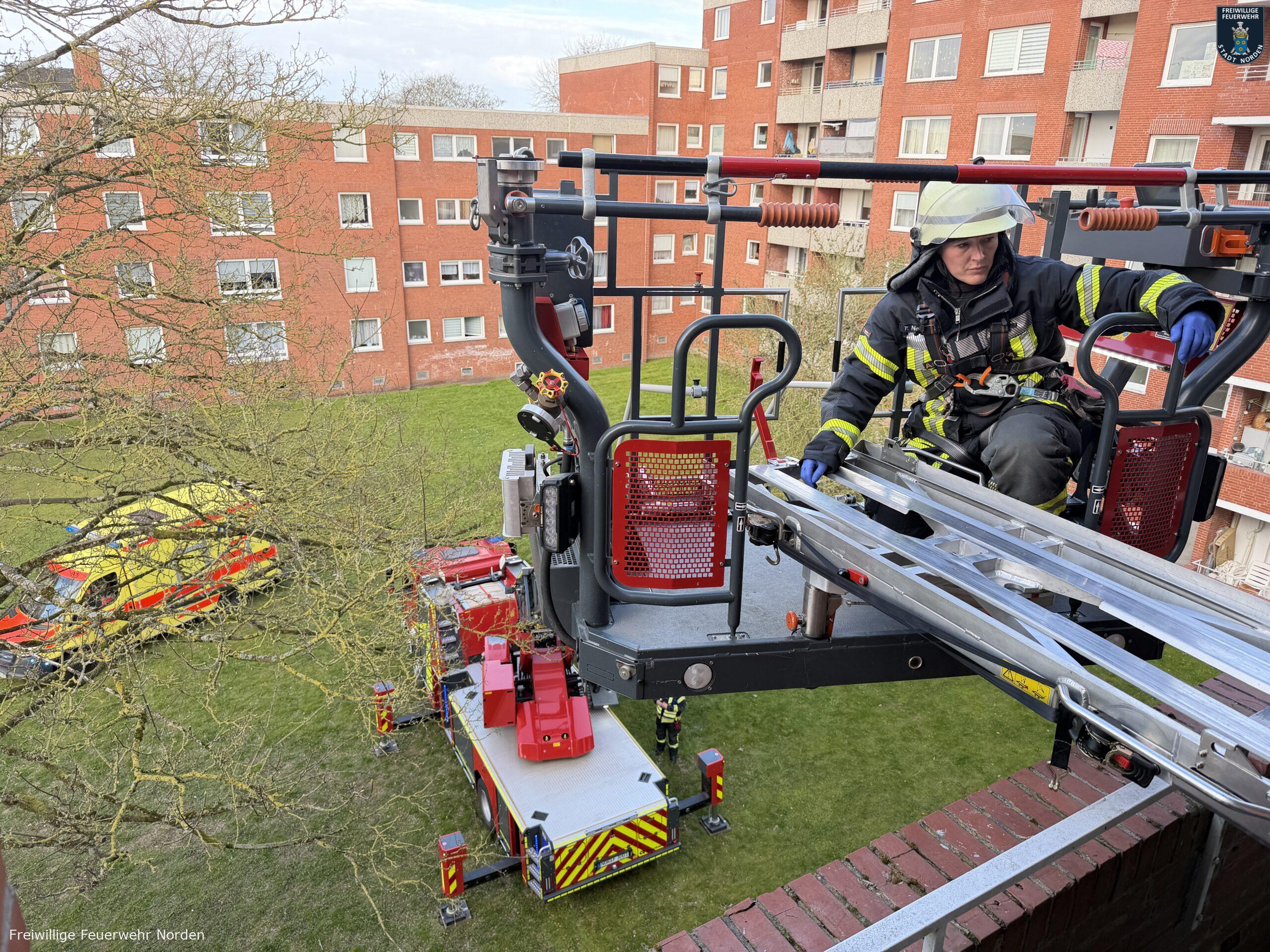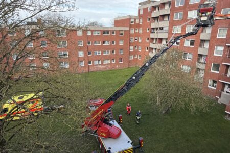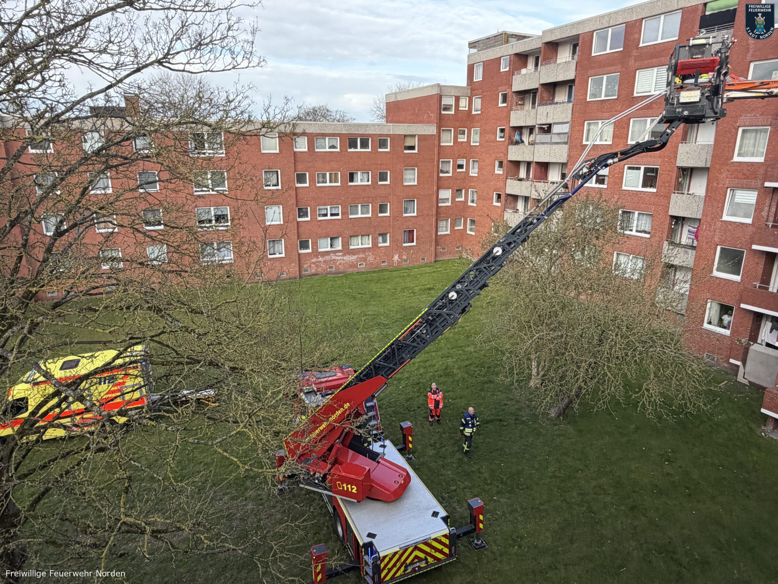 Eine akut erkrankte Frau musste am Donnerstagmorgen mit der Drehleiter der Norder Feuerwehr aus einem Wohnblock in der Kirchstraße in Norden gerettet werden. Der Rettungsdienst behandelte die Patientin in ihrer Wohnung im vierten Obergeschoss. Um die Frau möglichst schonend aus dem Haus zum Rettungswagen auf der Straße zu transportieren, entschied man sich für den Einsatz der Drehleiter. Hand in Hand arbeiteten Feuerwehr und Rettungsdienst hierbei zusammen. Nach einer halben Stunde war die Erkrankte auf dem Weg in ein Krankenhaus.