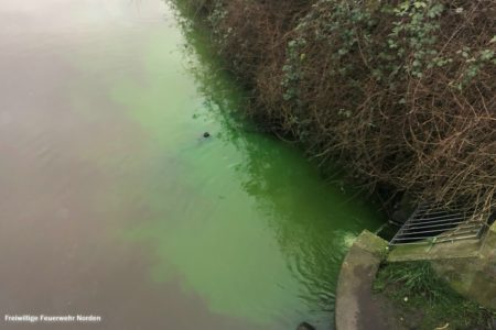 Aufregung am Dienstagnachmittag am Galgentief in Norden. Angler hatten gegen 16.30 Uhr beobachtet, wie aus einem großen Regenwasserrohr eine giftgrüne Flüssigkeit in den Kanal lief. Von der Straßenbrücke in der Straße Im Horst war eine deutlich sichtbare Ausbreitung der Farbe zu erkennen. Die besorgten Angler gingen von Umweltverschmutzung aus und informierten die Polizei, welche dann mehr
