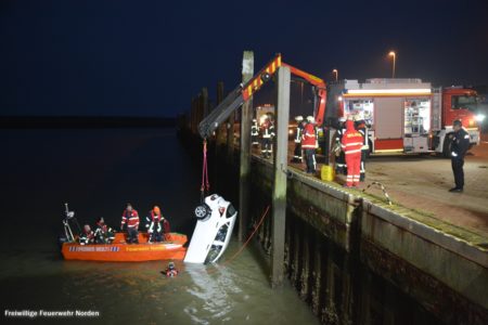 Ein Kleinwagen ist Sonnabendnachmittag in das Hafenbecken des Norddeicher Osthafens gerollt und darin versunken. Die Freiwillige Feuerwehr Norden sowie die Deutsche Lebens-Rettungs-Gesellschaft (DLRG) Ortsgruppe Norden rückten um 16.30 Uhr zur Bergung aus. Die Besitzerin des Pkw hatte den Wagen zunächst im Hafen geparkt, um dort spazieren zu gehen. Offenbar hatte sie den Wagen nicht ausreichend mehr