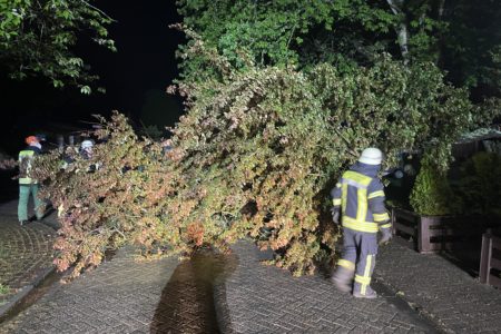 Zu einer Baumbeseitigung ist die Freiwillige Feuerwehr Norden in der Nacht zu Dienstag in den Evensweg ausgerückt. Zuvor war ein kurzer Gewitterschauer über die Stadt gezogen. Dabei brach ein morschen Baum auseinander und fiel auf die Straße. Die Feuerwehrleute konnten das rund zehn Meter lange Kronenteil bei Seite ziehen und auf einem Grundstück ablegen. Die mehr