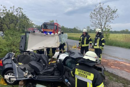 Zwei Volkswagen sind am Donnerstagnachmittag auf der Wurzeldeicher Straße in Norden frontal zusammengestoßen. Die Unfallstelle befand sich in einer leichten Kurve in Höhe des Ortsschildes. Während der Fahrer eines Golf Variant sich selbst leichtverletzt aus seinem Wagen befreien konnte, wurden die Insassen der entgegenkommenden Golf Limousine schwer verletzt und mussten von der Freiwillige Feuerwehr Norden mehr